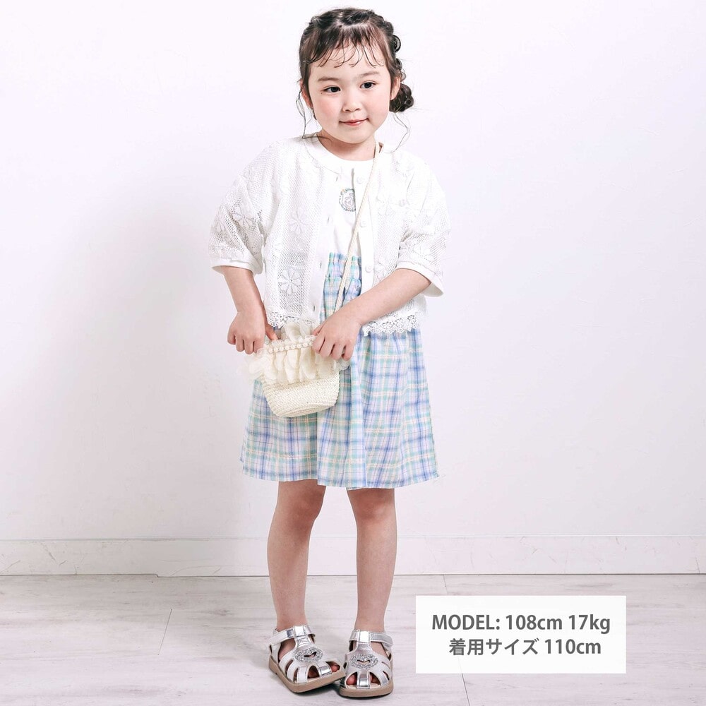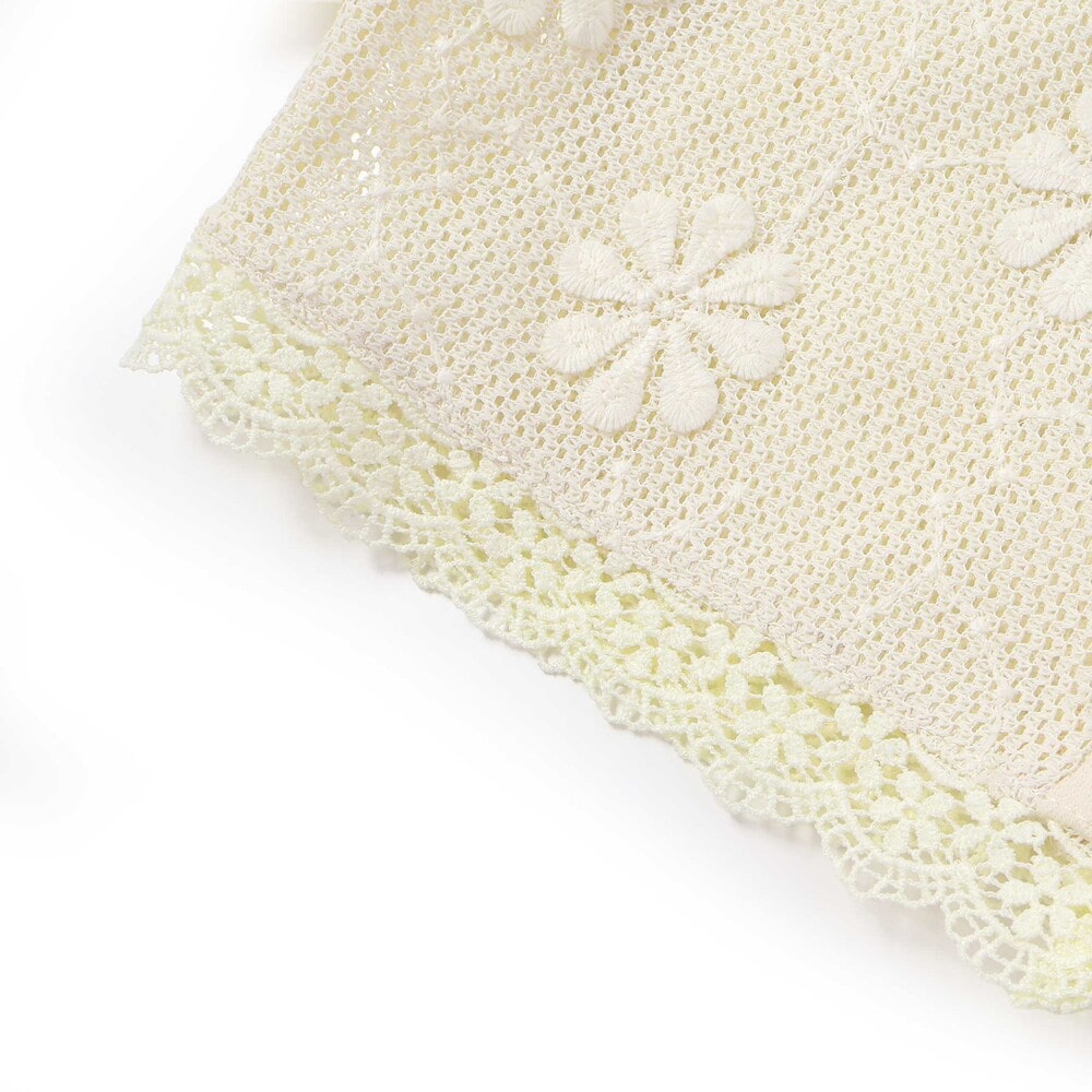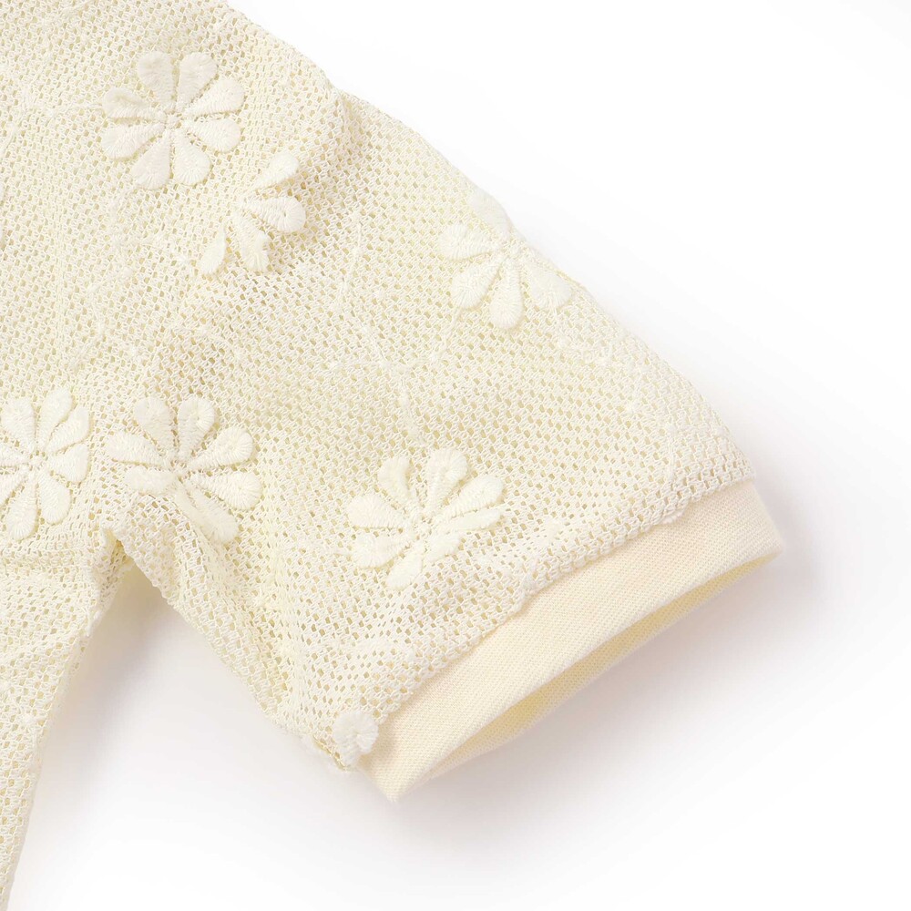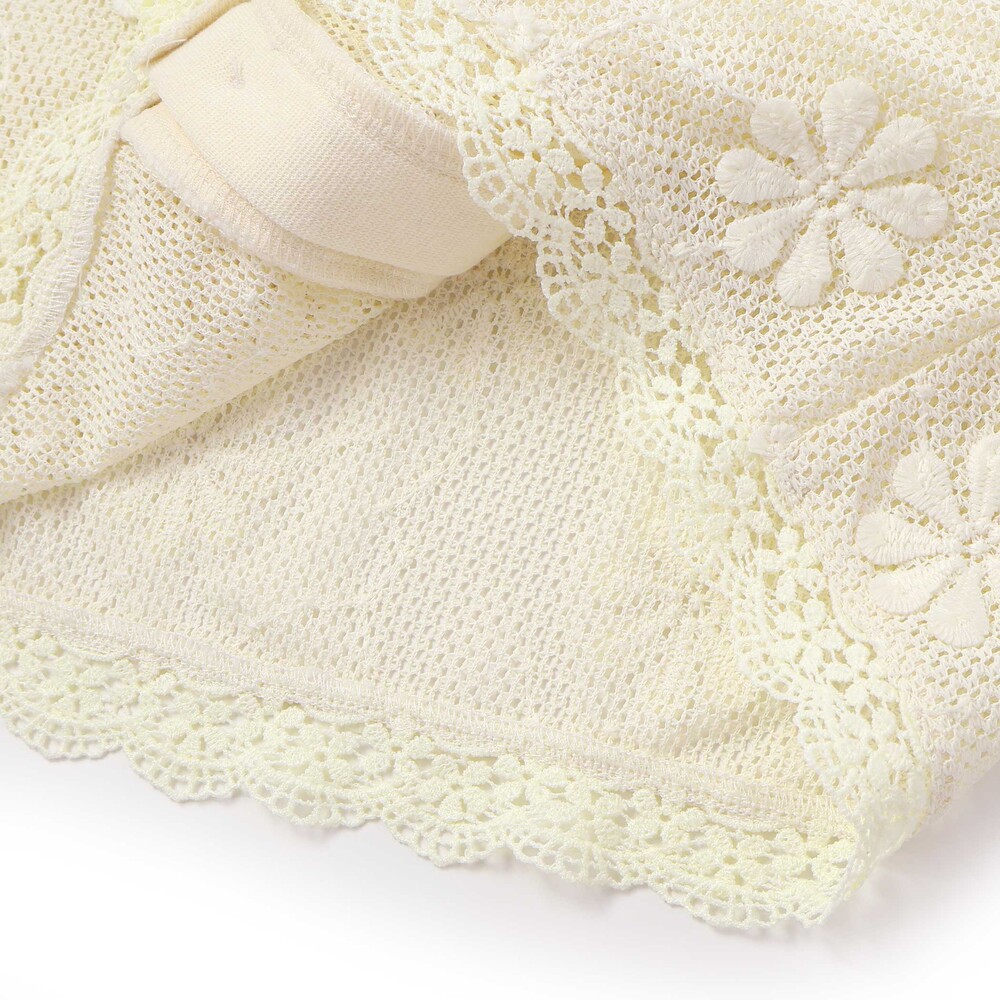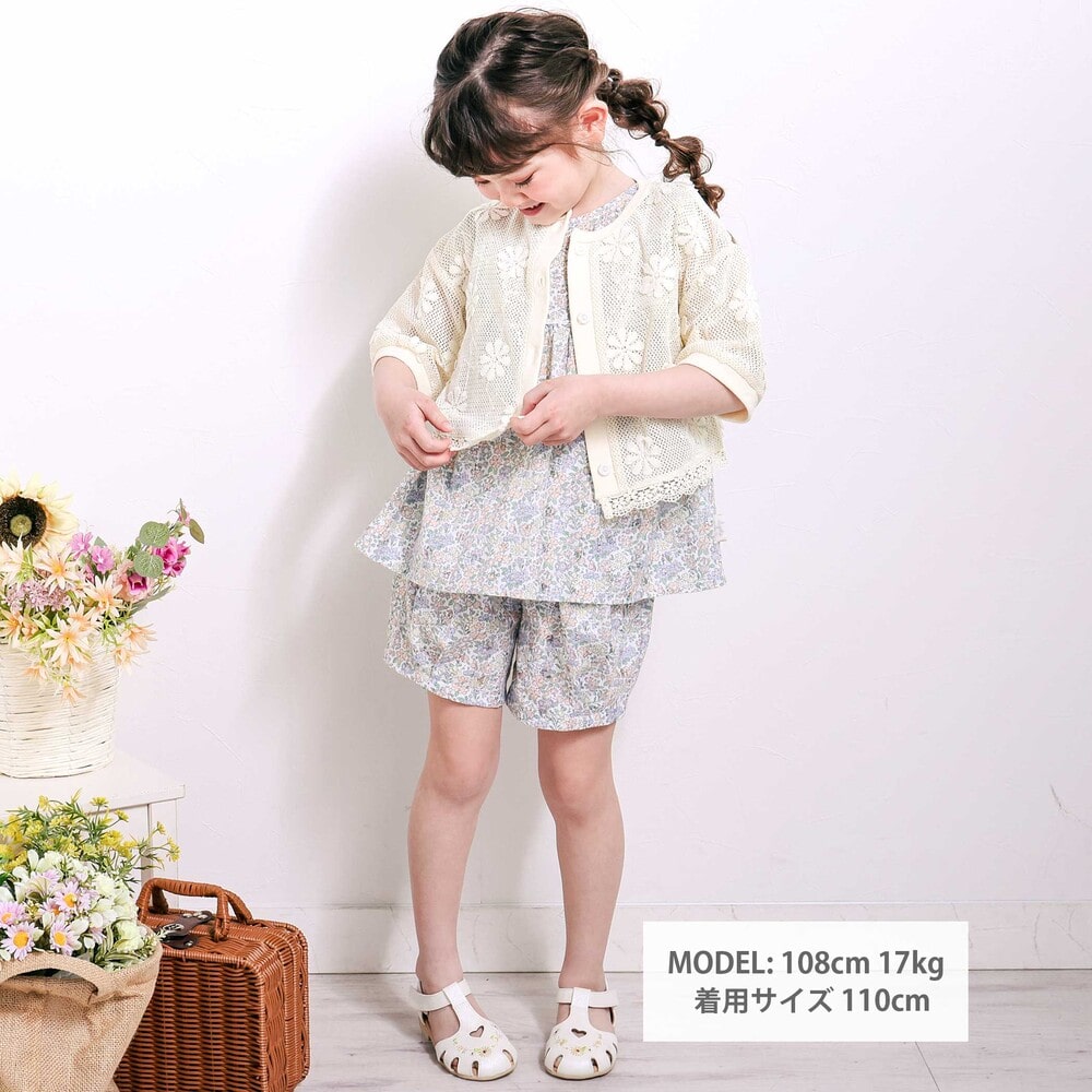 花モチーフを散りばめたニットレースが、やさしく華やかな雰囲気を演出してくれる女の子用カーディガン。