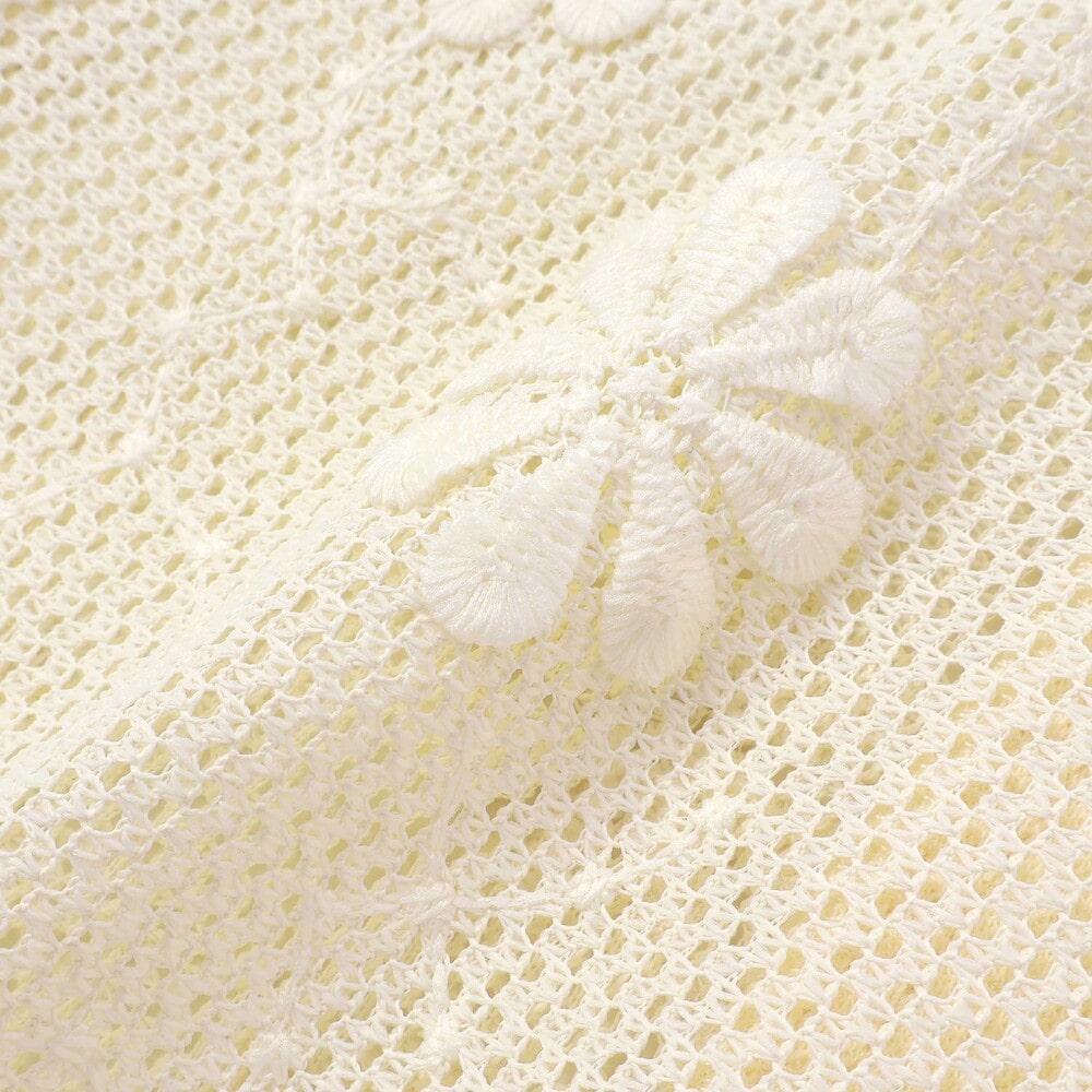 全体に広がるニットレースには小さな花モチーフが添えられ、羽織るだけでコーディネートがぱっと明るくなります。