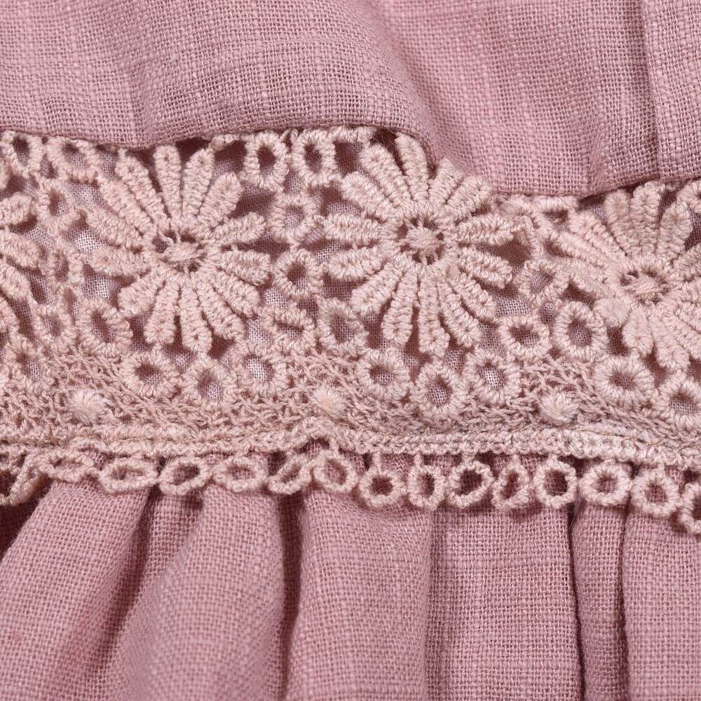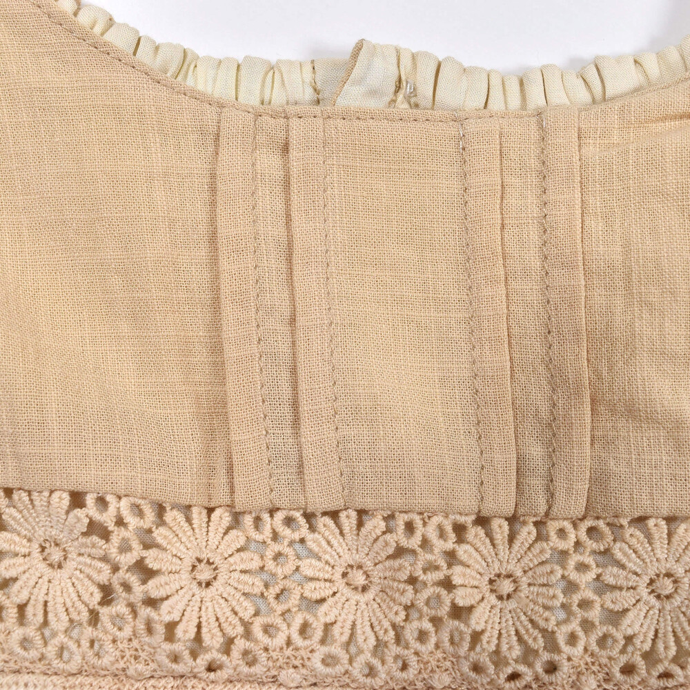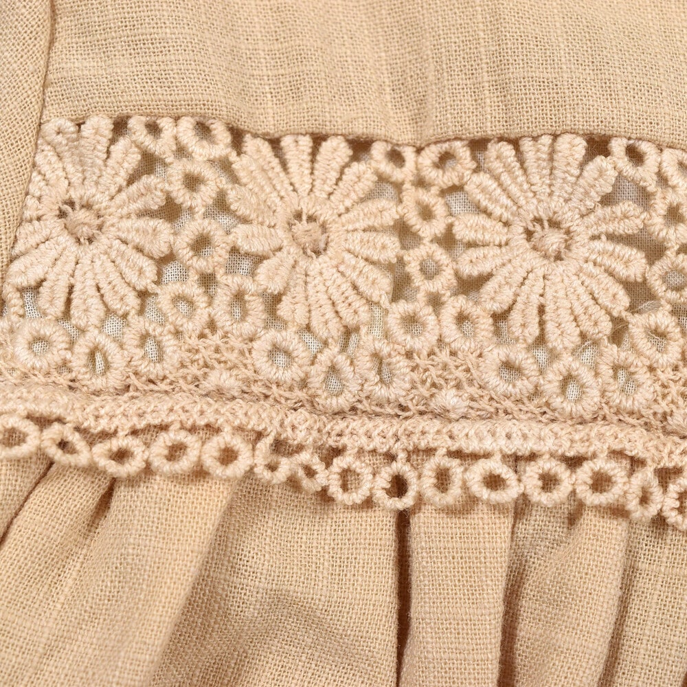 身頃のくしゅくしゅと寄せたギャザーデザインと、お花レースがかわいらしい印象に。
