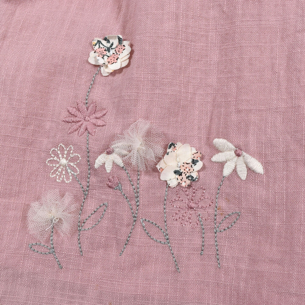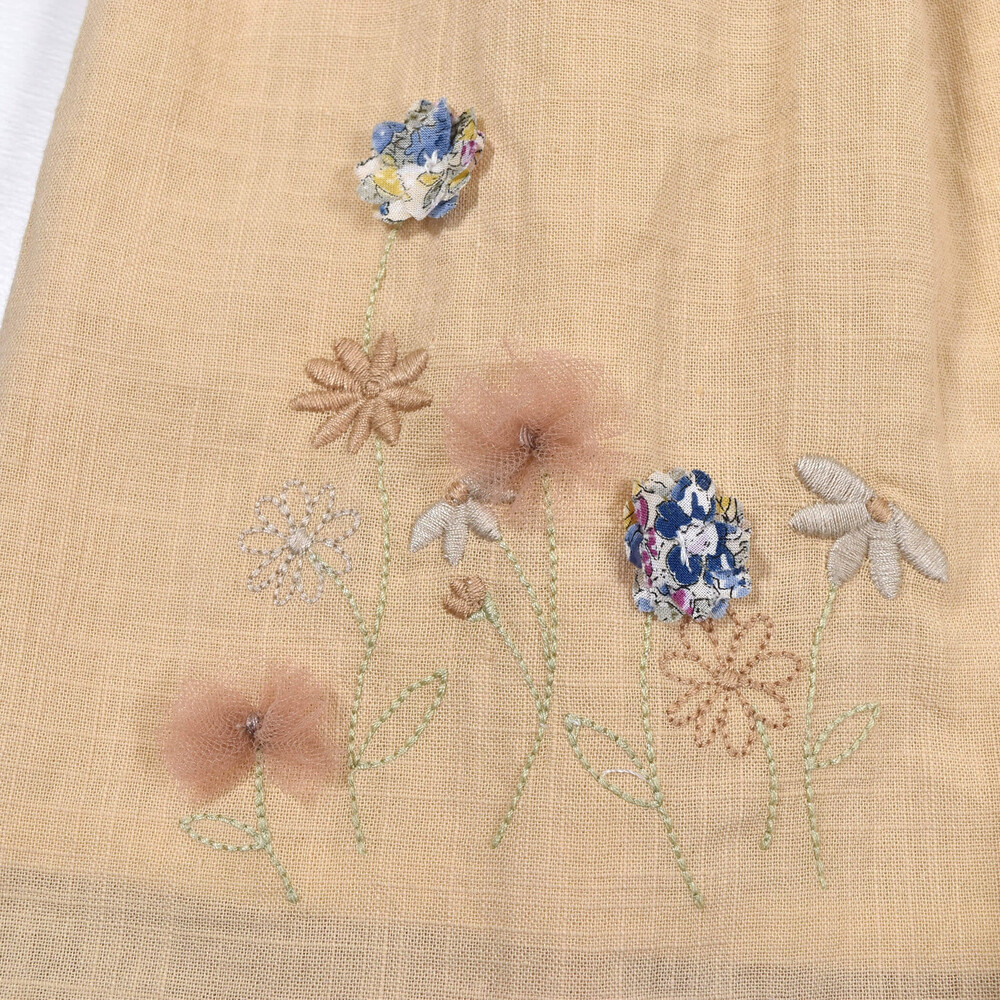 刺繍に、花柄プリントやチュールで作った花モチーフを組み合わせて、春の花畑をイメージ♪