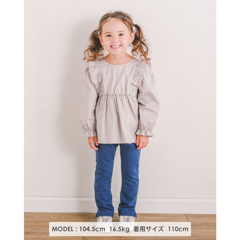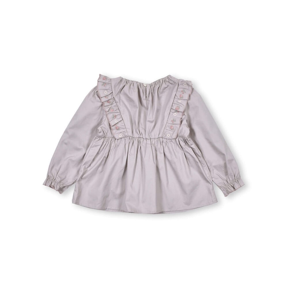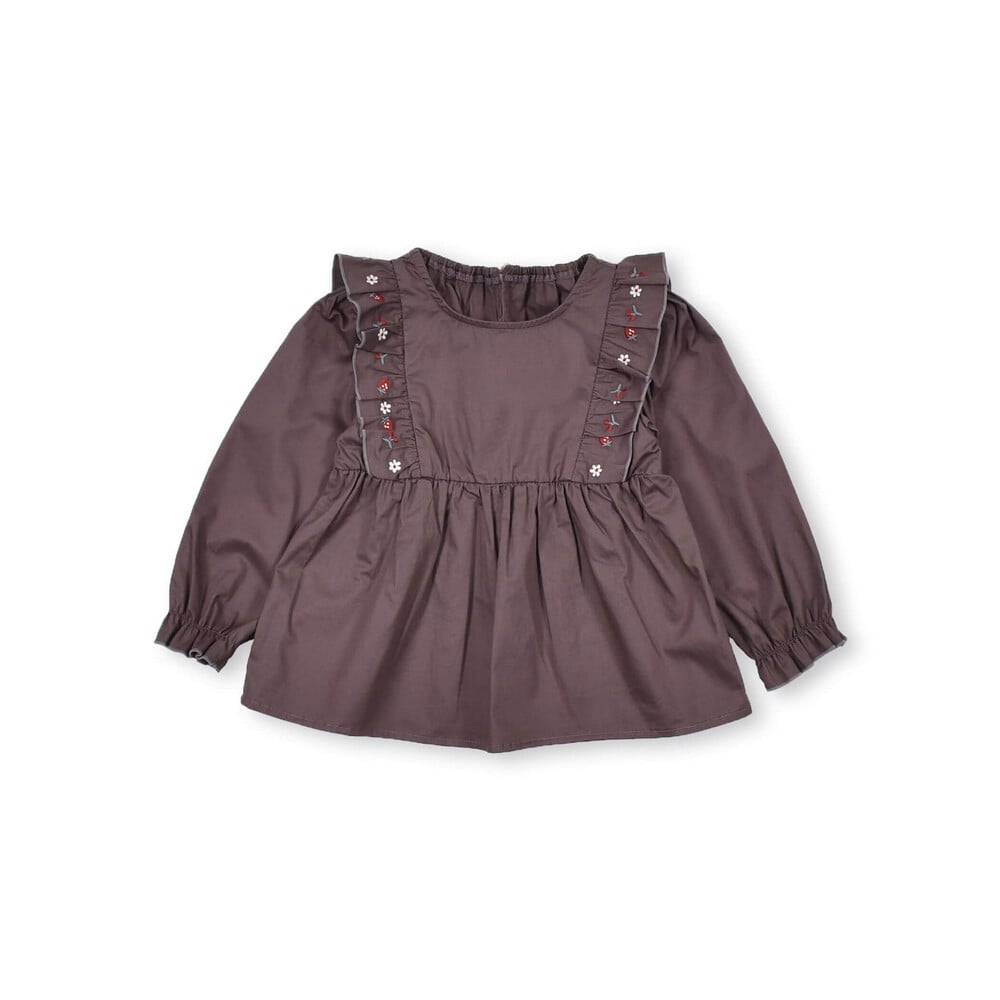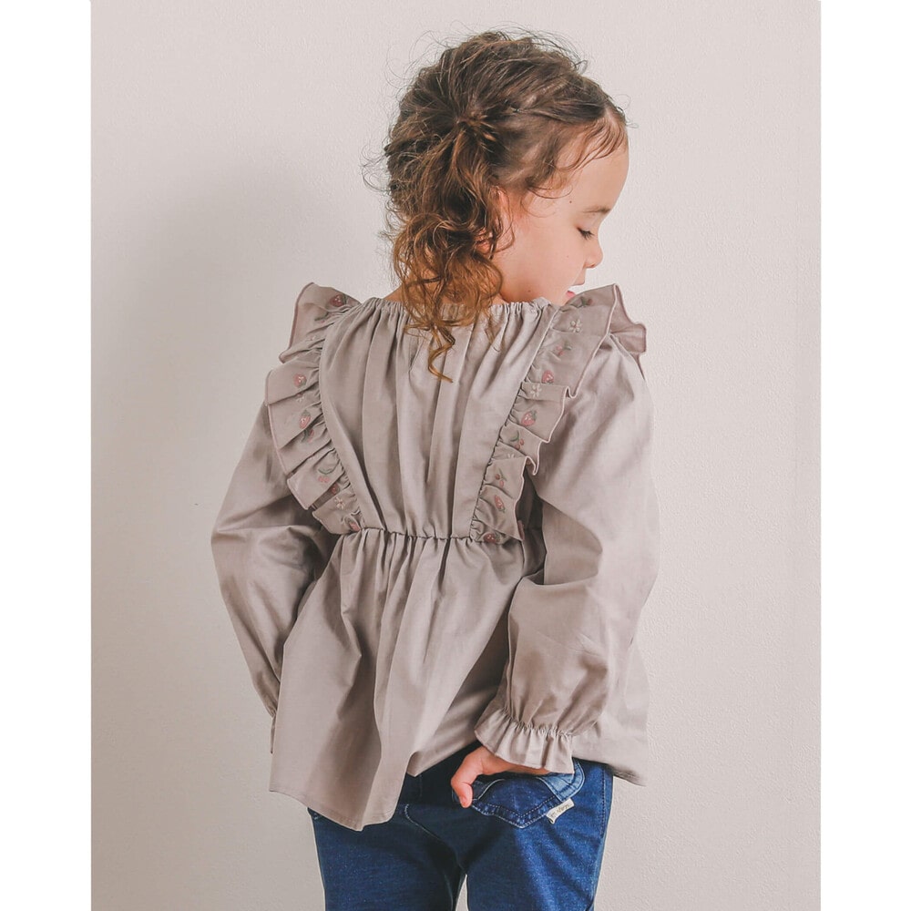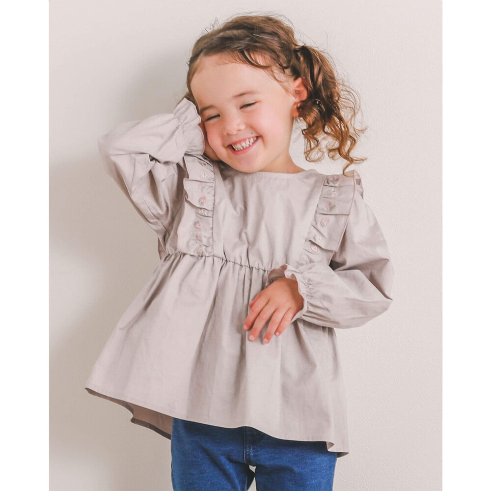 肩フリル部分に刺繍を施したコットン素材の長袖ブラウス。