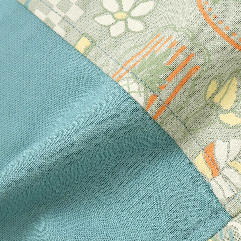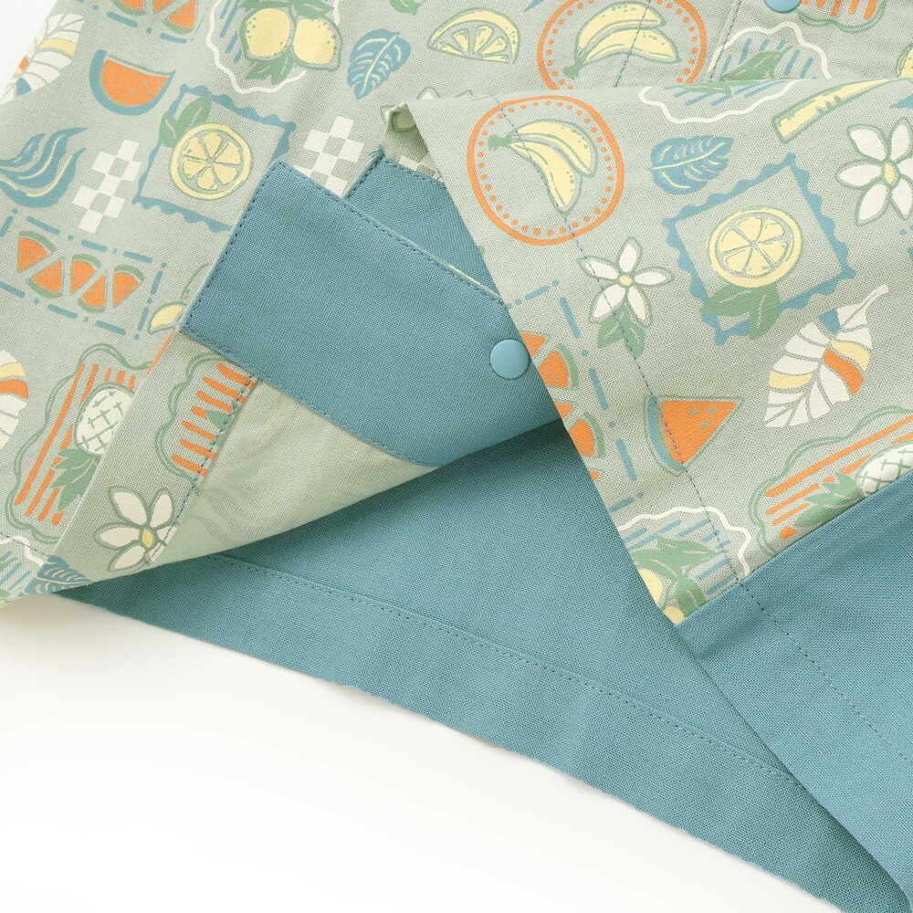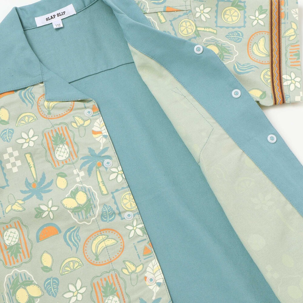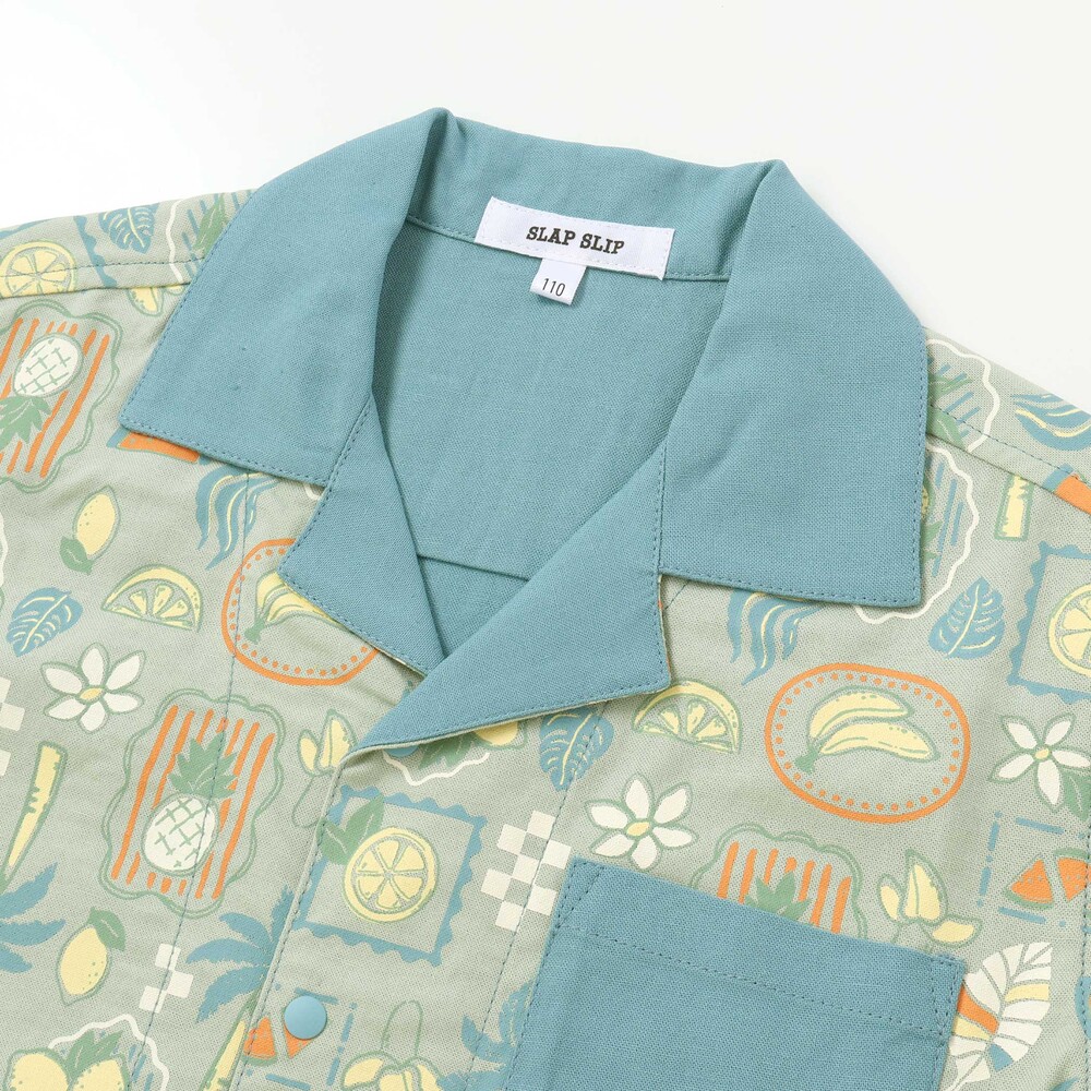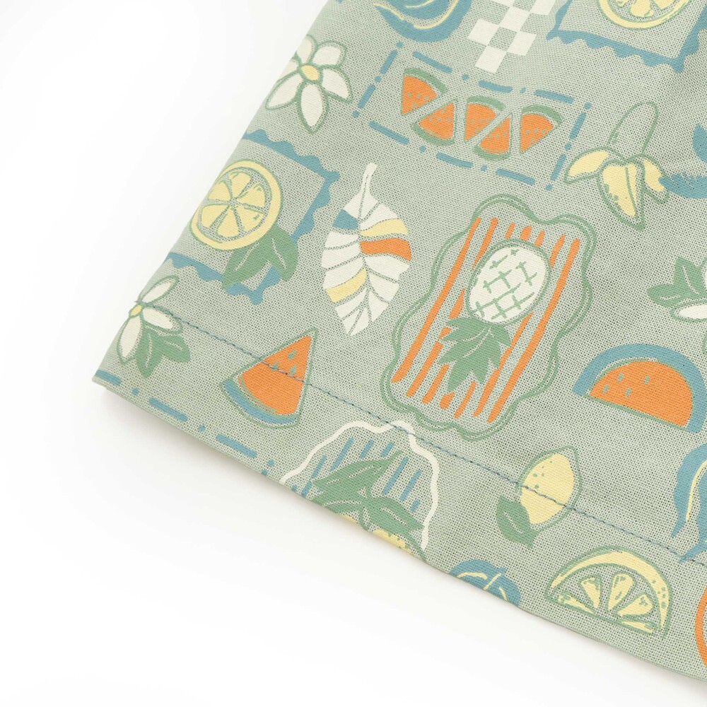 グリーン系は、レモンやスイカ、南国の木々を散りばめたトロピカルな総柄。