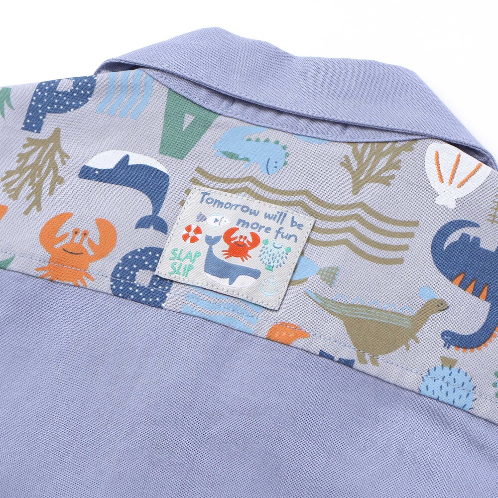 後ろ襟の下には、カニやクジラ、ハリセンボンがデザインされた織りネームタグを添え、さりげない遊び心をプラス。