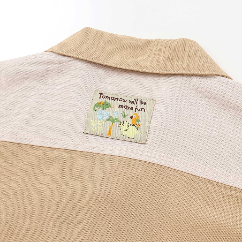 ちょっと冒険気分のある柄に、恐竜やカメレオン、オウムが入った織りネームタグを合わせ、想像力をくすぐる仕上がりにしています。