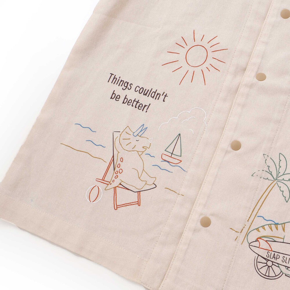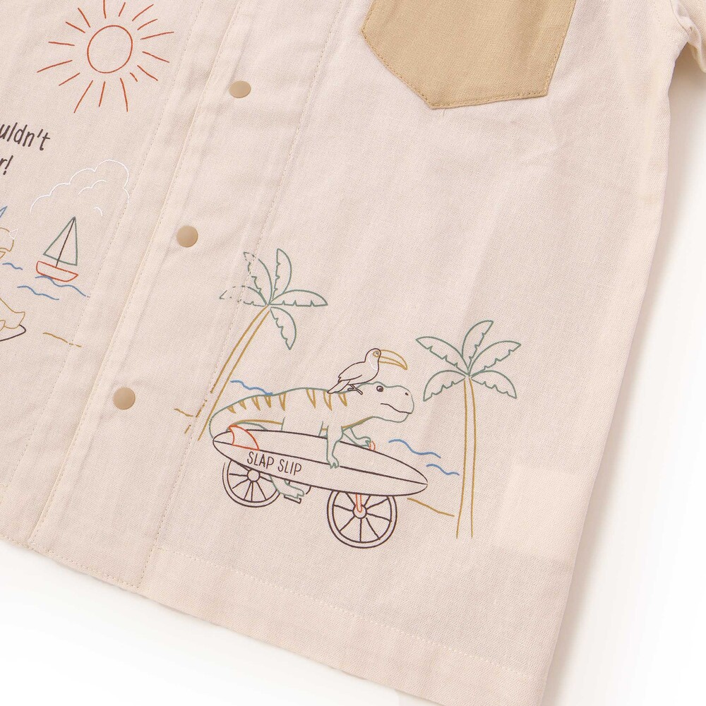 ベージュは、恐竜たちが夏を満喫しているユニークなプリントが目を引くデザイン。