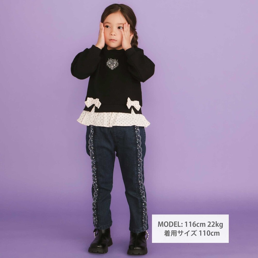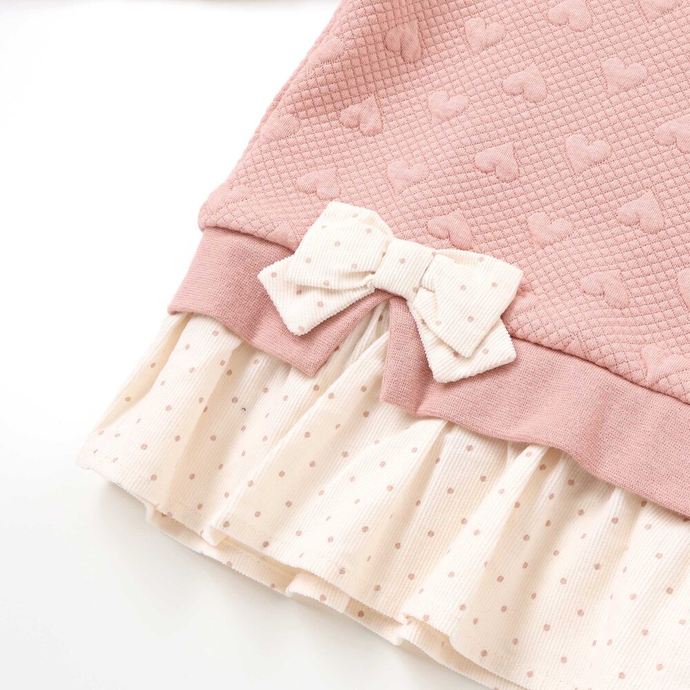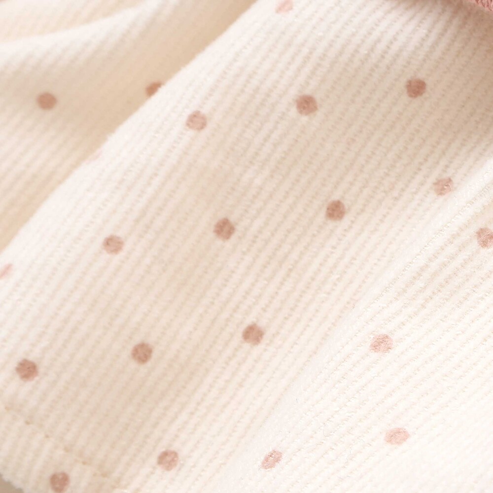 裾にはドットプリント柄のコーデュロイフリルとリボンがあしらわれ、動くたびに揺れる可愛らしいデザインに。