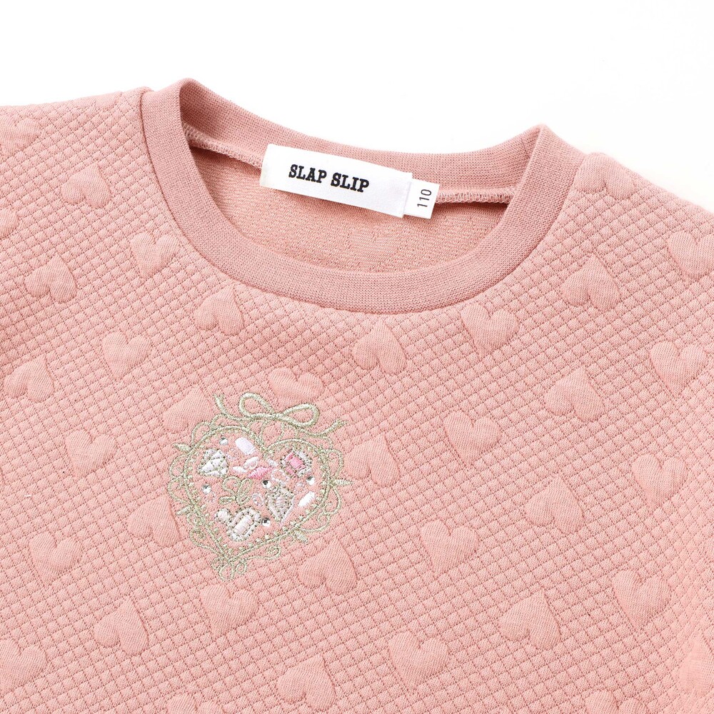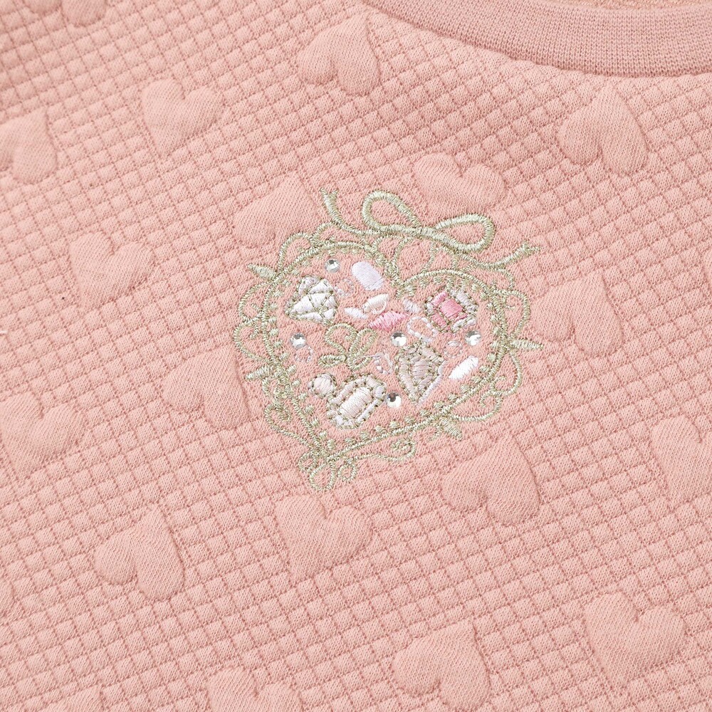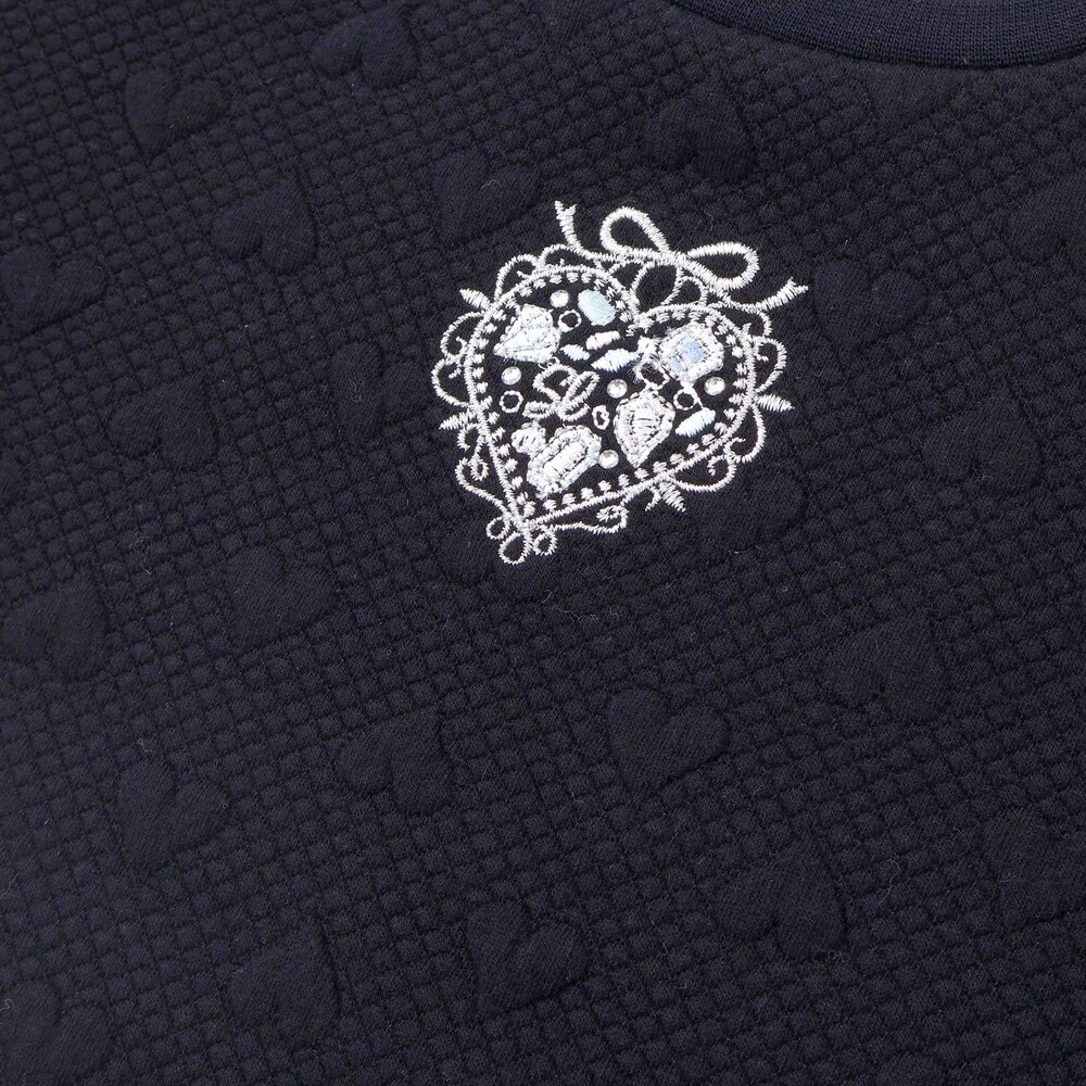 フロントにはラメ糸の刺しゅうとラインストーンで描かれたハートのレリーフがきらりと輝き、華やかさをプラスします。