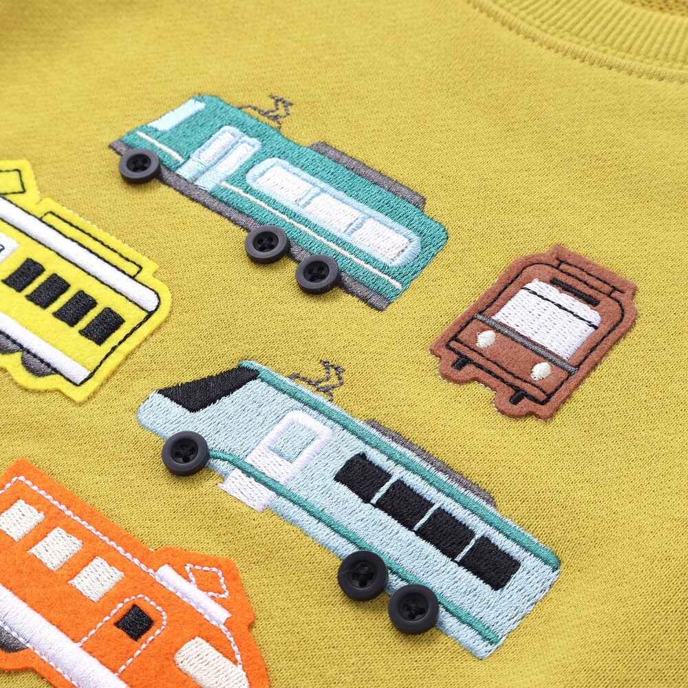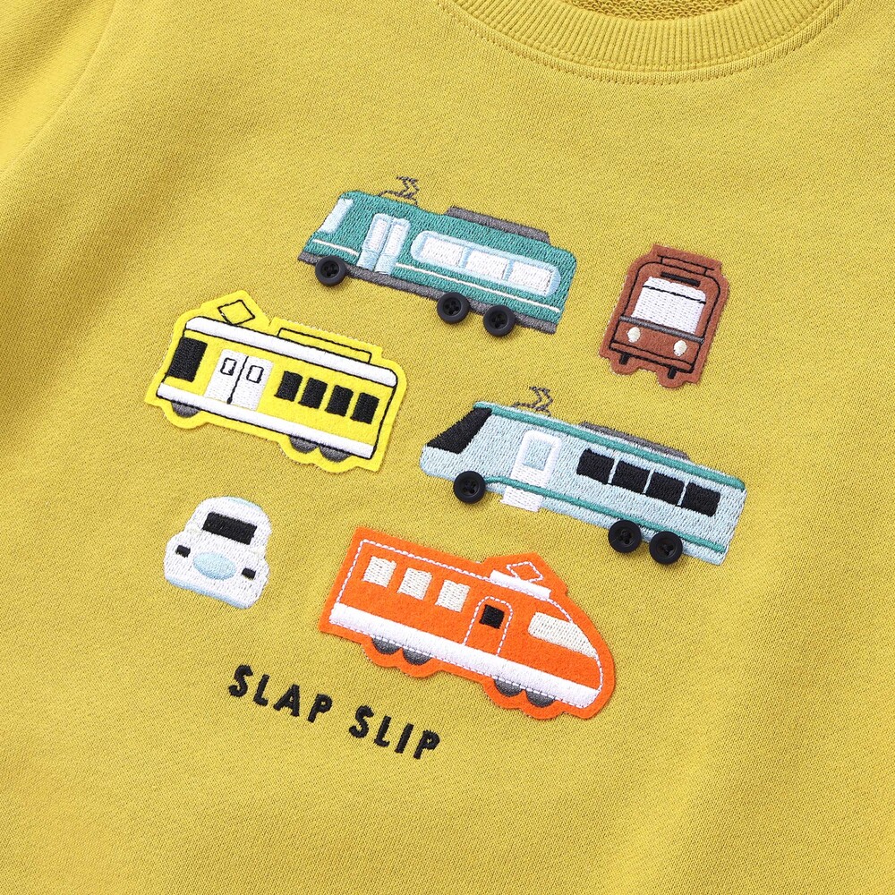 フロントには刺しゅうにボタン、フェルトパッチで表現した6つの電車モチーフを並べ、まるでお気に入りの電車図鑑を着ているみたいなワクワク感を楽しめます。