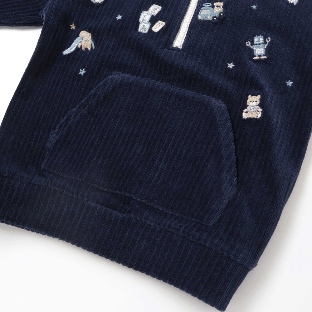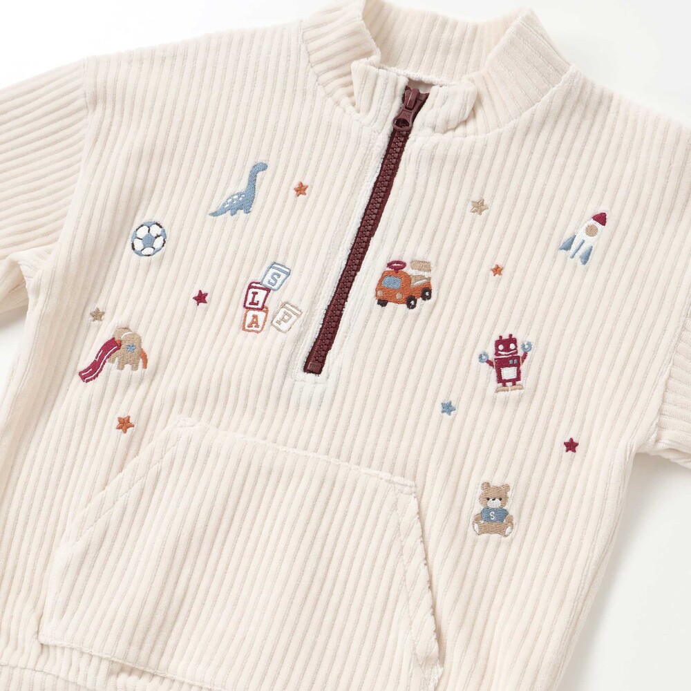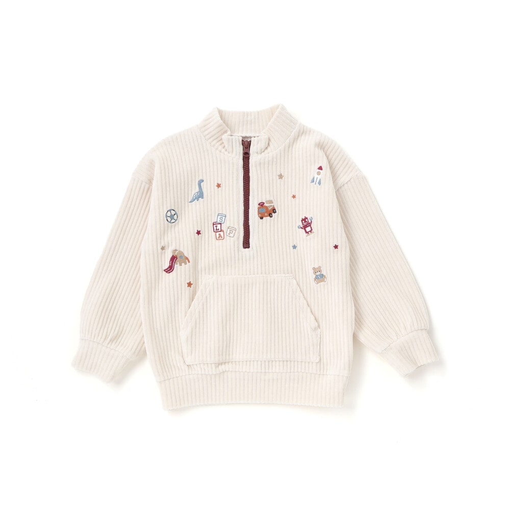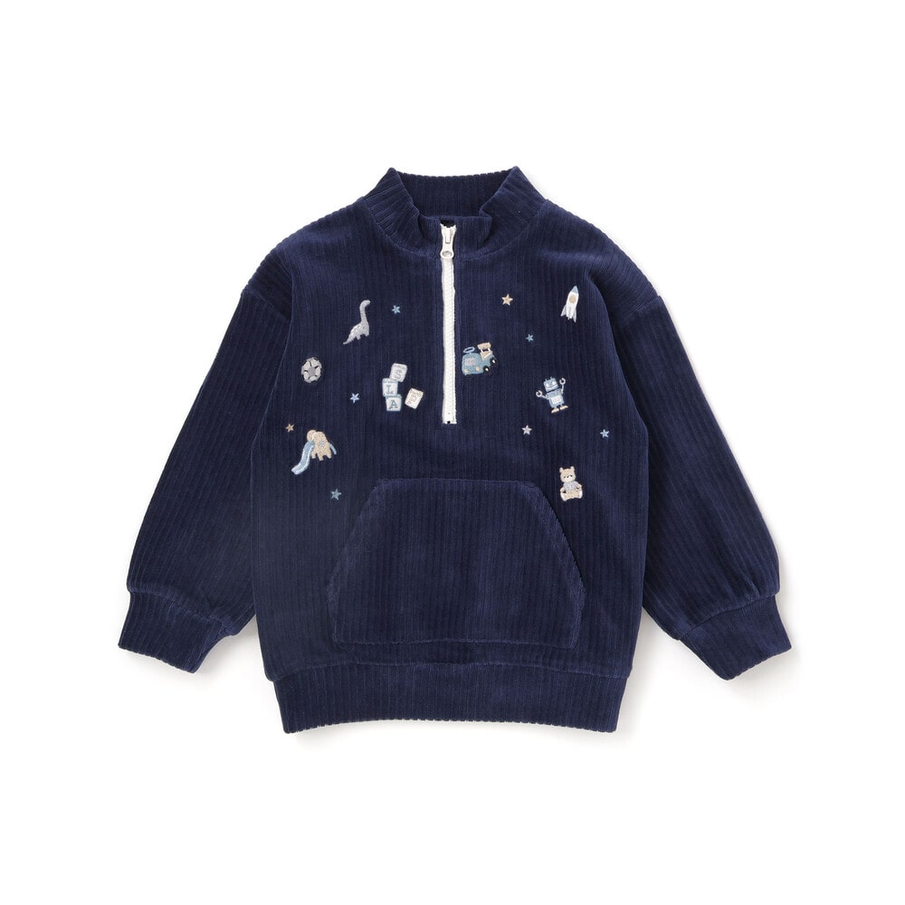 いろんなおもちゃがいっぱいの刺しゅう柄をあしらい、遊び心をプラス。