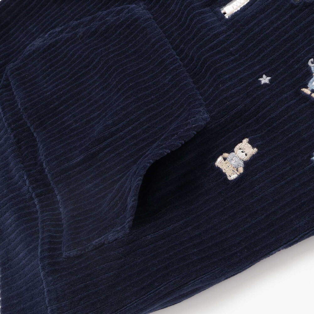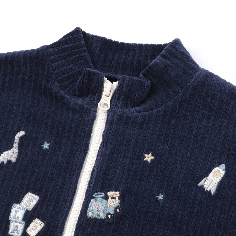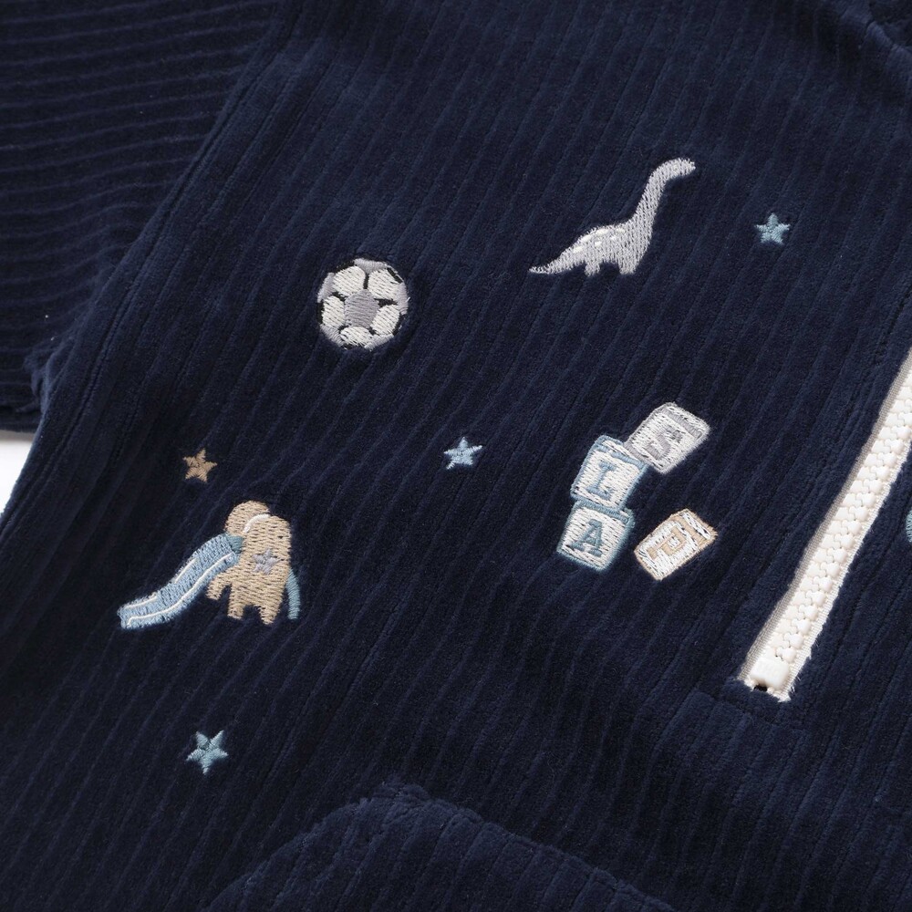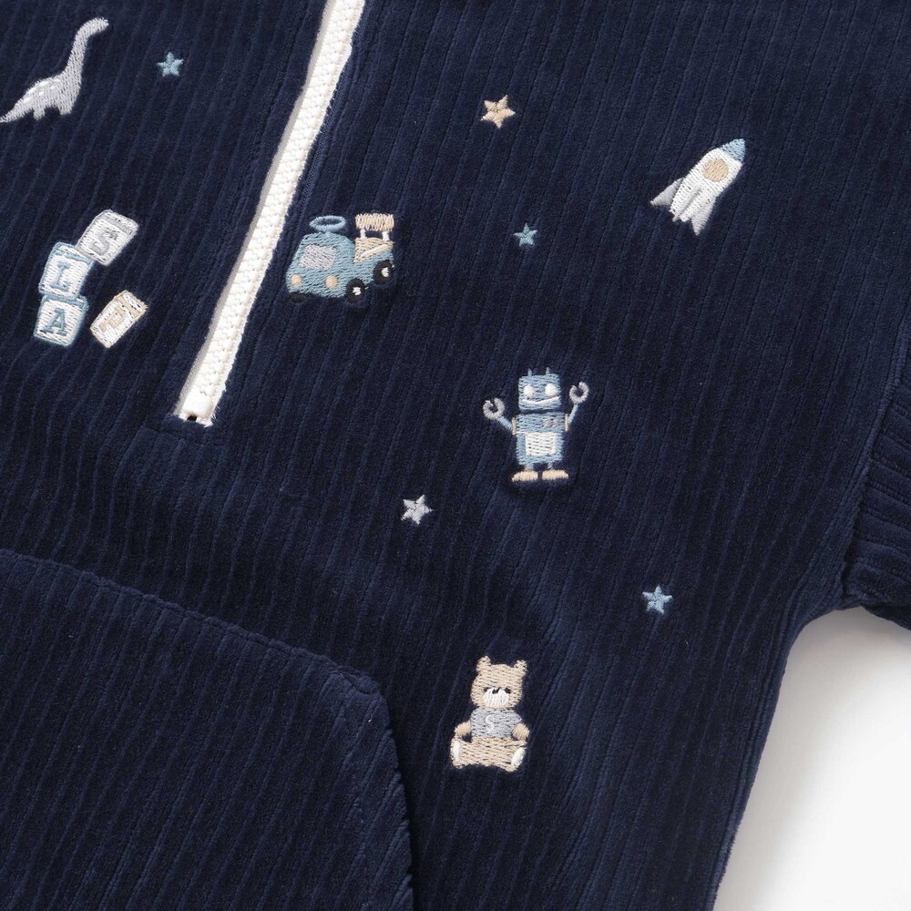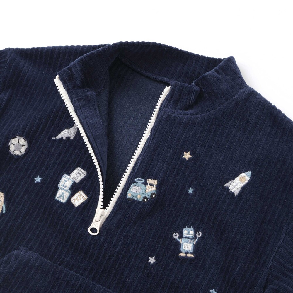 いろんなおもちゃがいっぱいの刺しゅう柄をあしらい、遊び心をプラス。