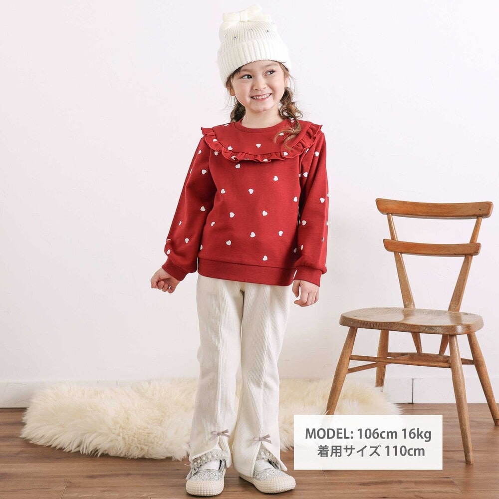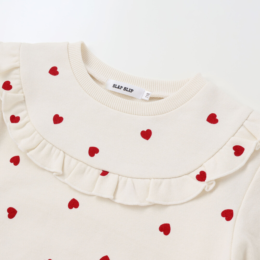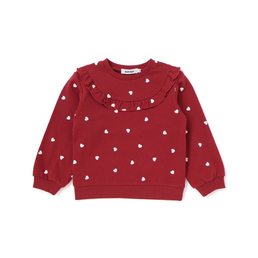 ハート柄とフリルの可愛らしいデザインで、毎日着たくなる一枚になっています。