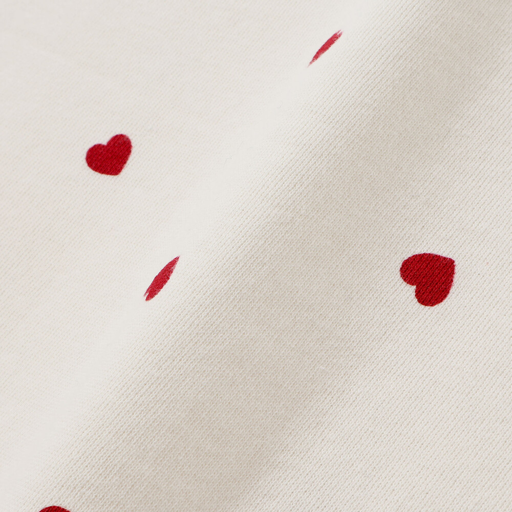 カラーは真っ赤なハート柄が映えるオフホワイト系とパッと目を引くレッド系の2色展開で、どちらも女の子らしい雰囲気に仕上がっています。
