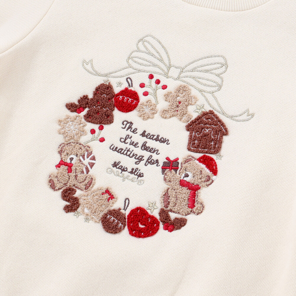 オフホワイト:まあるいリースみたいなモチーフ。ツリーにジンジャークッキー、オーナメント…サンタ帽をかぶったり、キャンディーを持ったクマさんがいるから探してみてね。