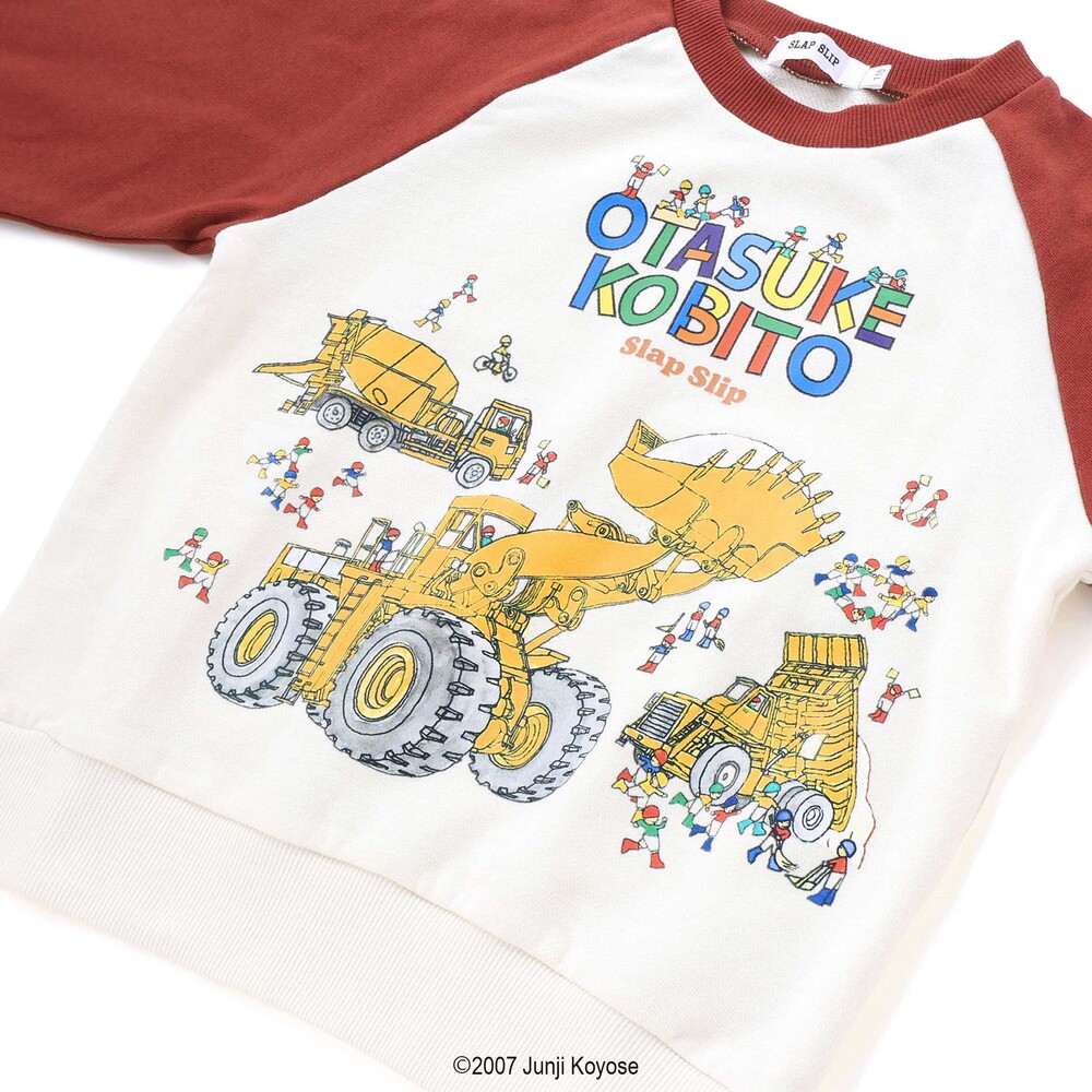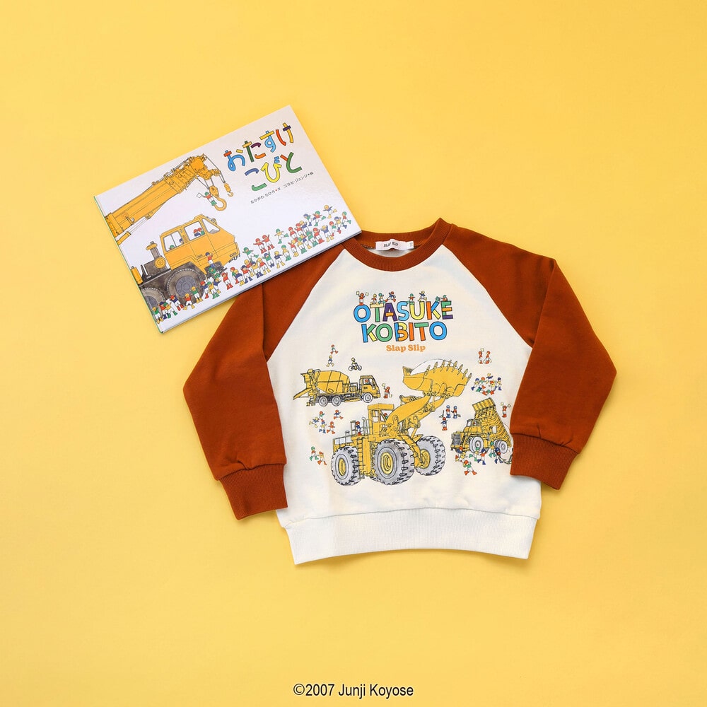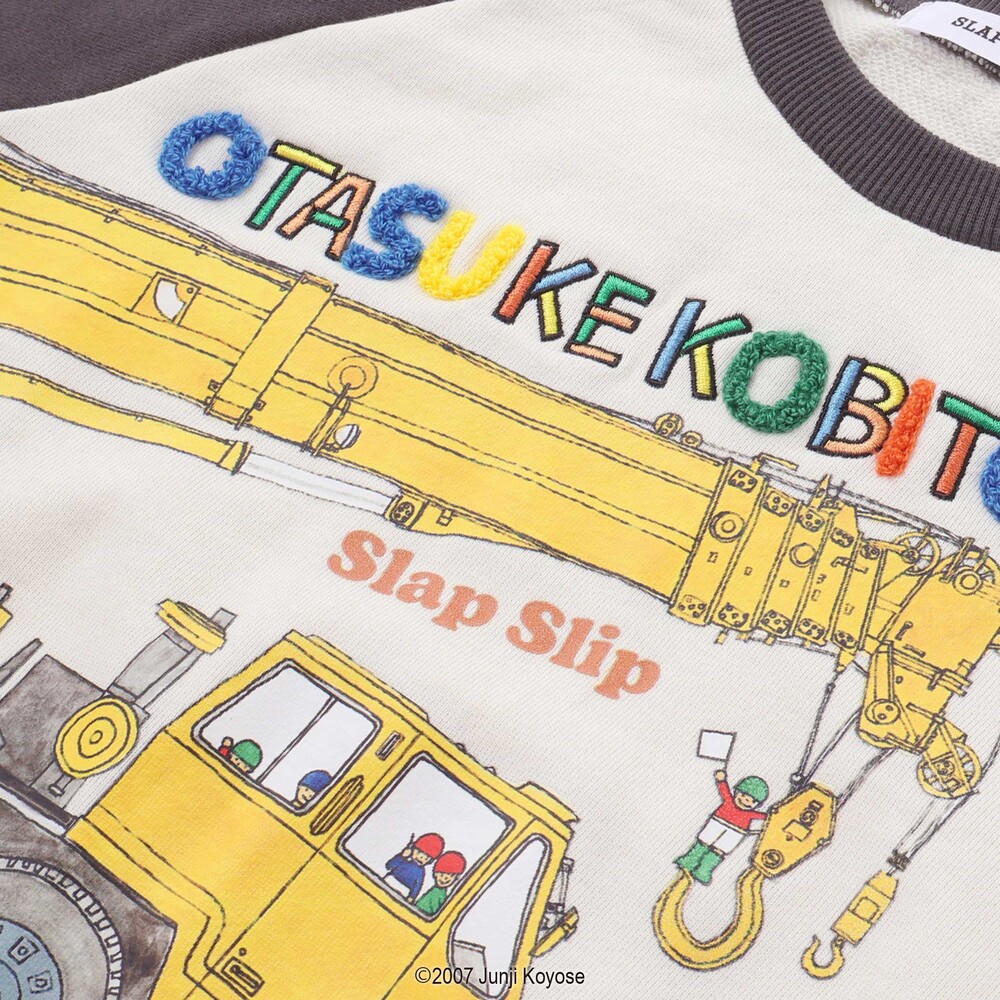 レッド:OTASUKEKOBITO の大きな文字やいろんなはたらくくるまの周りには「おたすけこびと」たち。みんなで文字を作っているかのようなデザインが楽しい!