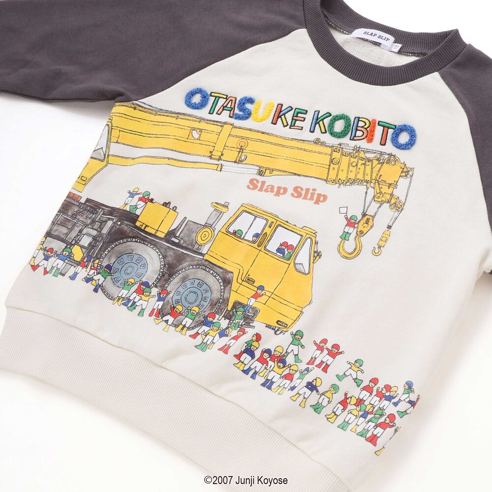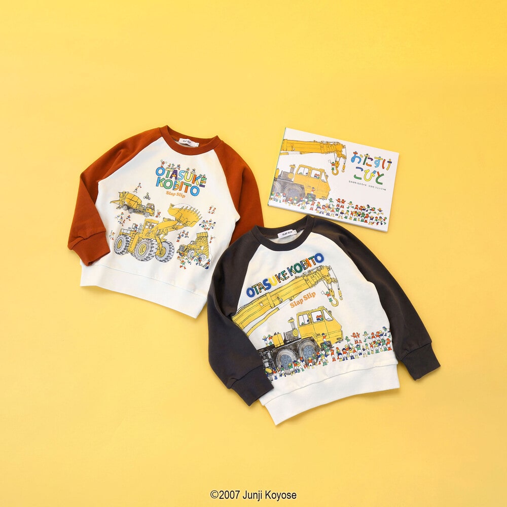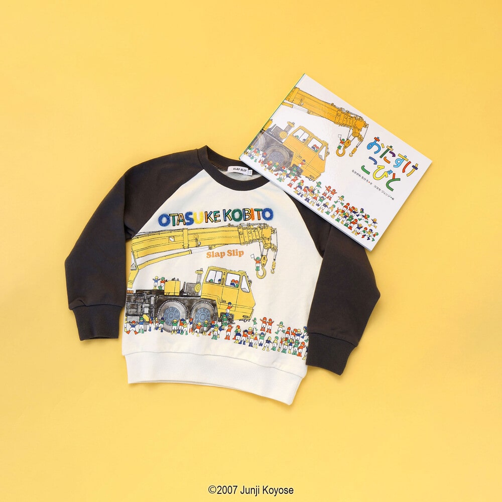 ブラック:大きなクレーン車にたくさんの「おたすけこびと」たちが乗ったり周りに集まったり絵本から飛び出したようなユニークなモチーフ
