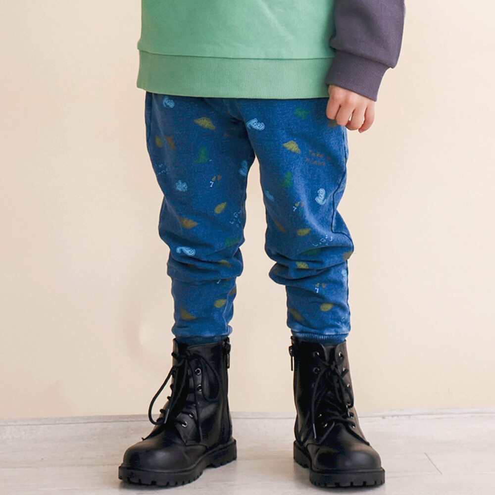 全面にカラフルな恐竜柄がプリントされたデニムニットパンツ。