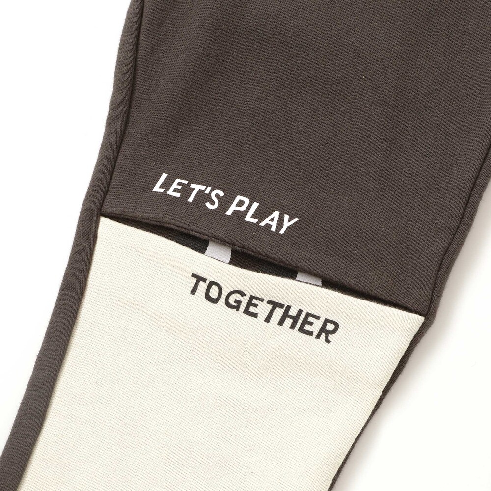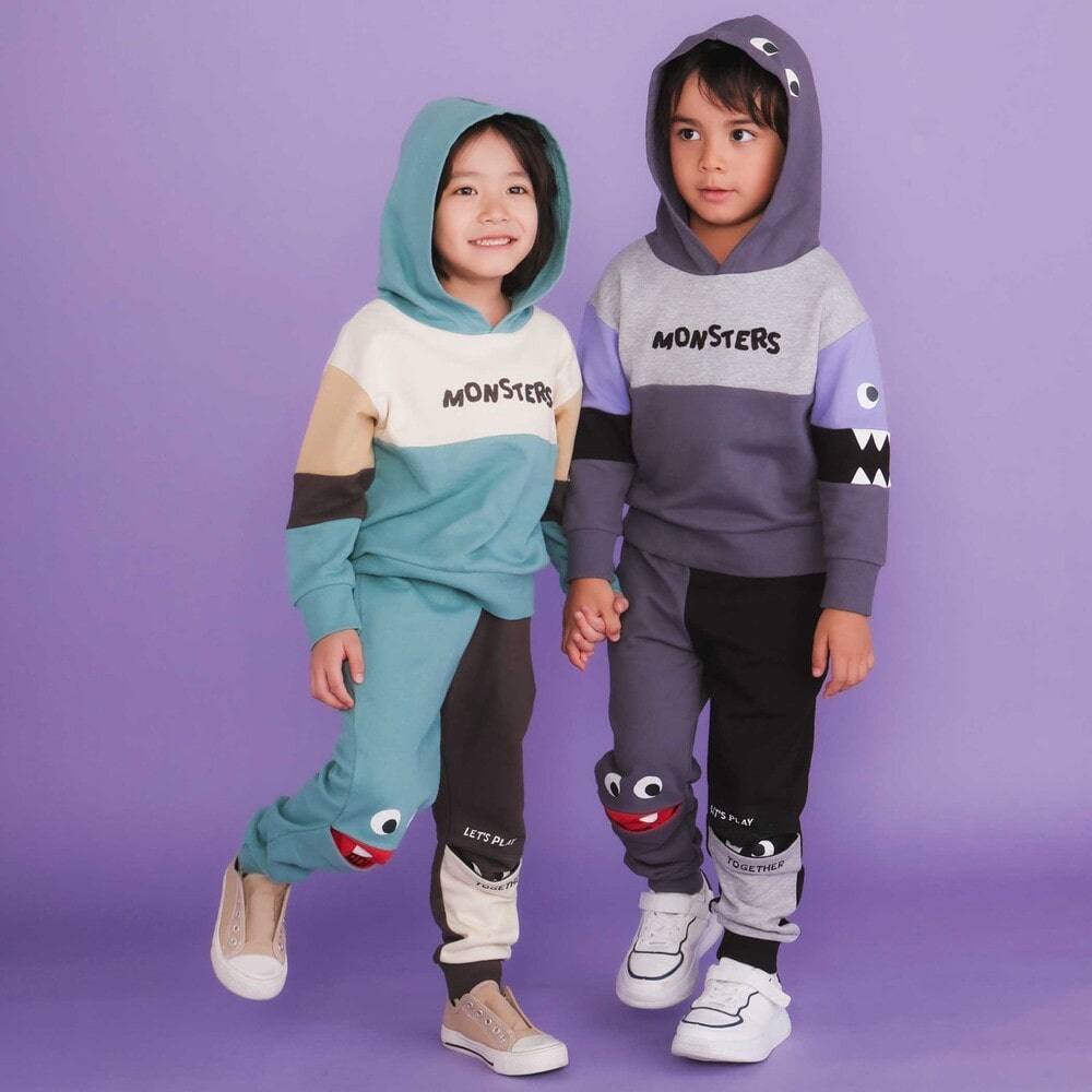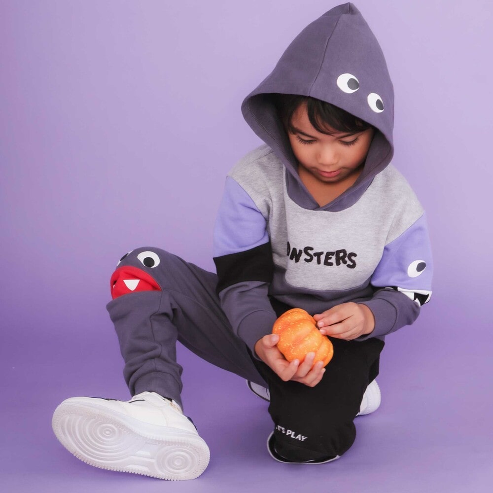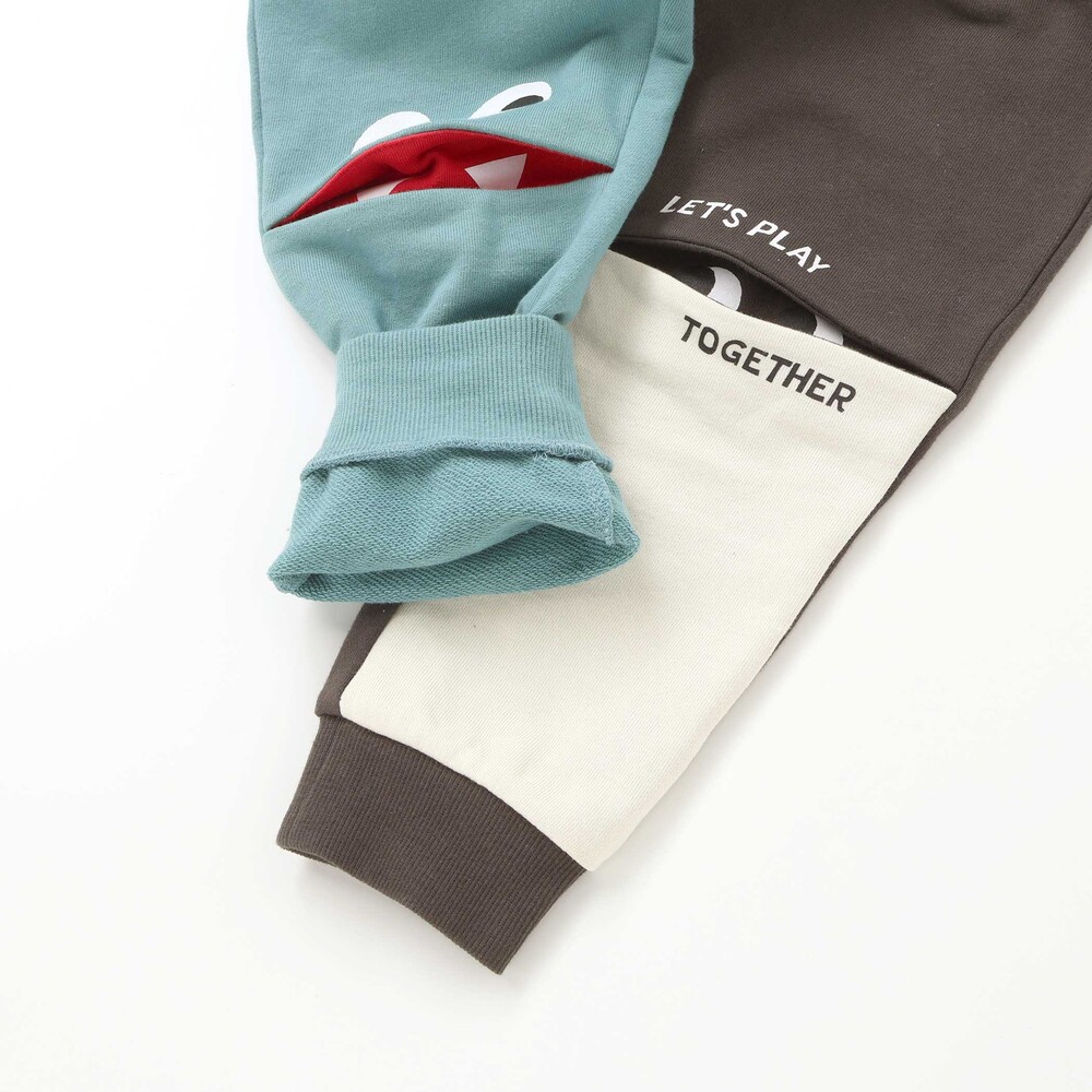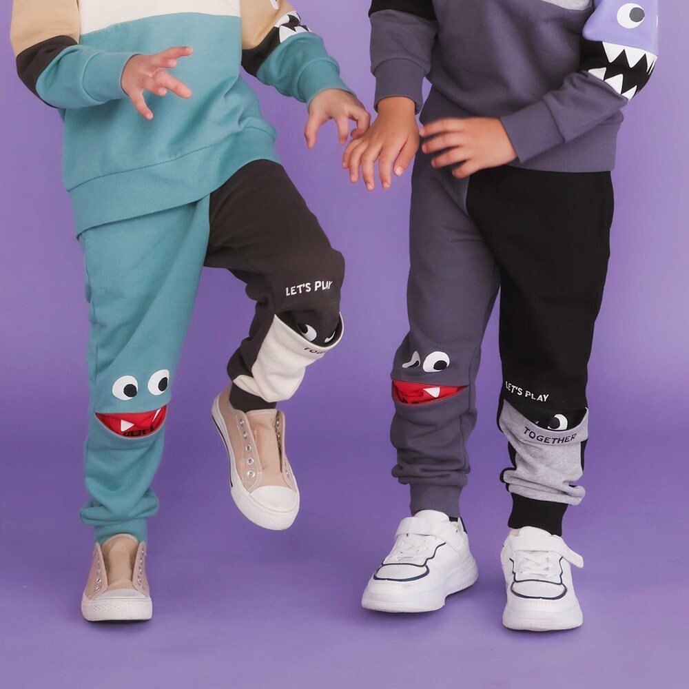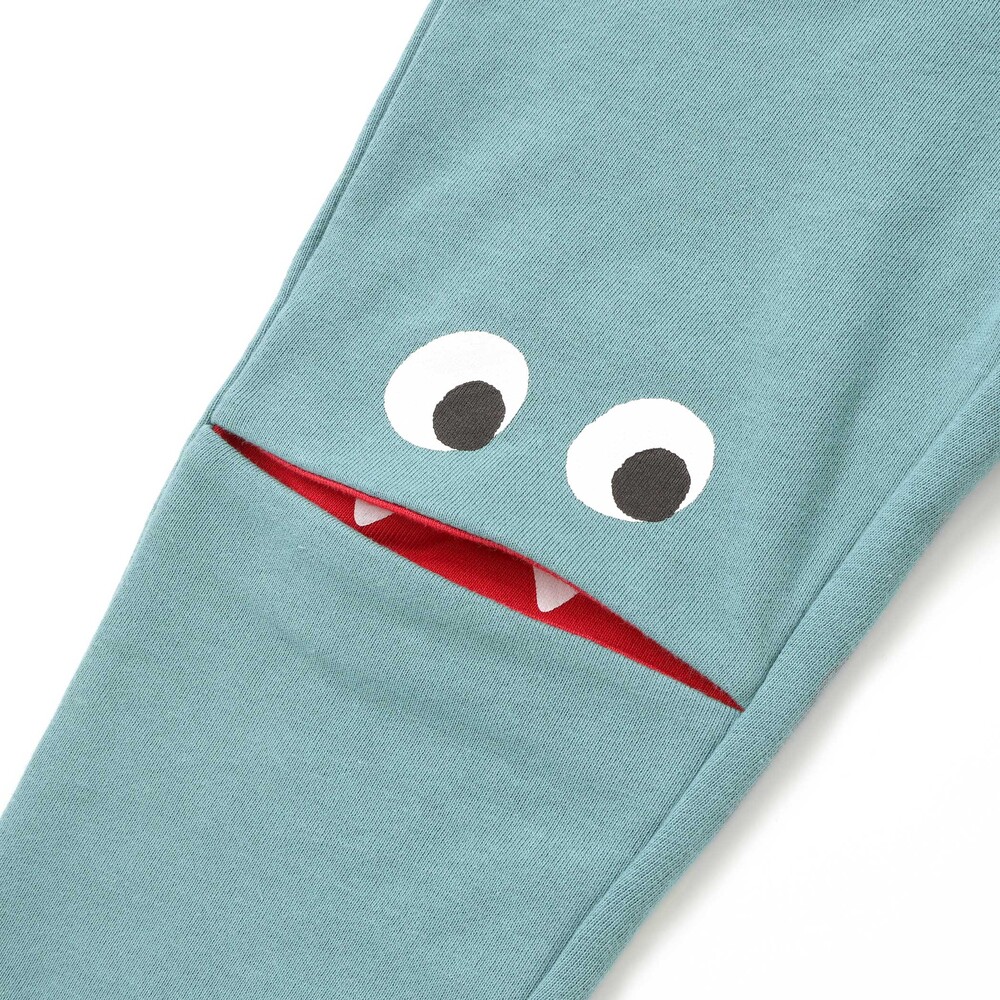 切り替えがおしゃれなアクセントになりつつ、両ひざ部分にモンスターを大胆にあしらった、遊び心満点の一枚です。
