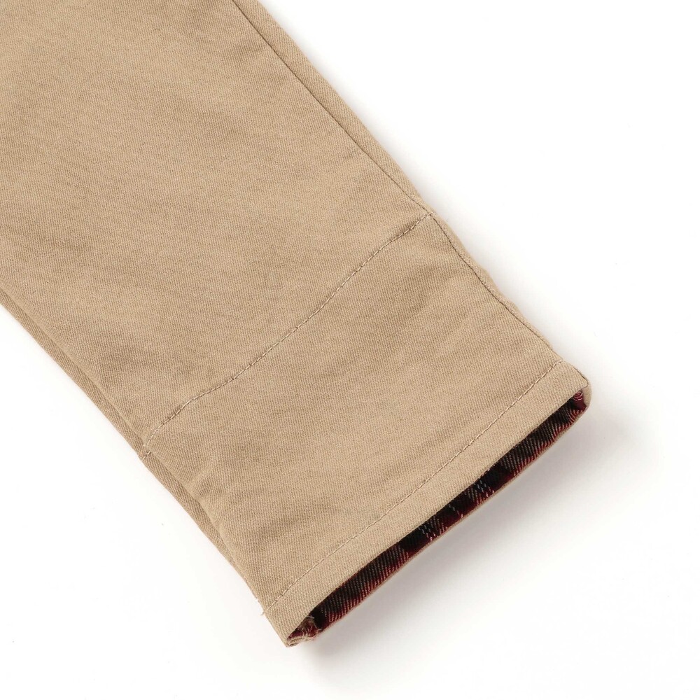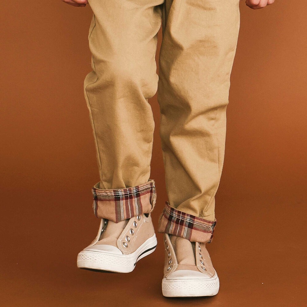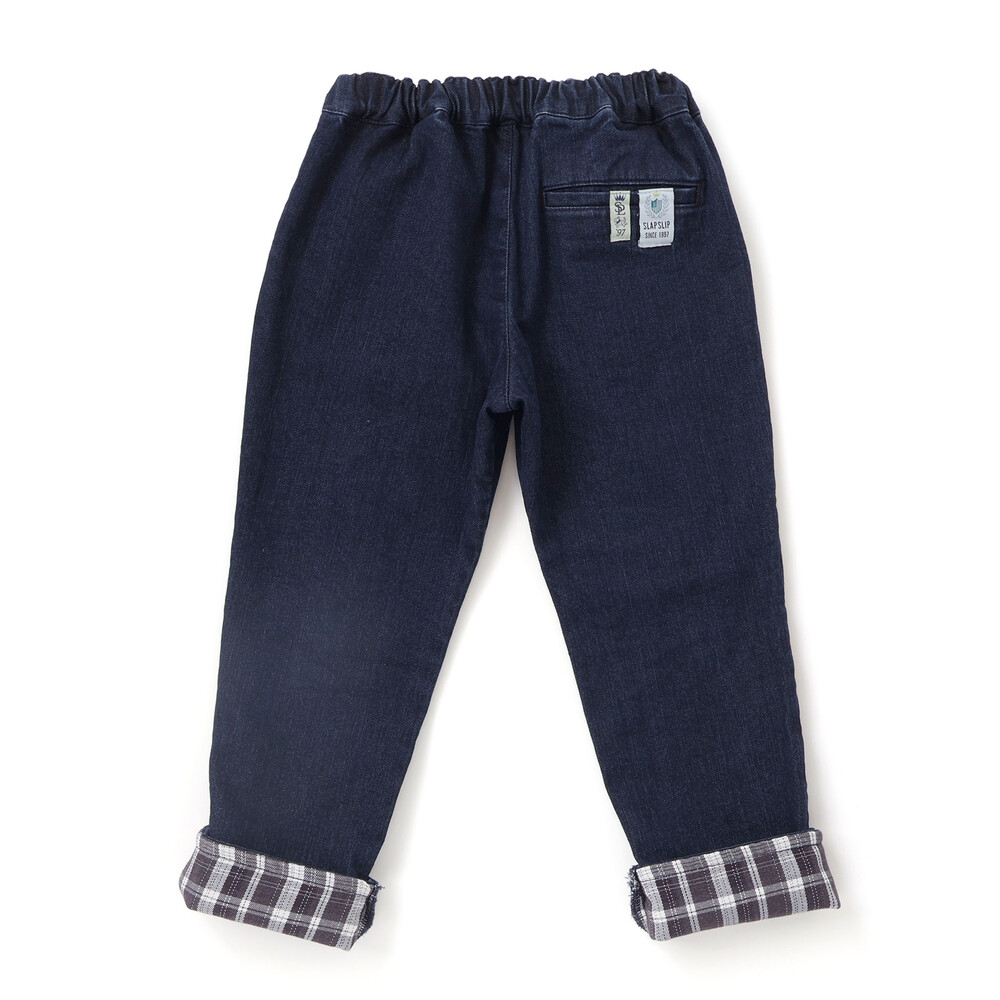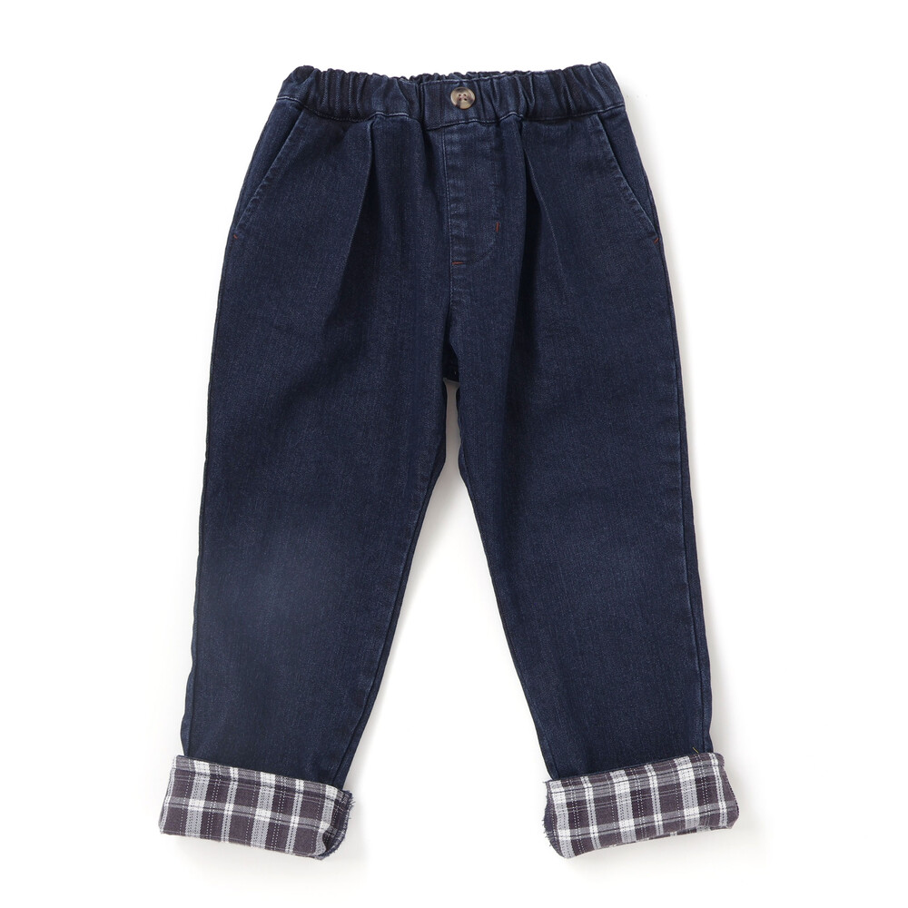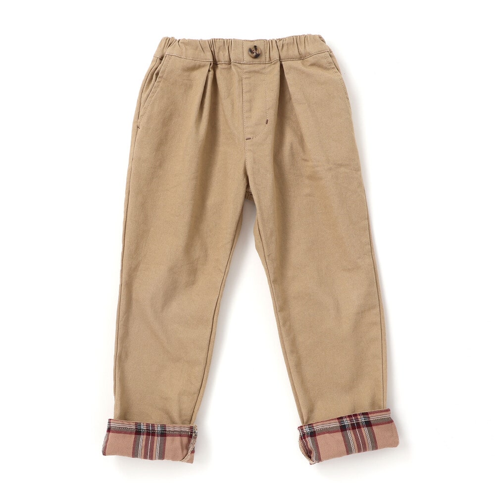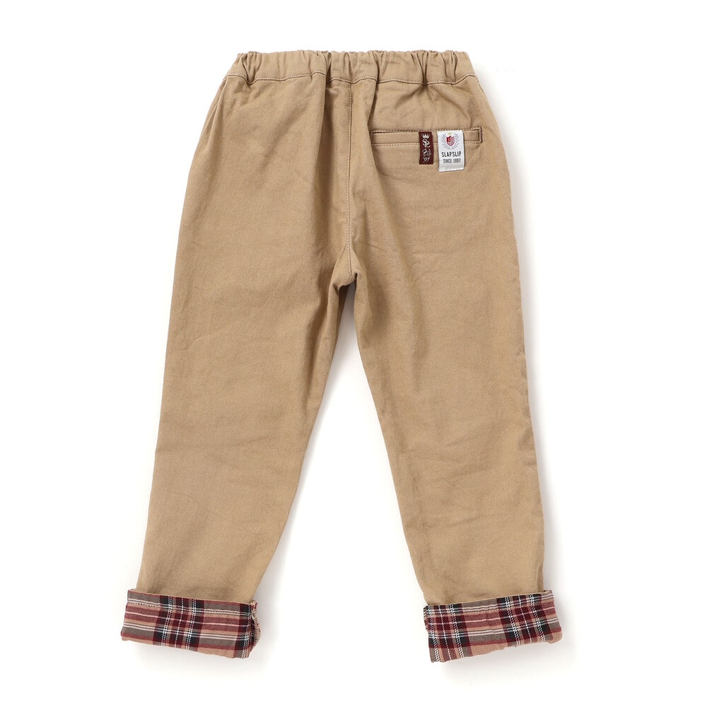 チェックの生地は裾の見返しに使用しているので、ロールアップして柄を見せる着こなしもおすすめ。