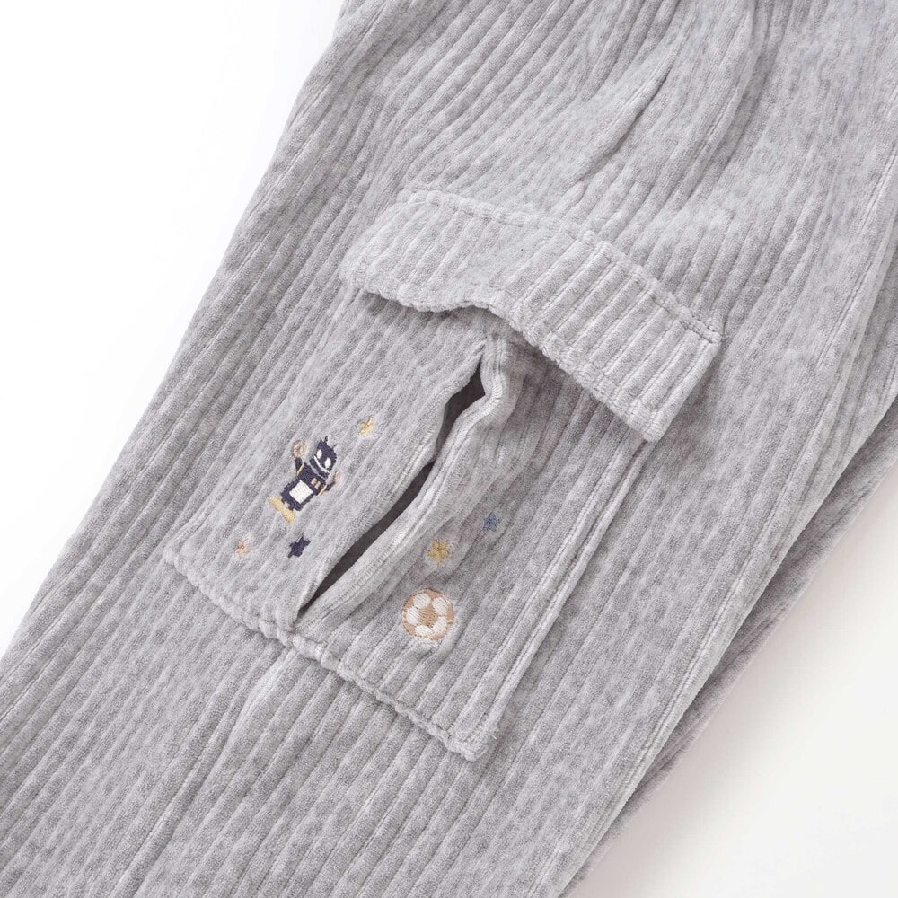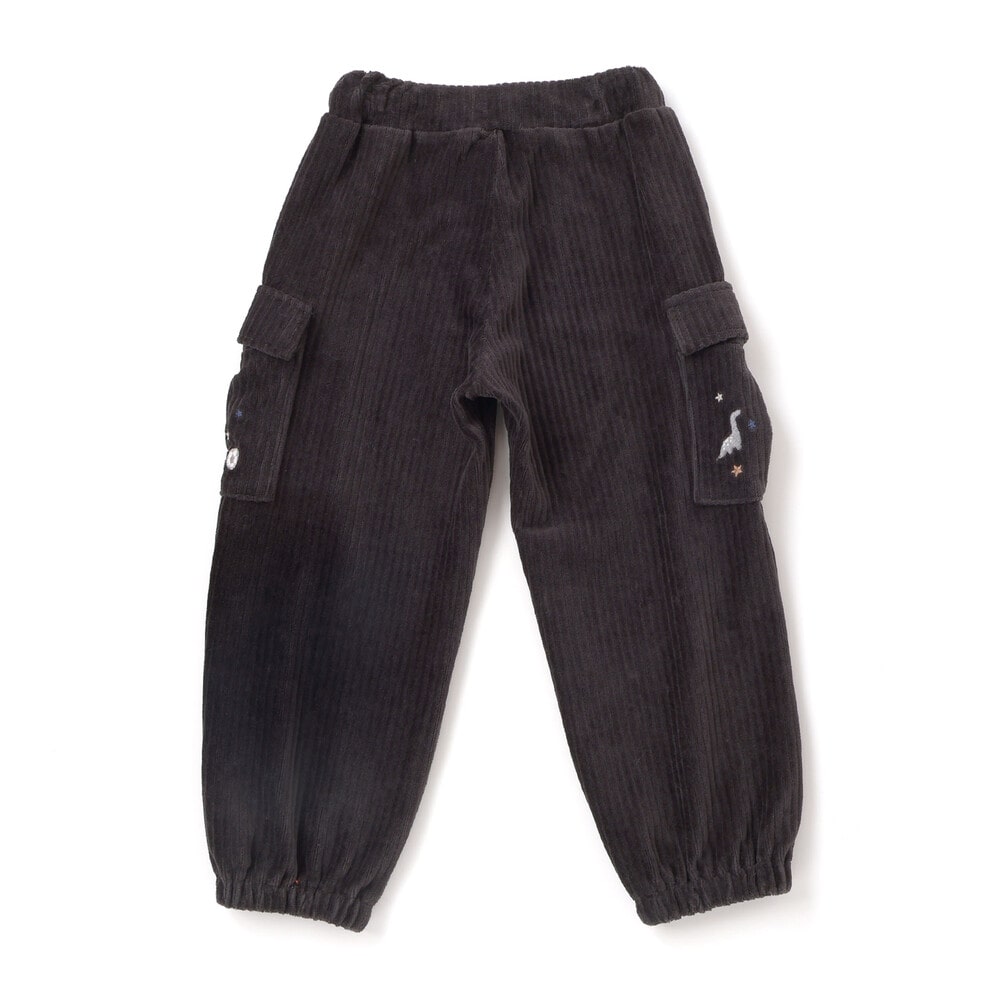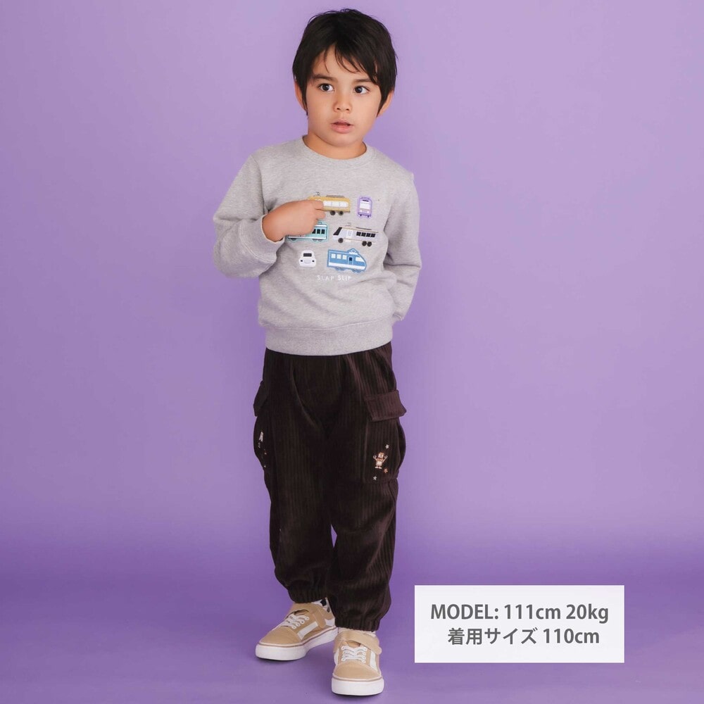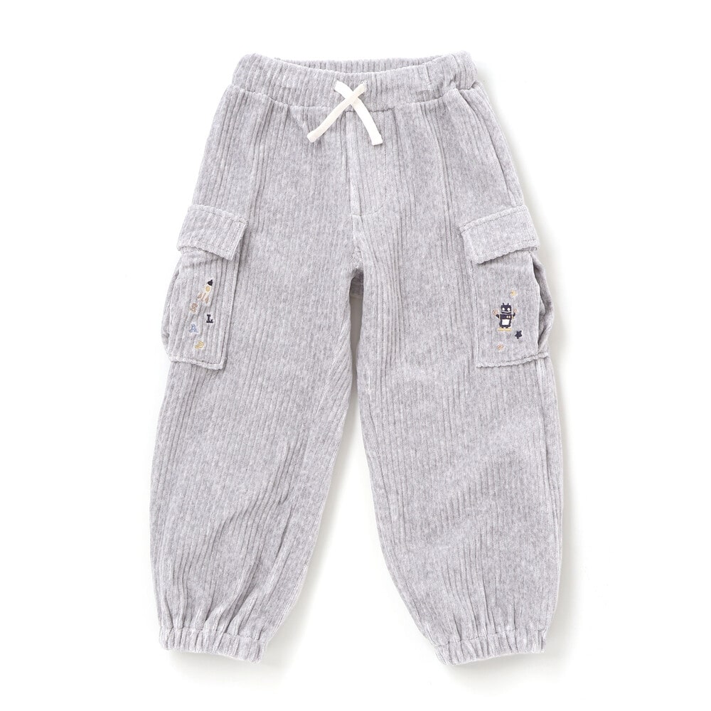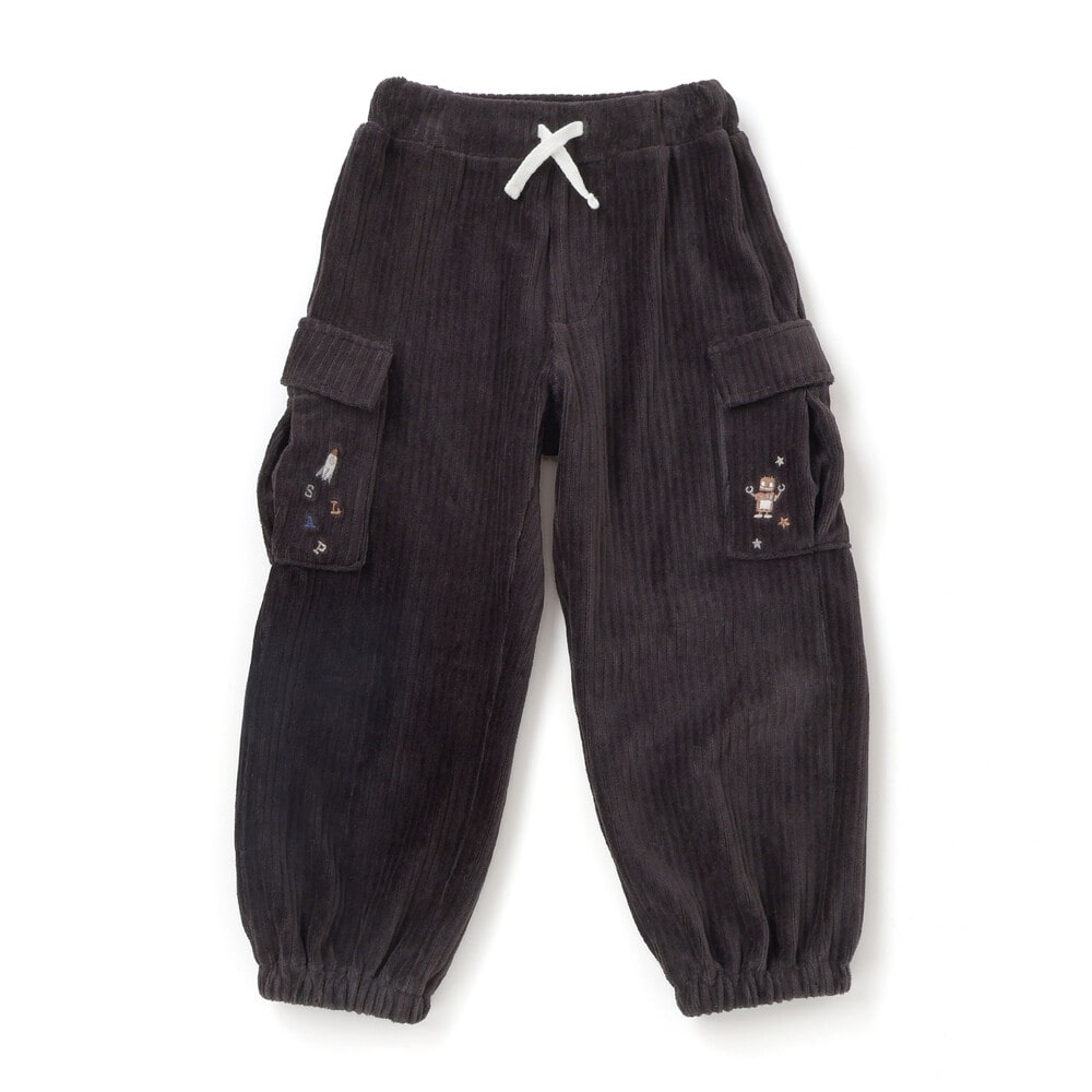 両サイドにはフラップ付きのカーゴポケットを配置し、右ポケットにはロケットや恐竜、左ポケットにはロボット・サッカーの刺しゅうをオン。