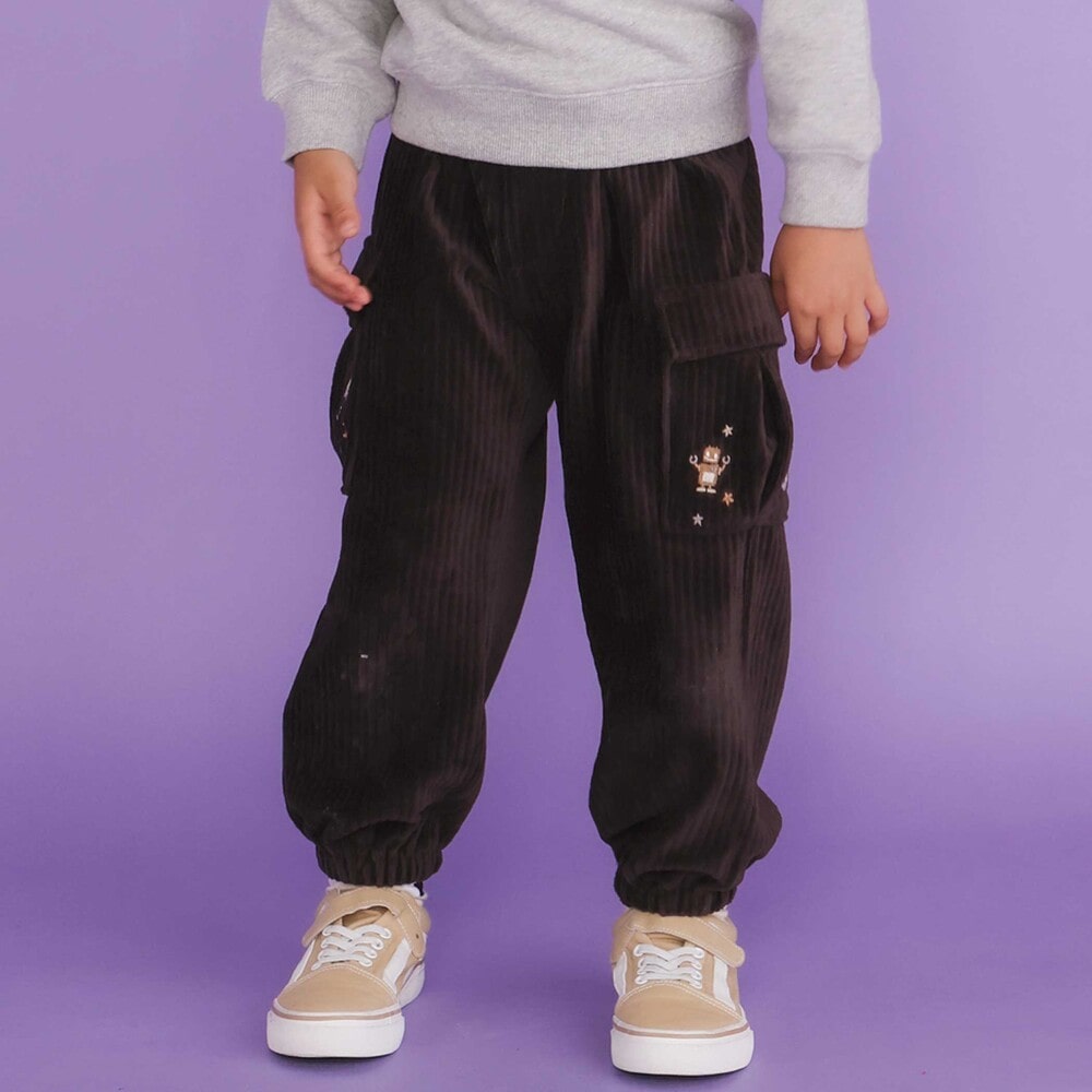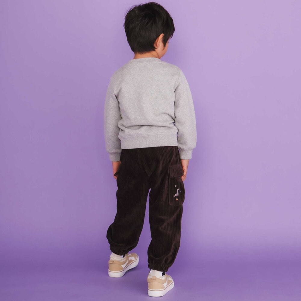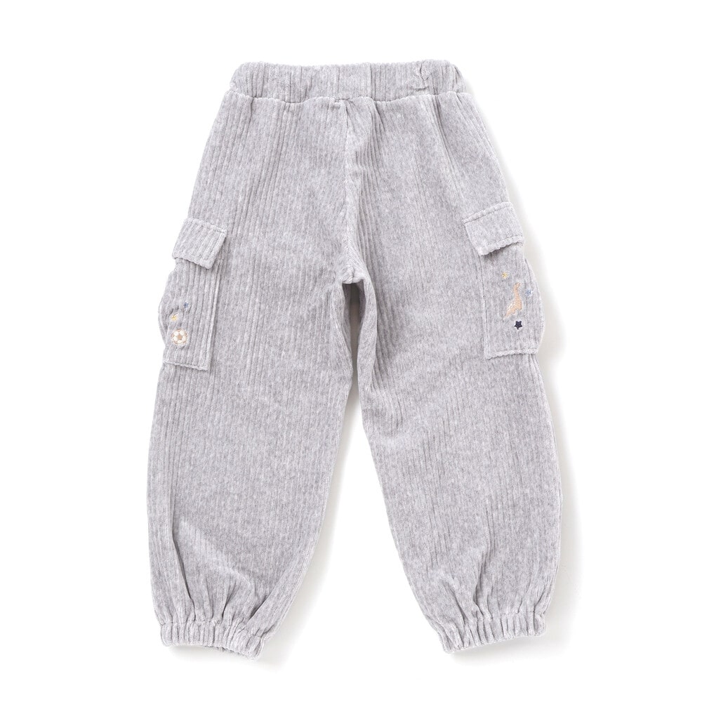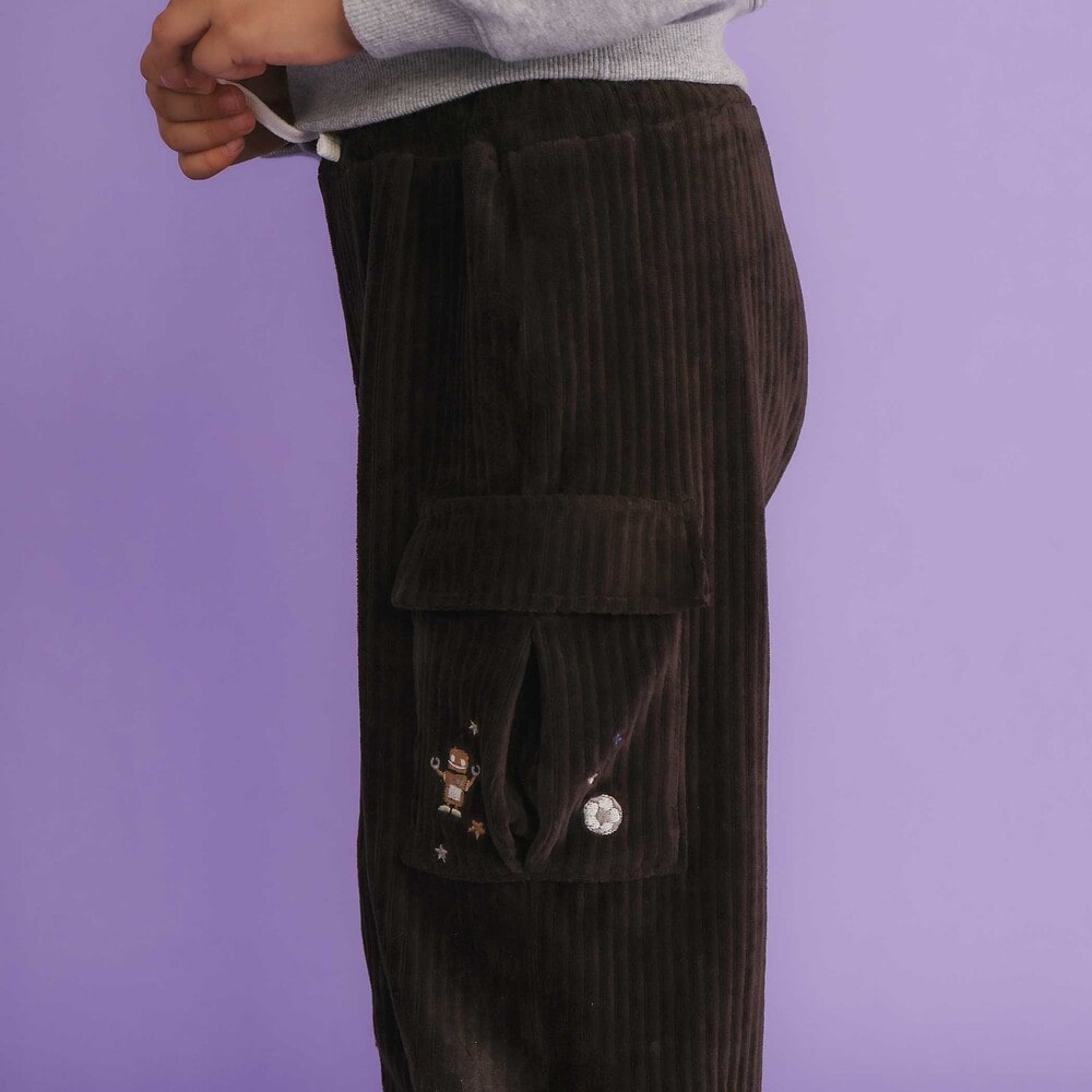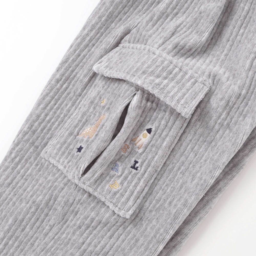 両サイドにはフラップ付きのカーゴポケットを配置し、右ポケットにはロケットや恐竜、左ポケットにはロボット・サッカーの刺しゅうをオン。