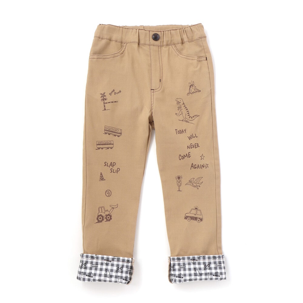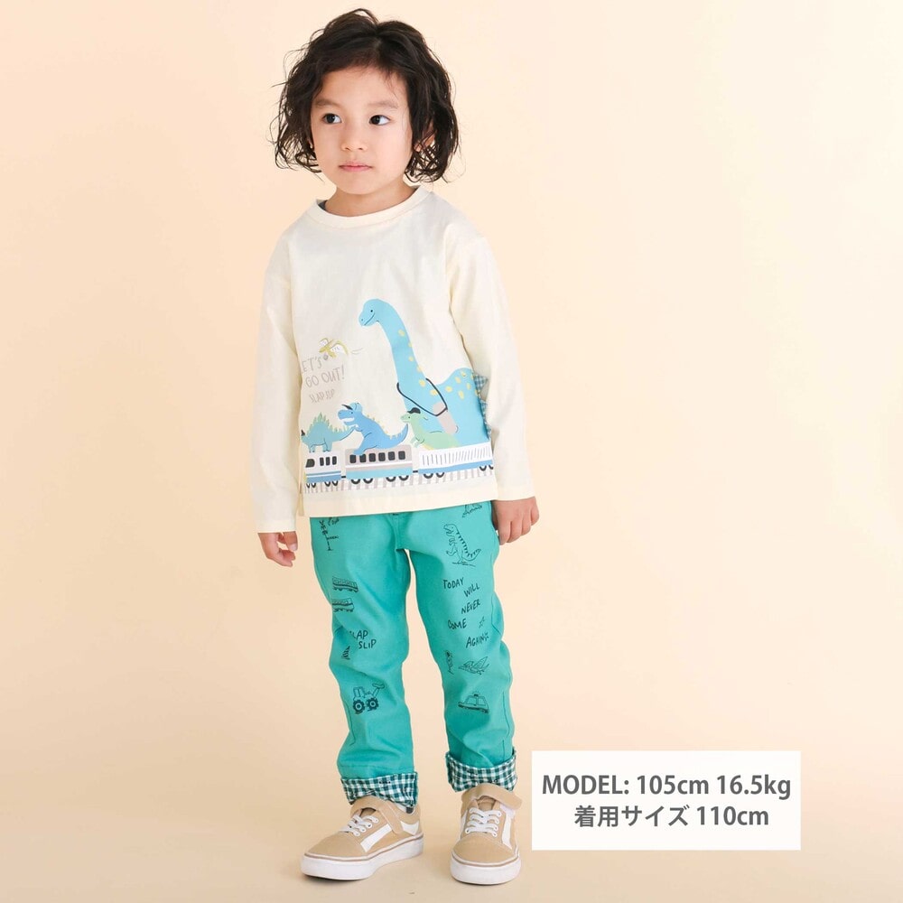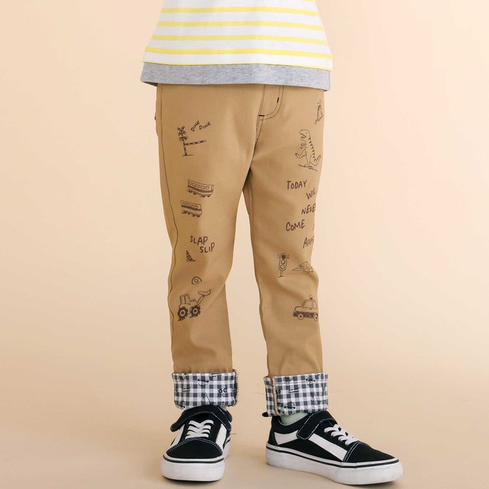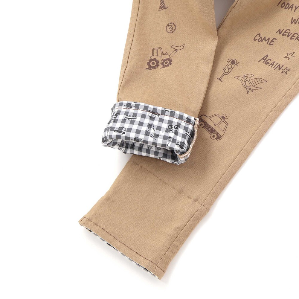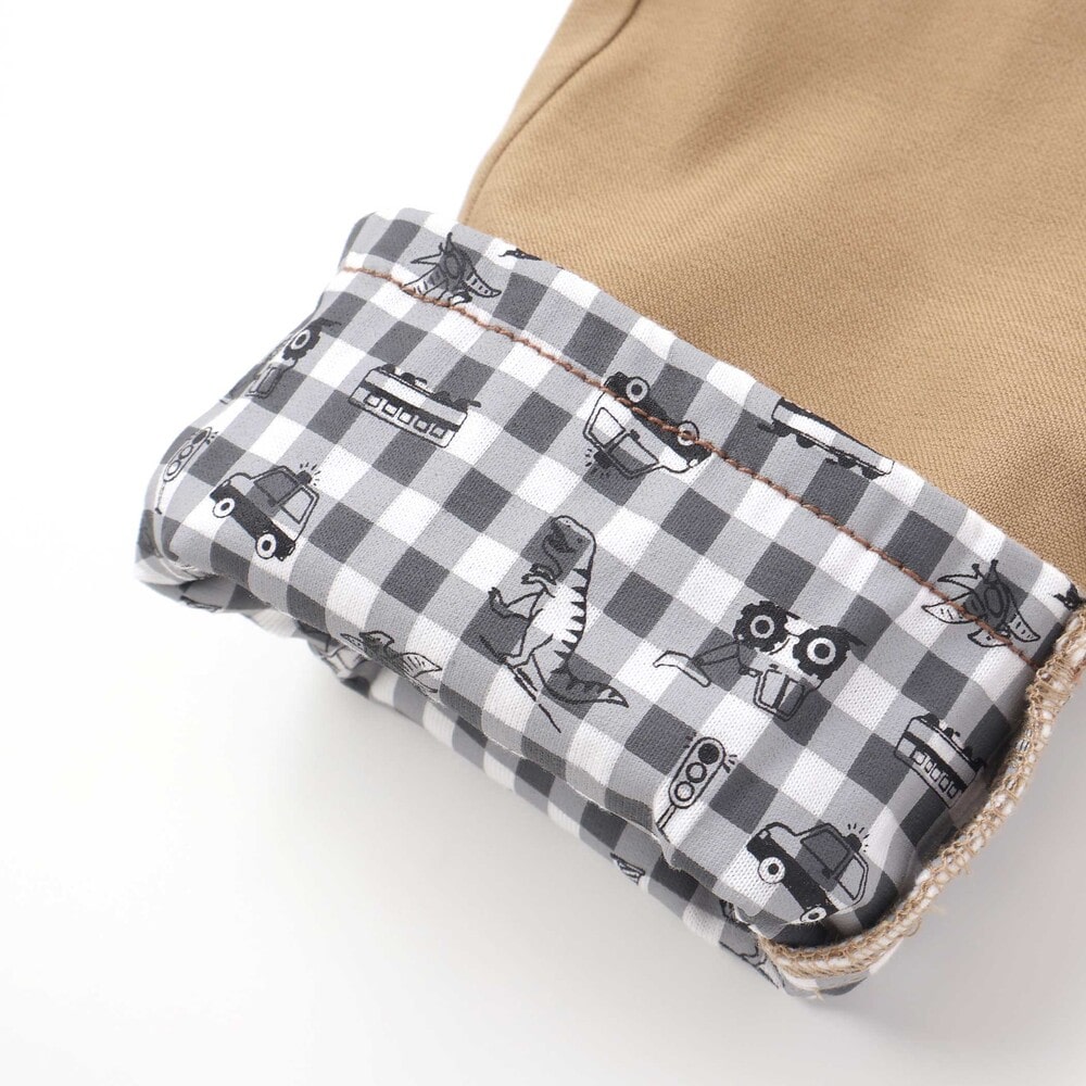 裾を折り返すと、チェック柄をベースに恐竜やはたらく車を散りばめた総柄デザインが現れ、コーディネートに遊び心をプラス。