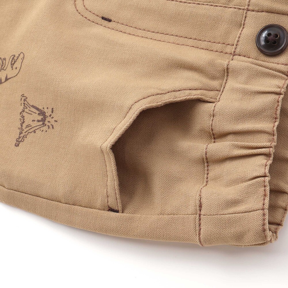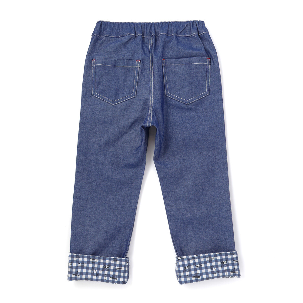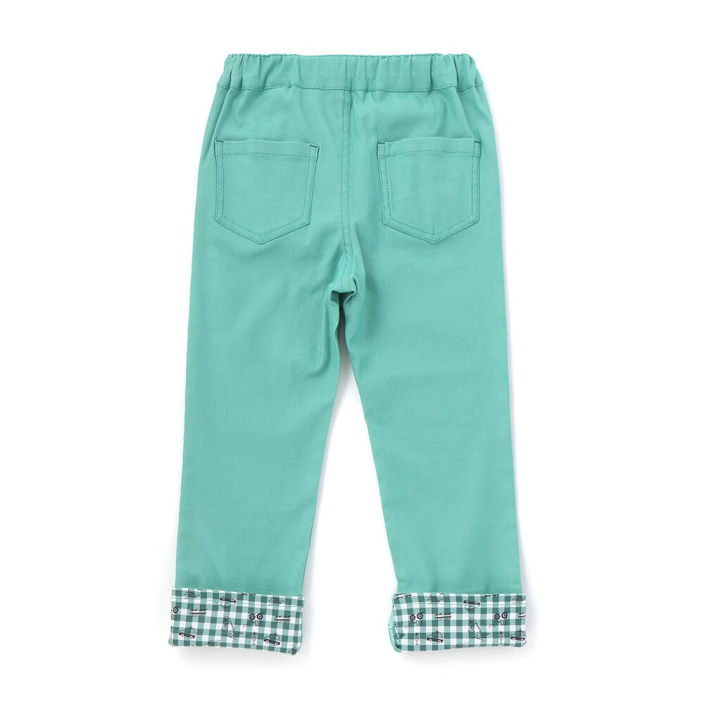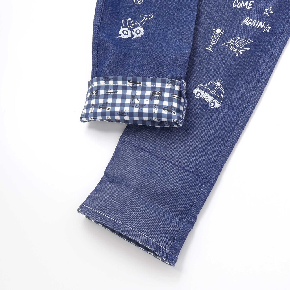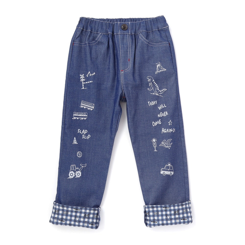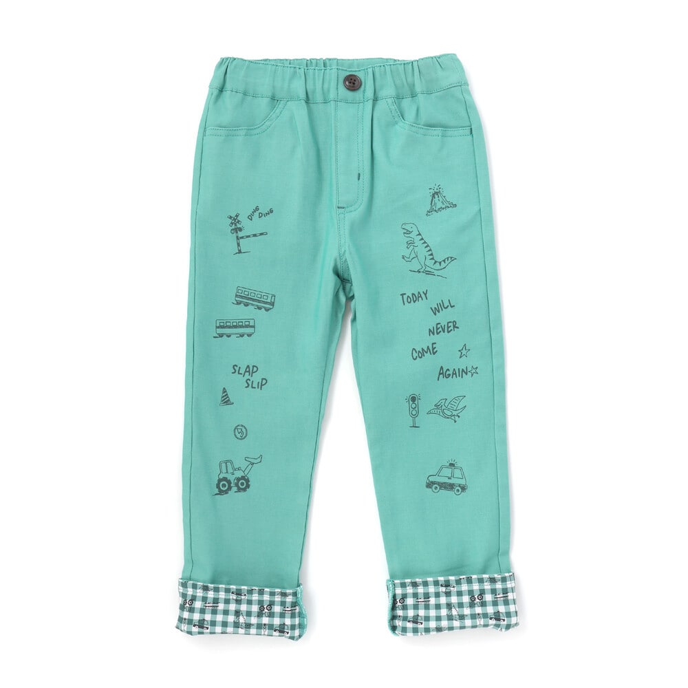裾を折り返すと、チェック柄をベースに恐竜やはたらく車を散りばめた総柄デザインが現れ、コーディネートに遊び心をプラス。