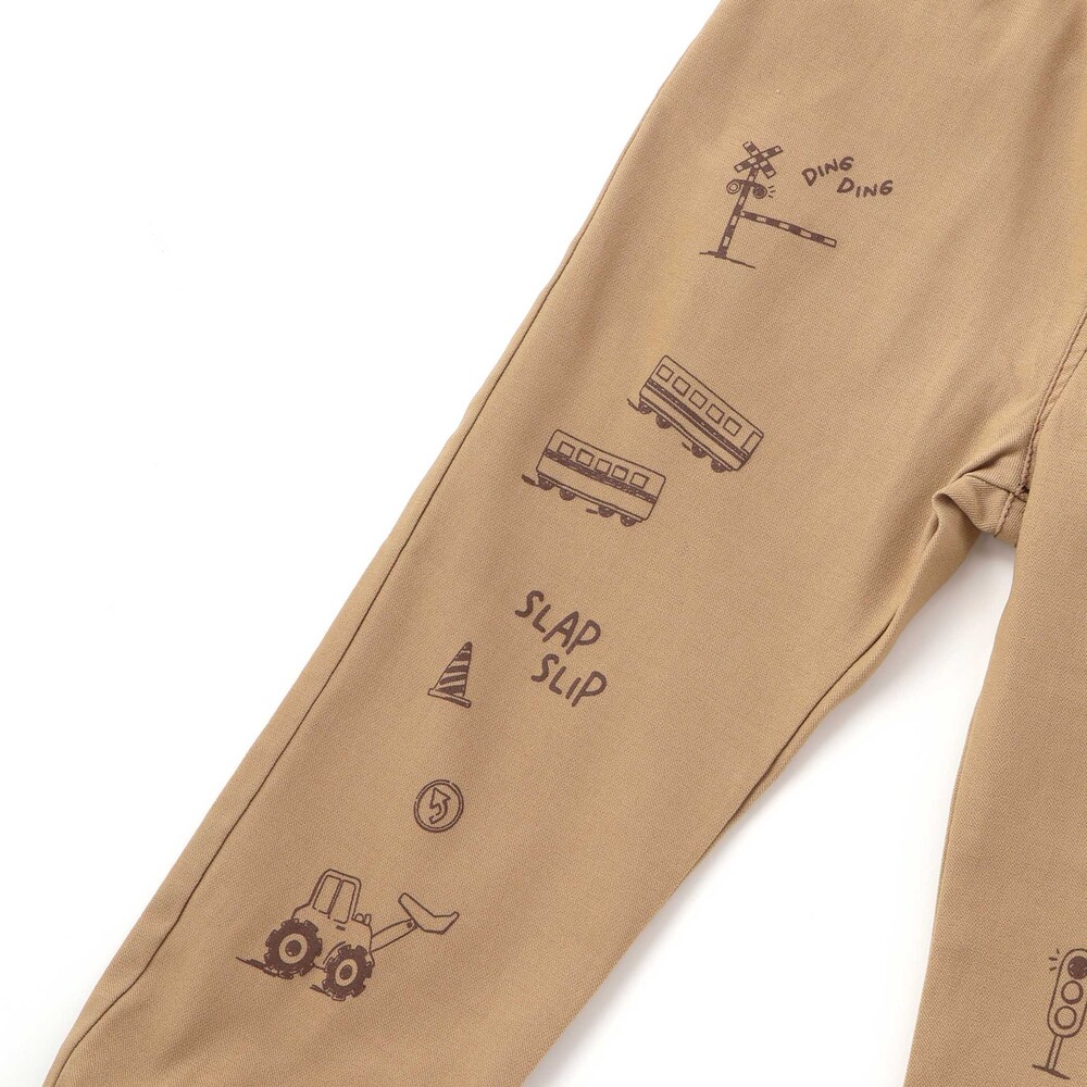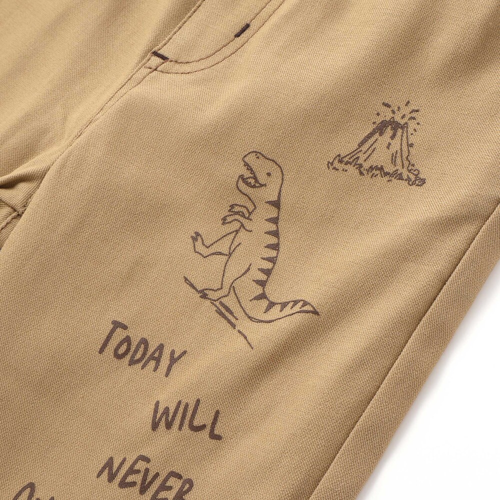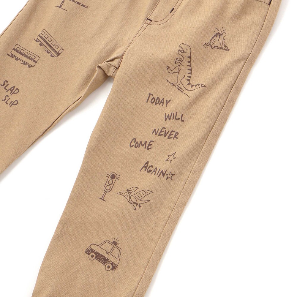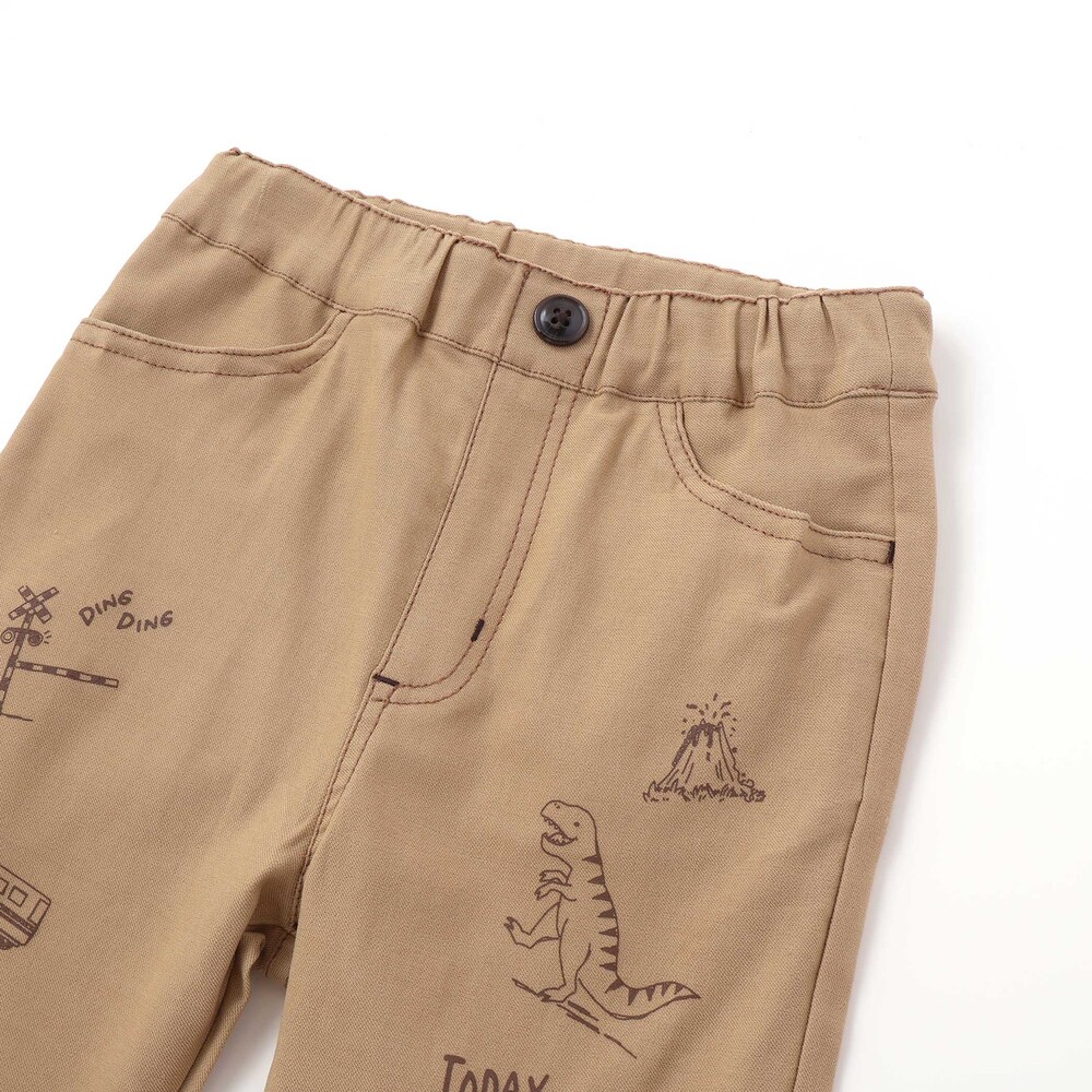 両足にプリントされたはたらく車と恐竜モチーフが目を引く、個性的な男の子用パンツ。