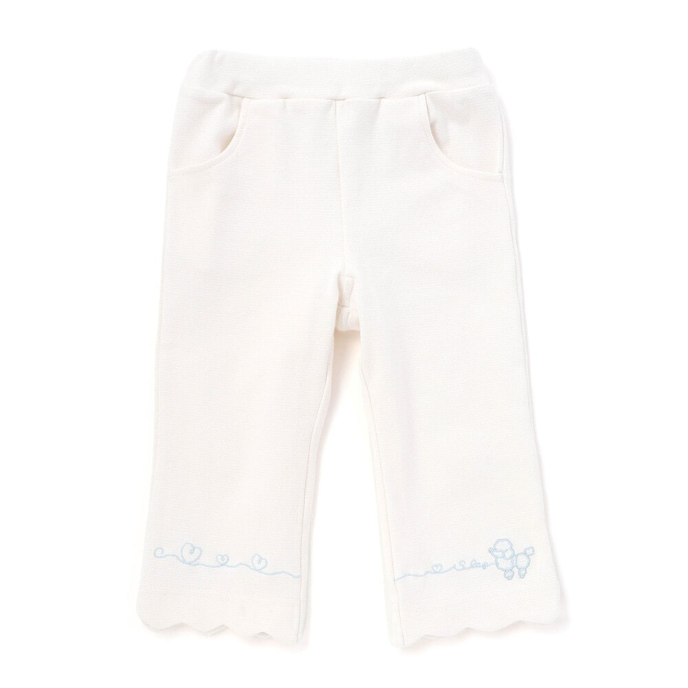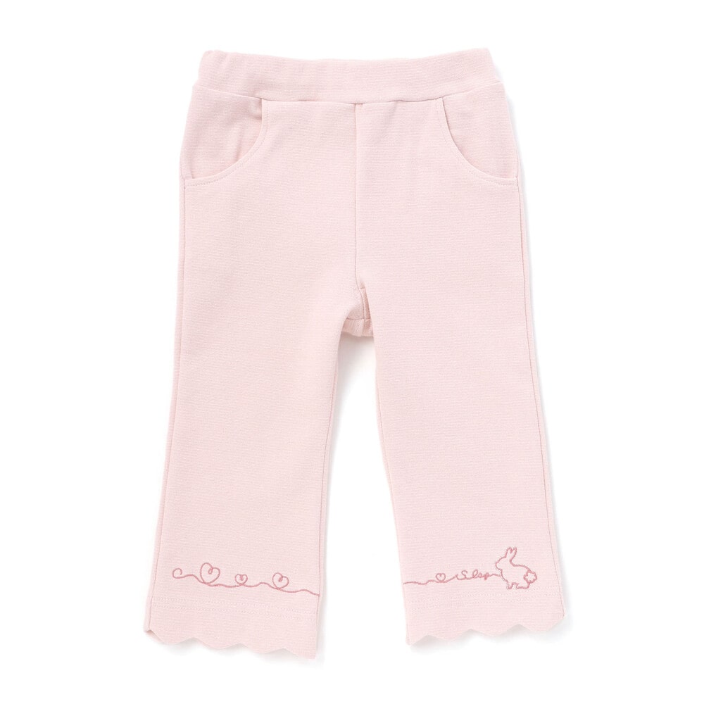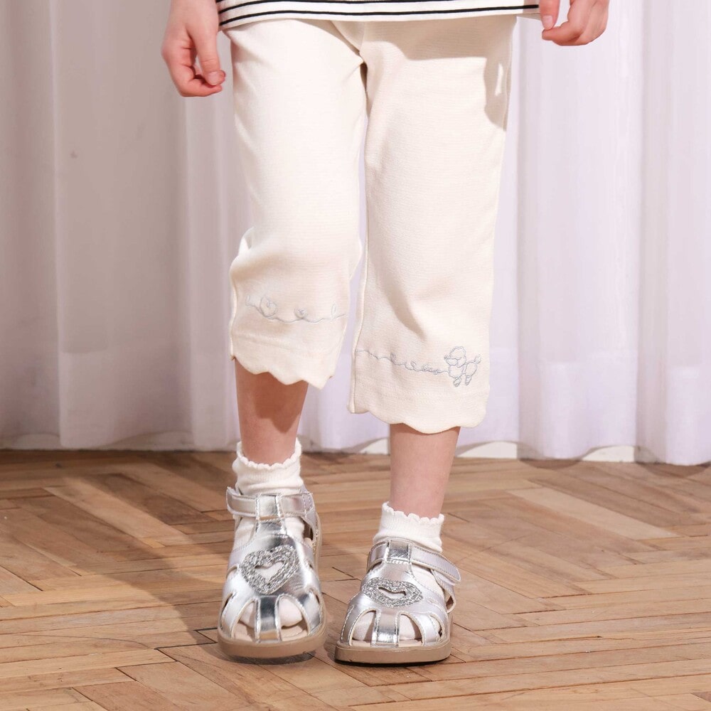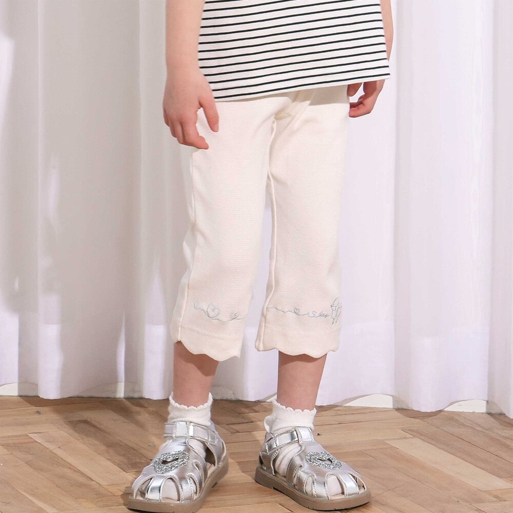 裾のスカラップデザインに、カラーごとに異なる刺しゅうをあしらった、とってもキュートな女の子用7分丈パンツ。