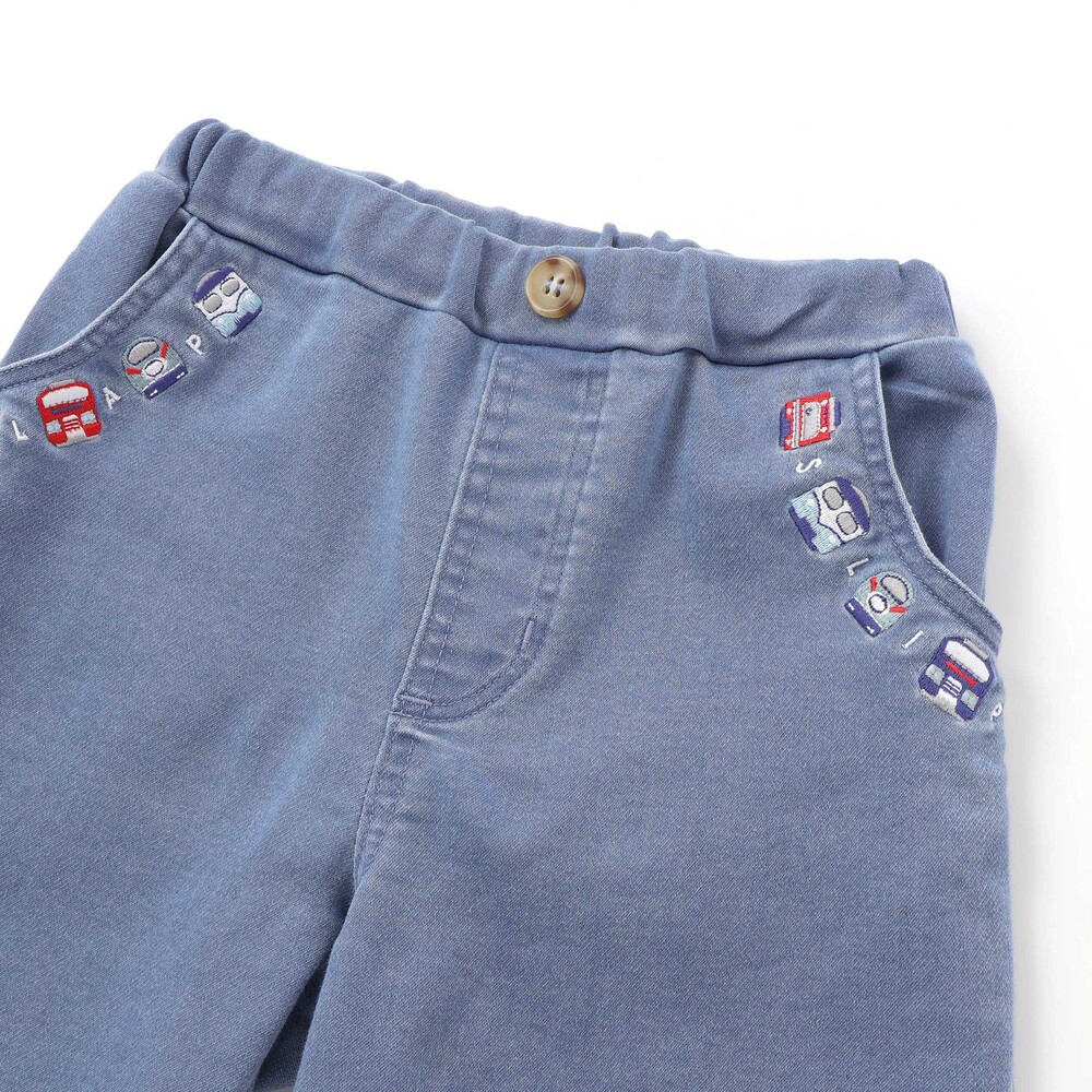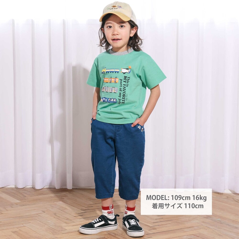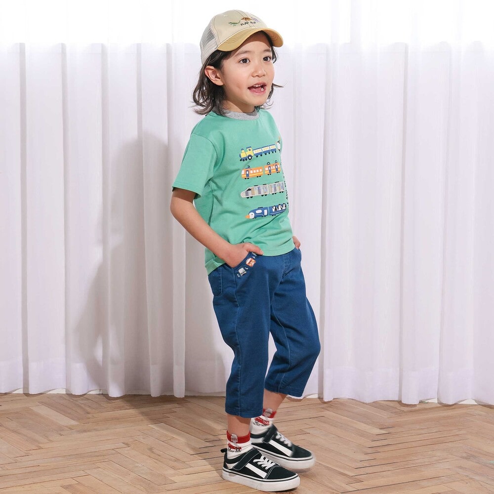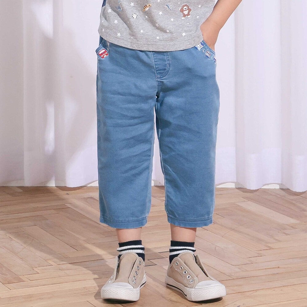 ポケット口にあしらった電車の刺しゅうが目を惹く、男の子用7分丈デニムパンツ。