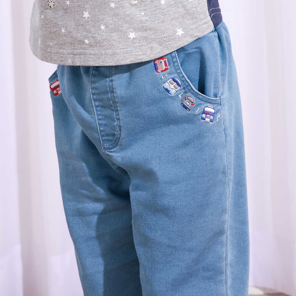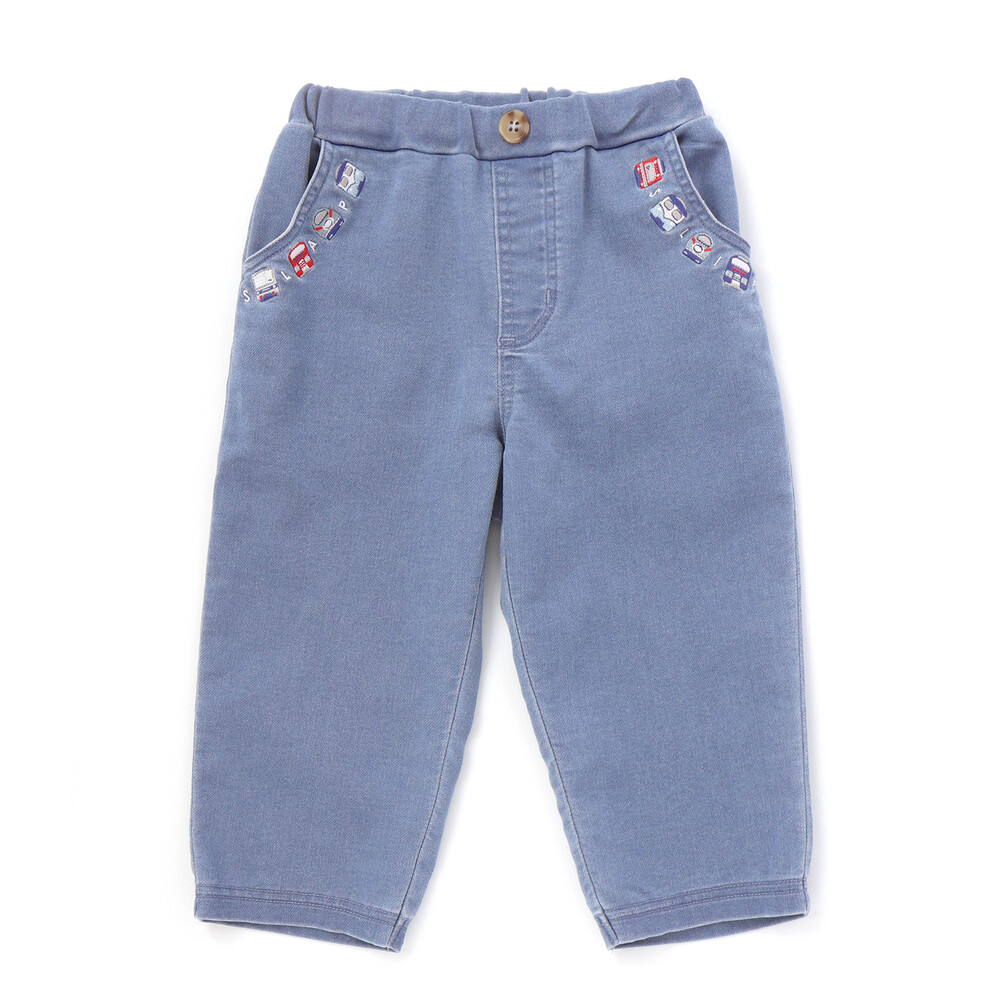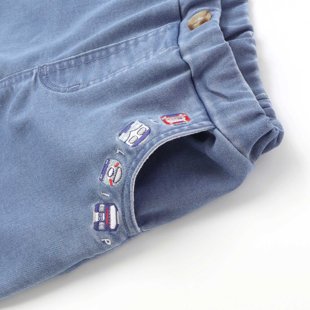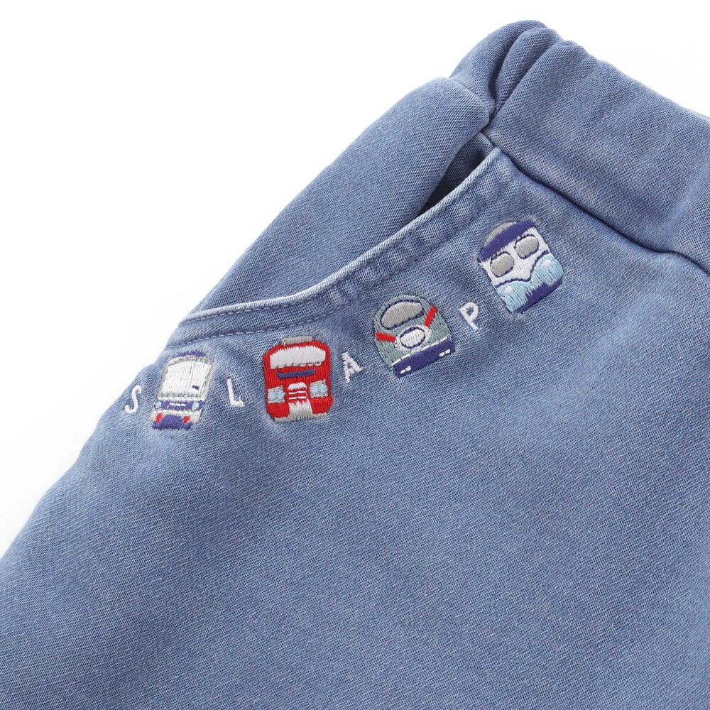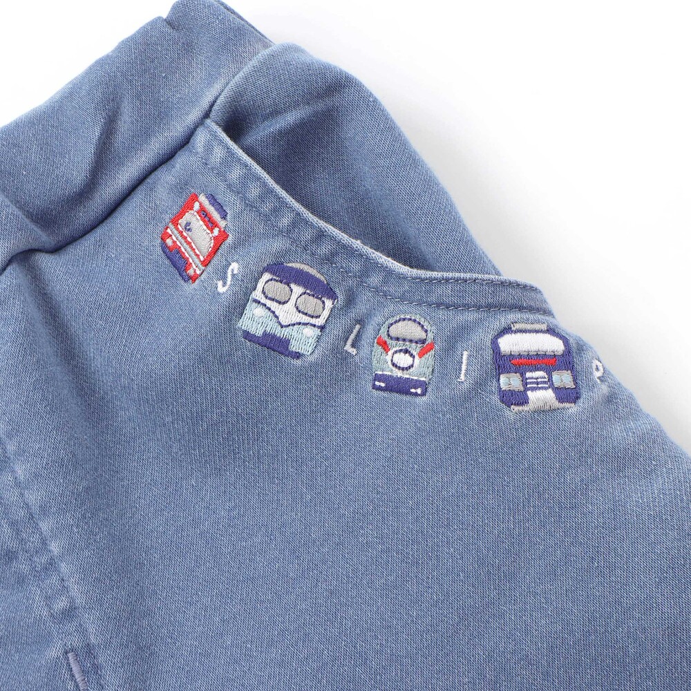 ポケット口にあしらった電車の刺しゅうが目を惹く、男の子用7分丈デニムパンツ。