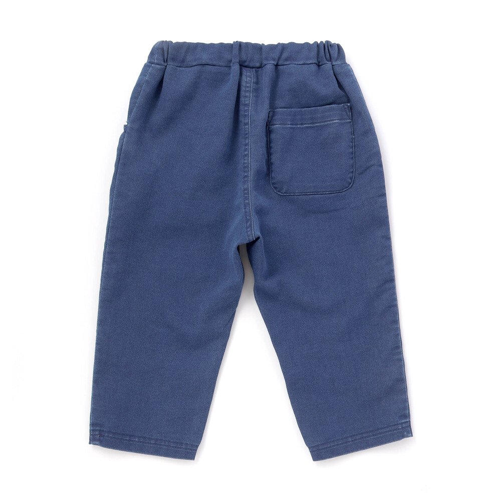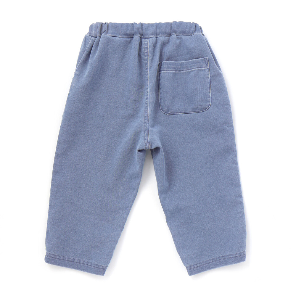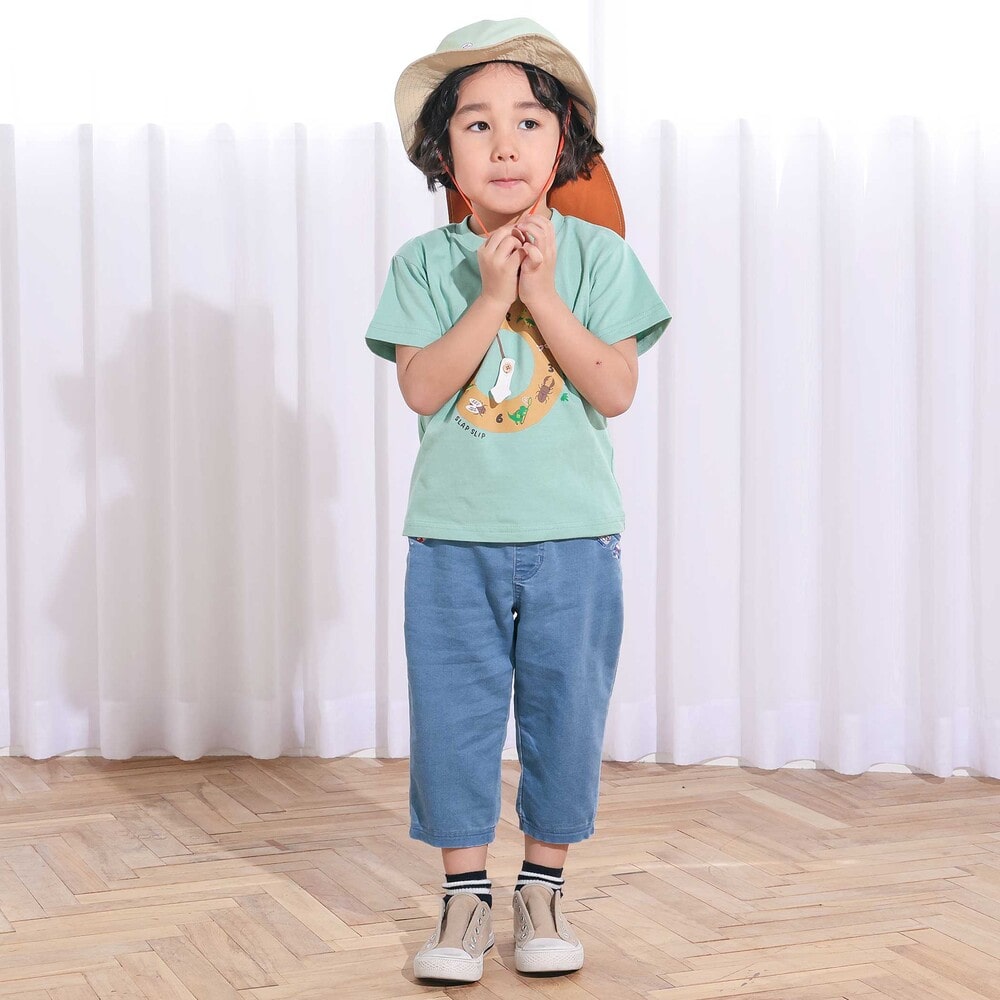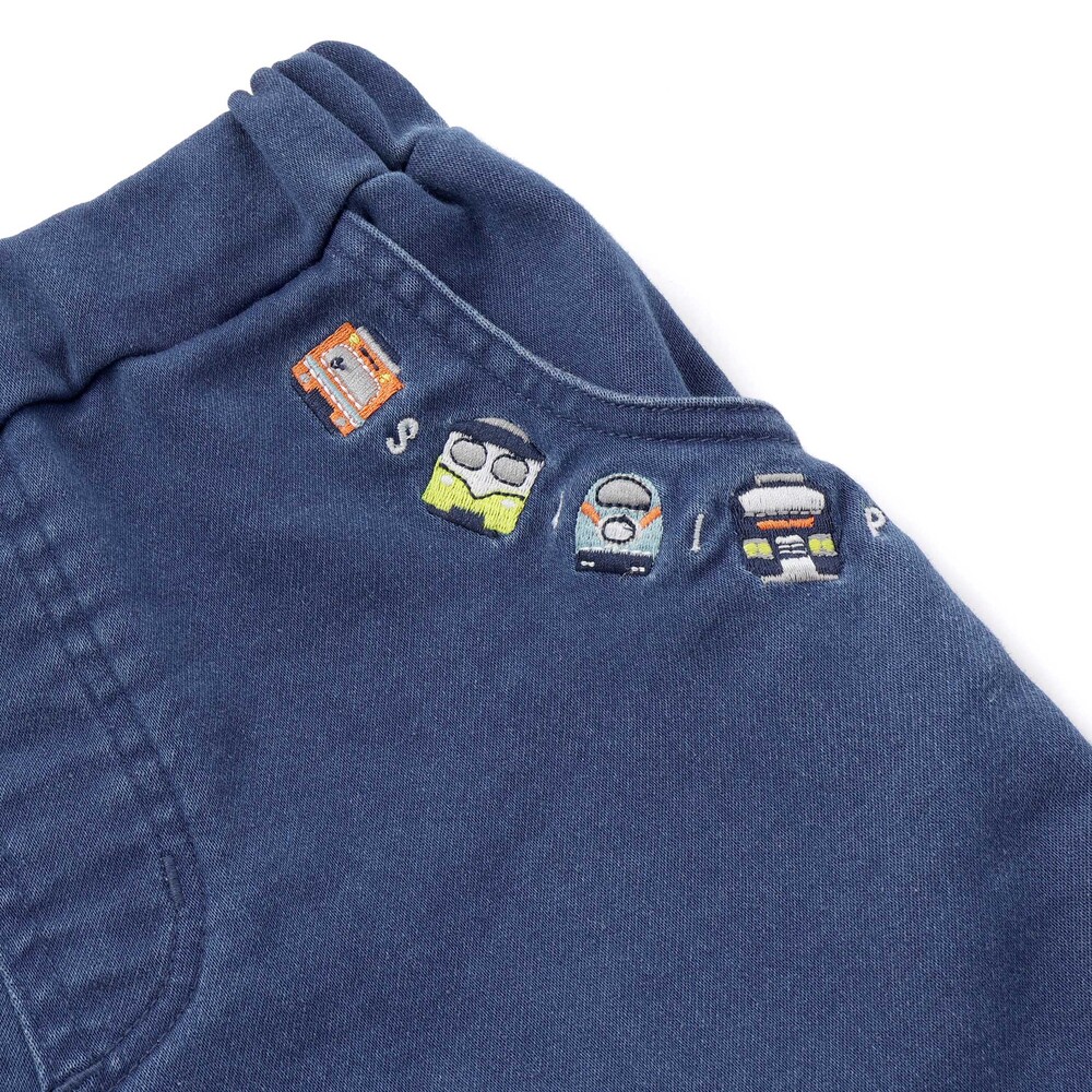 ポケット口にあしらった電車の刺しゅうが目を惹く、男の子用7分丈デニムパンツ。