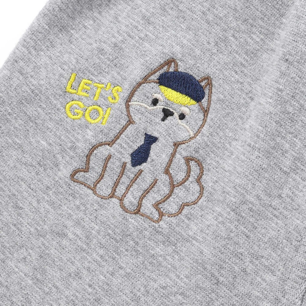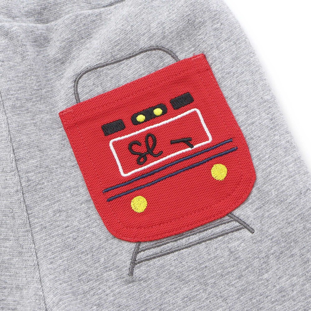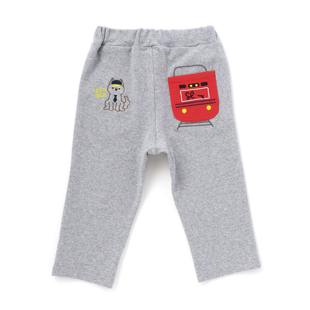 グレーは、車掌になったイヌの刺しゅうと電車モチーフのポケットがセットに。
