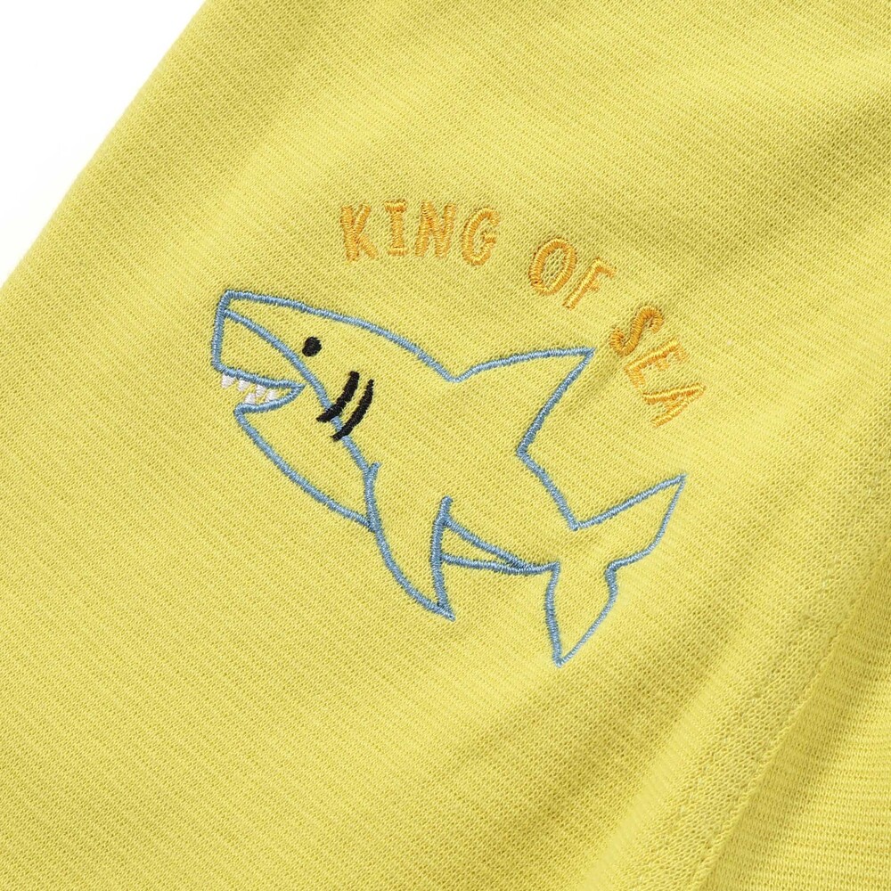 イエローは、海を自由に泳ぐサメの刺しゅうに、潜水艦モチーフのポケットをプラス。