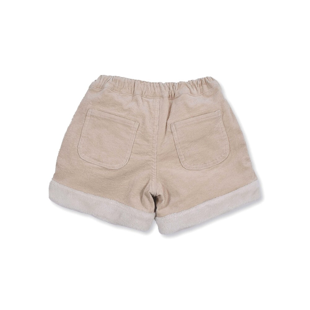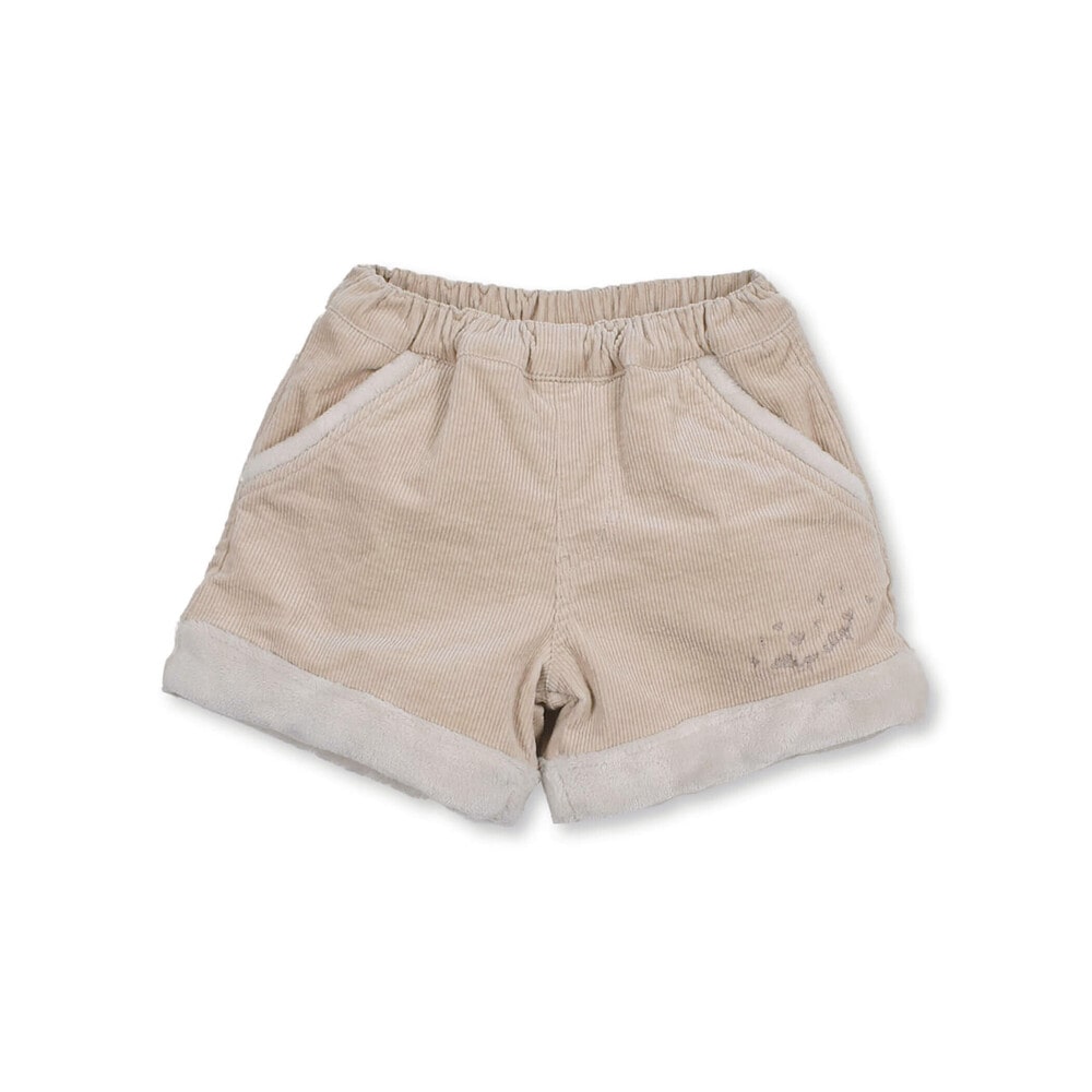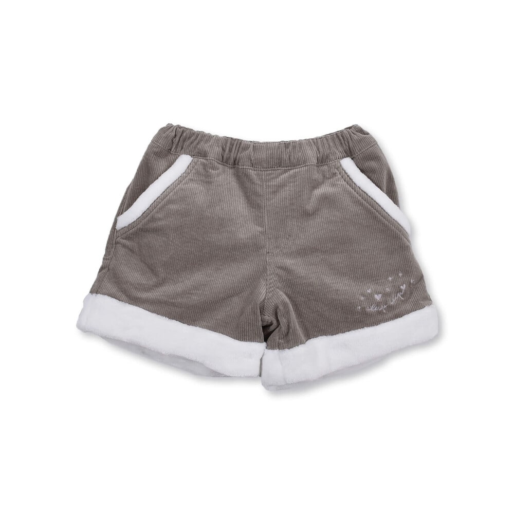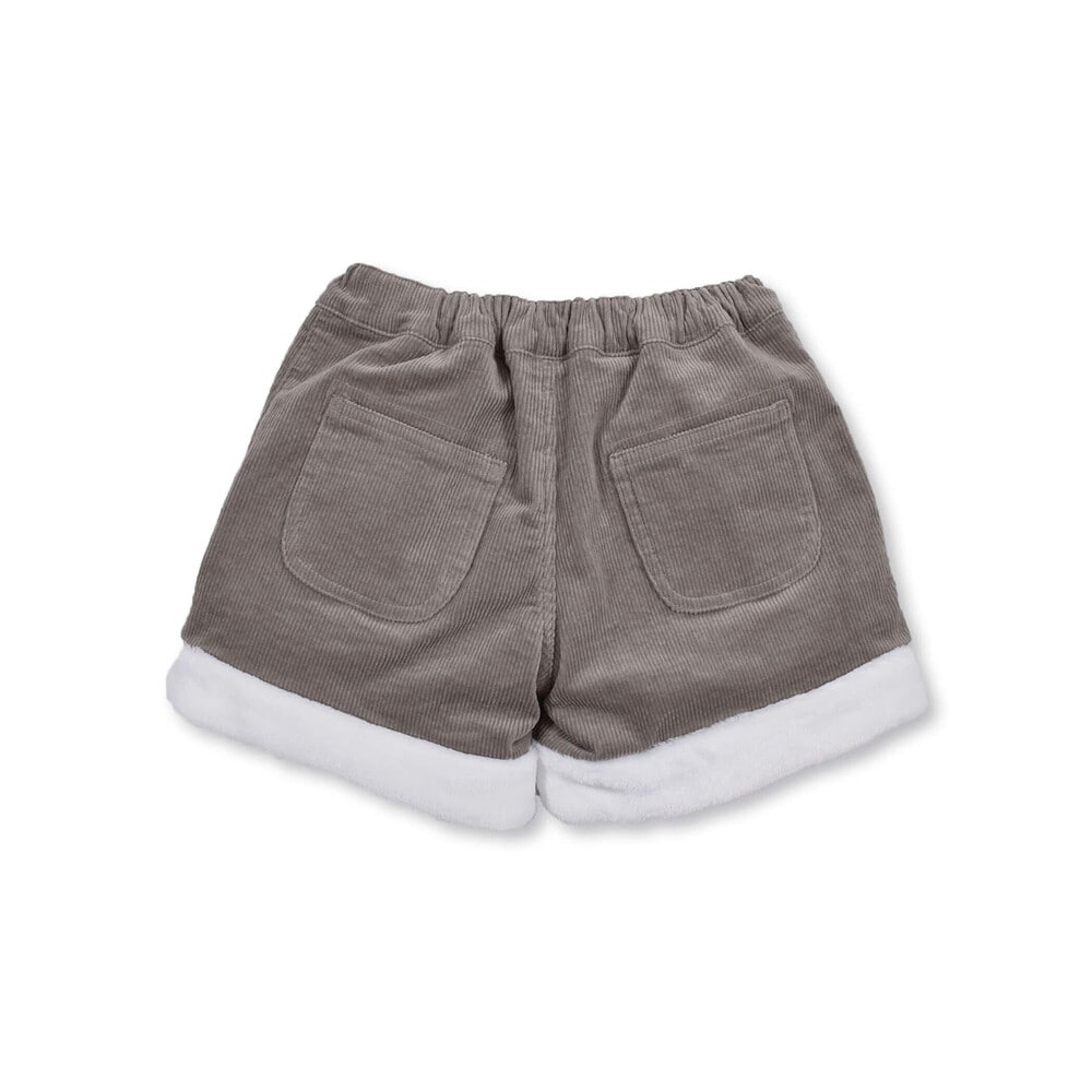 裾とポケットにふわふわのボアが付いた女の子用、コールテンのショートパンツ。