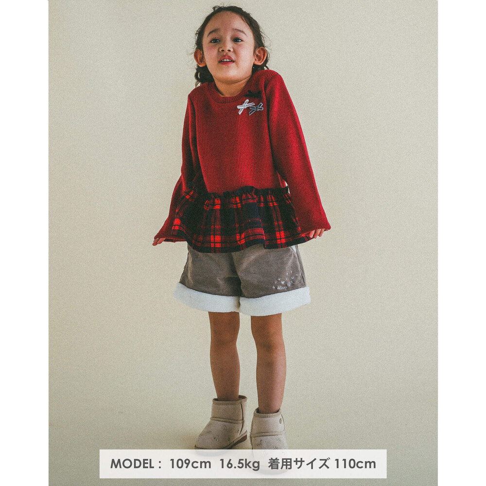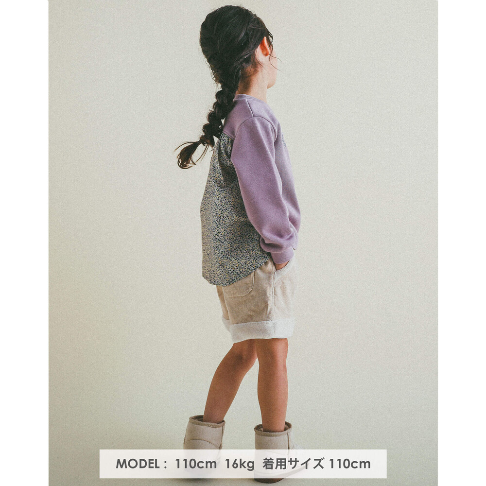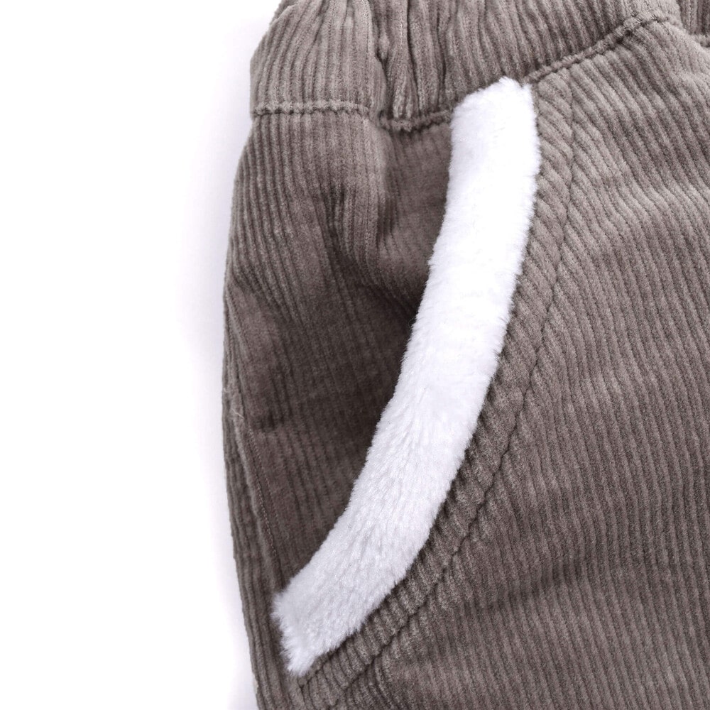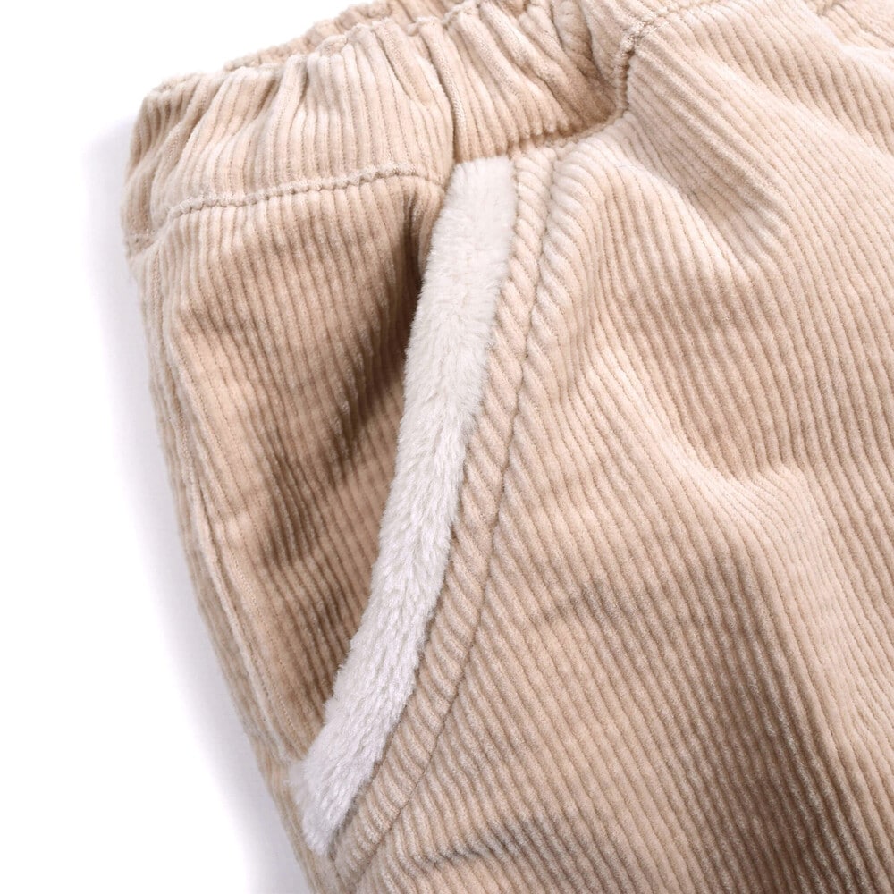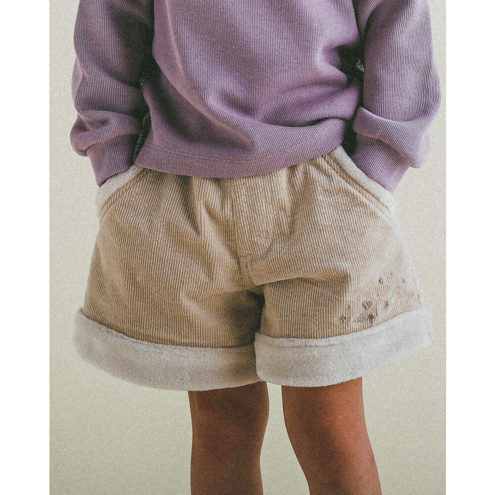 裾とポケットにふわふわのボアが付いた女の子用、コールテンのショートパンツ。
