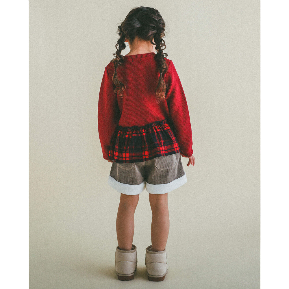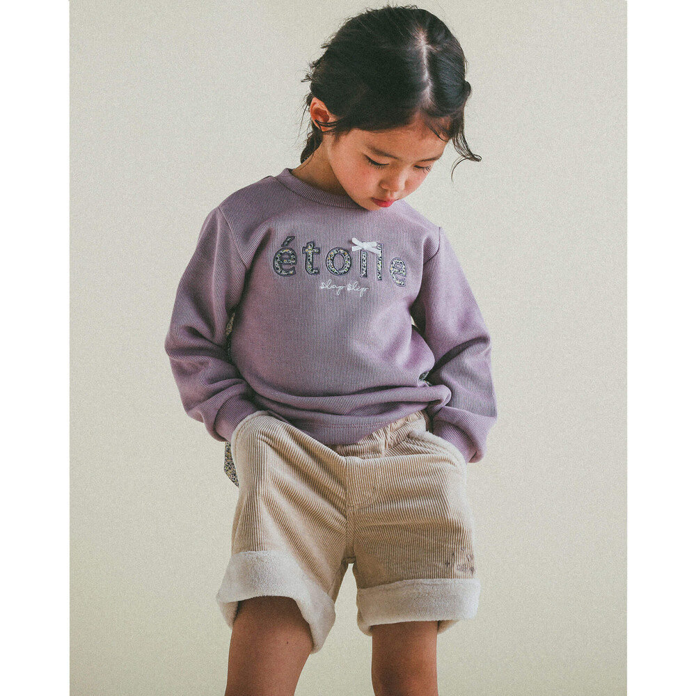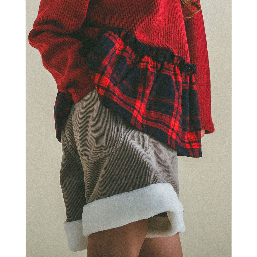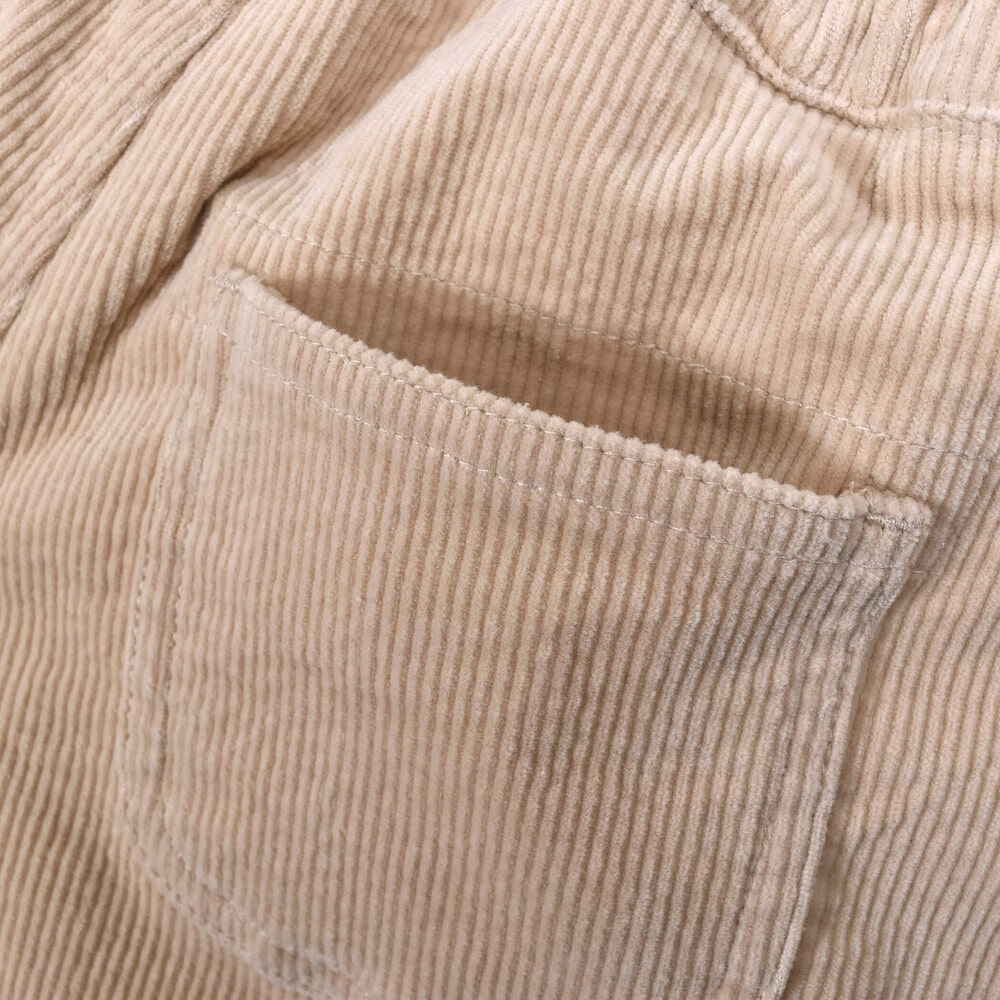 裾とポケットにふわふわのボアが付いた女の子用、コールテンのショートパンツ。