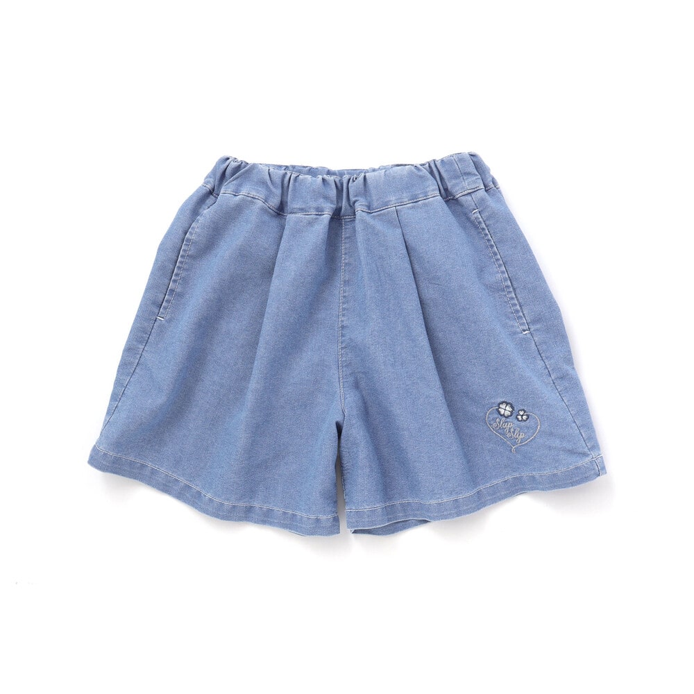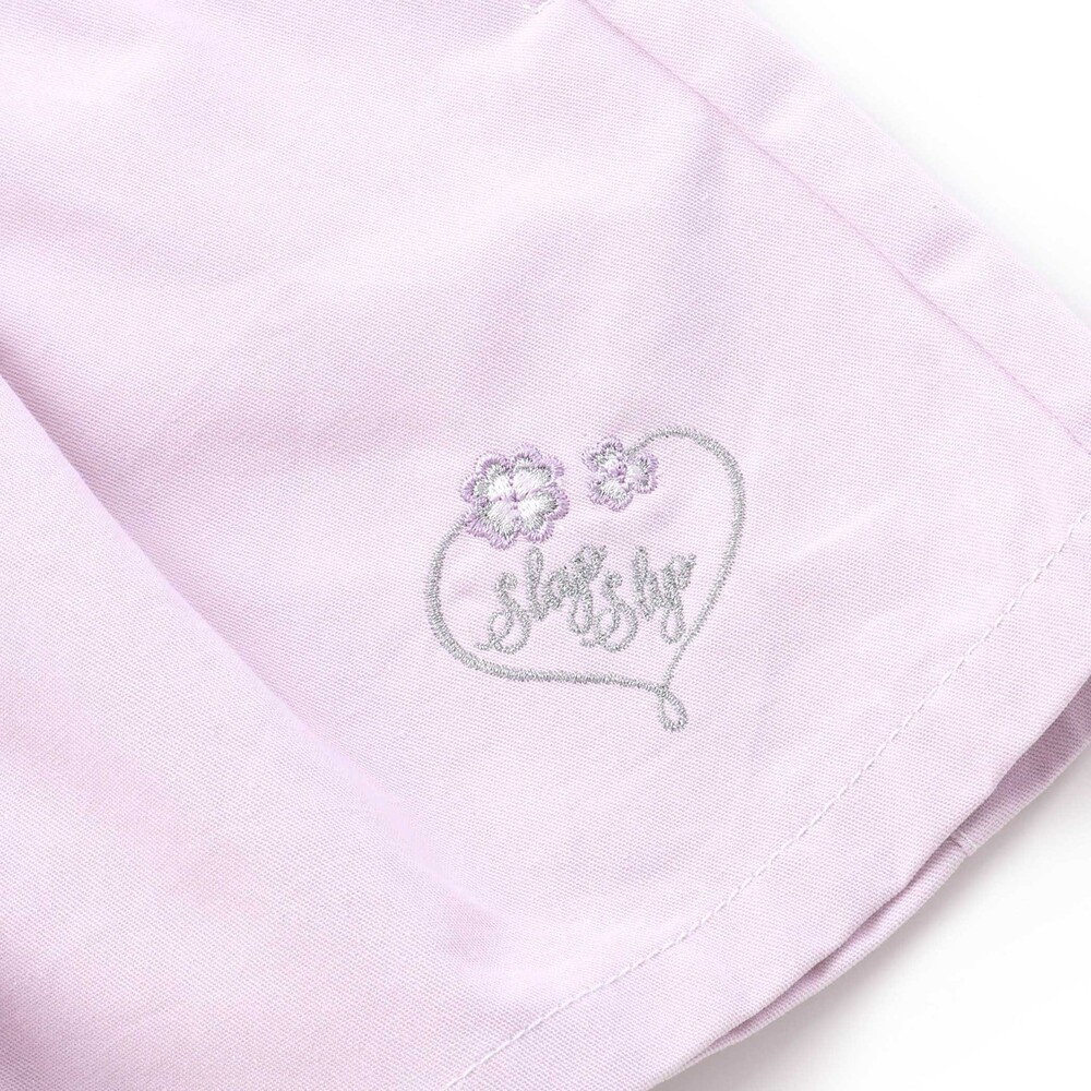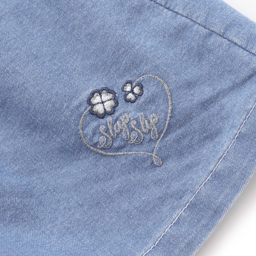 フロント左裾には、ハート型になった四つ葉とロゴ刺しゅうをちょこんと添えて、さりげないアクセントに。