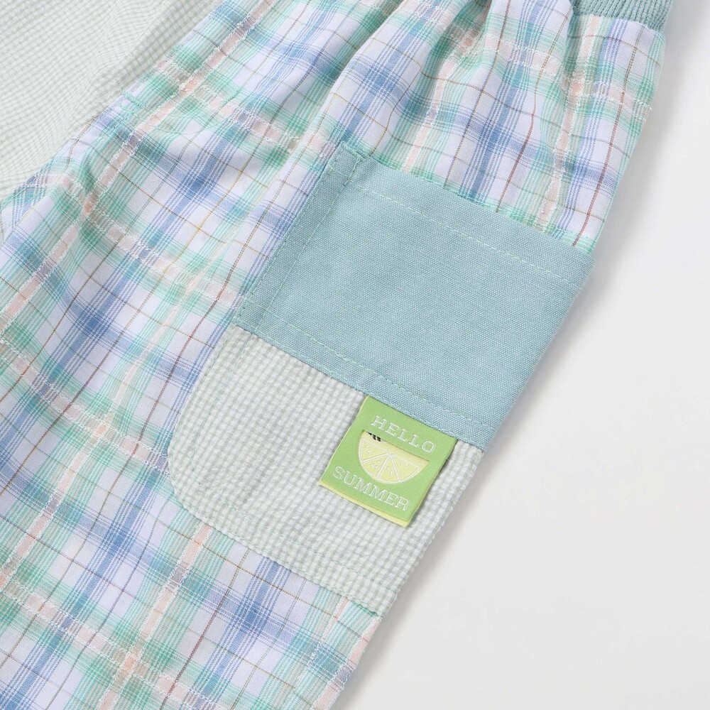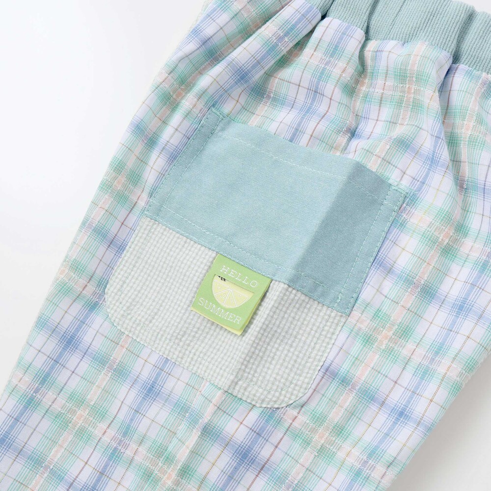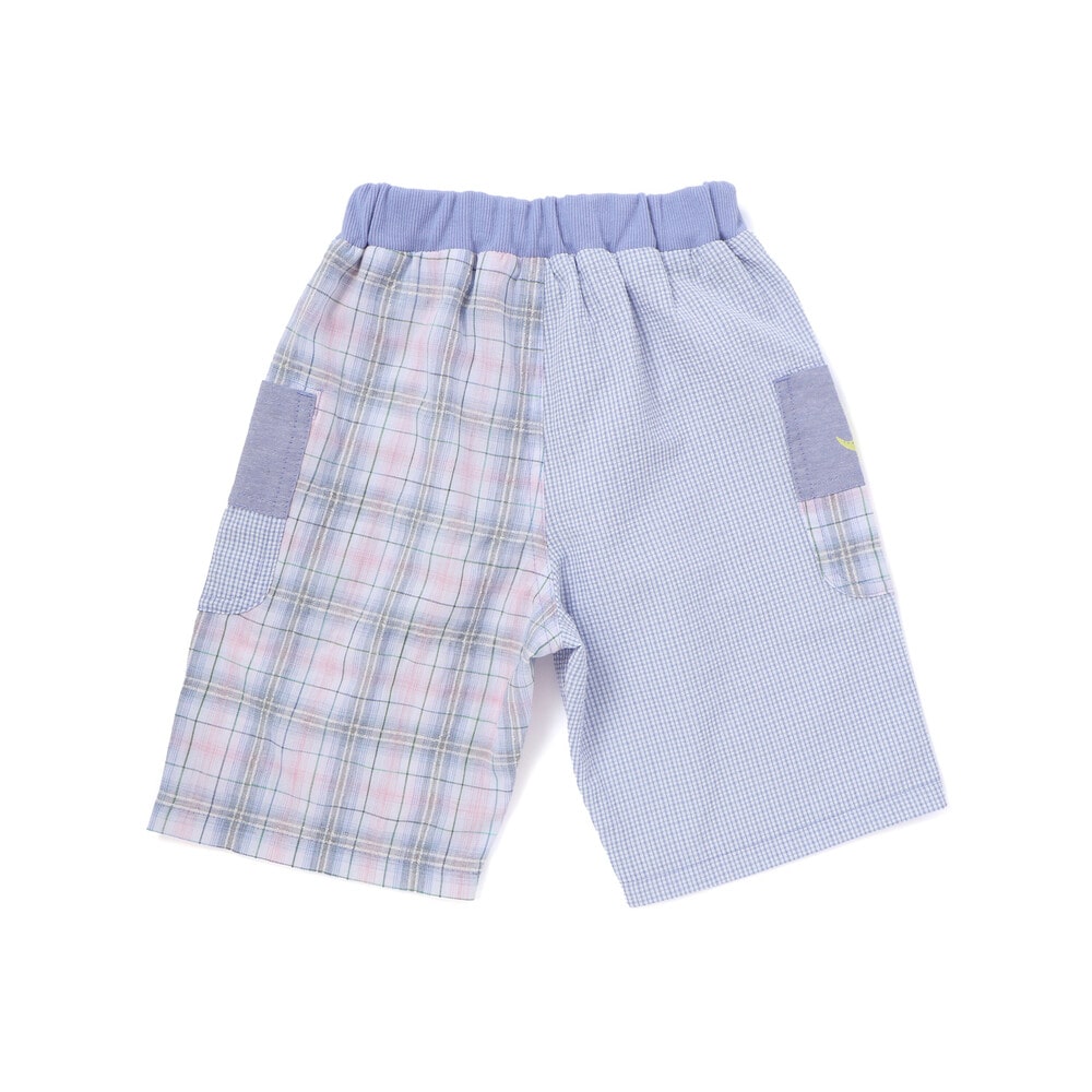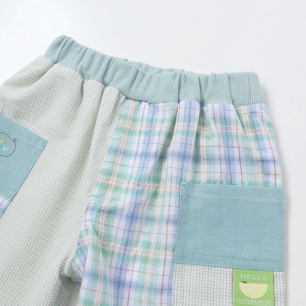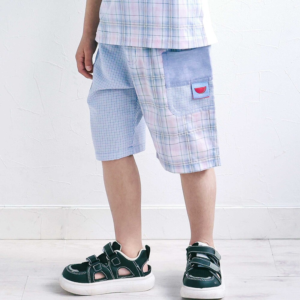 チェック柄の切り替えがぱっと目を惹く、元気いっぱいの男の子用5分丈パンツ。
