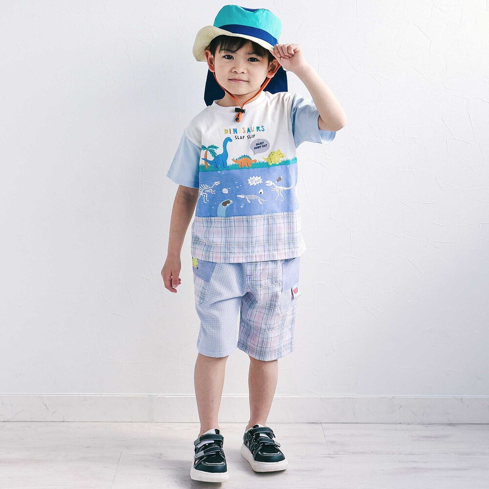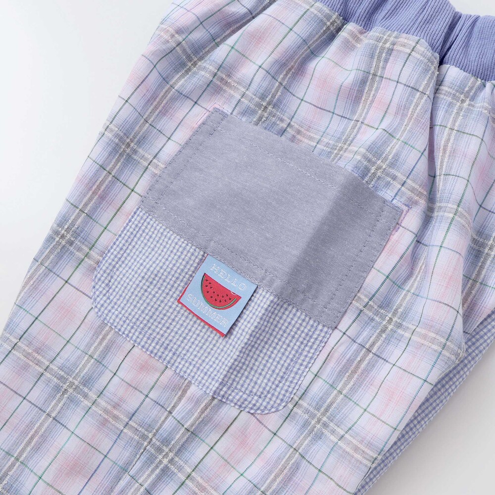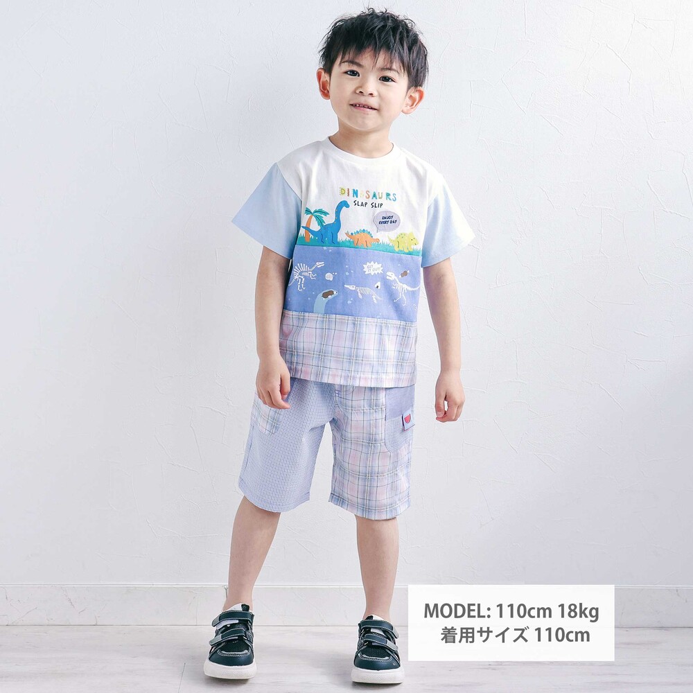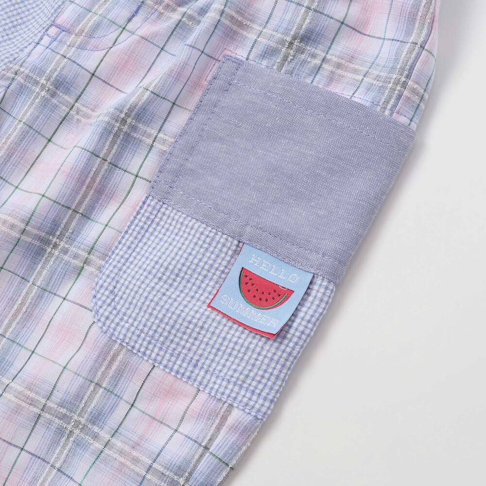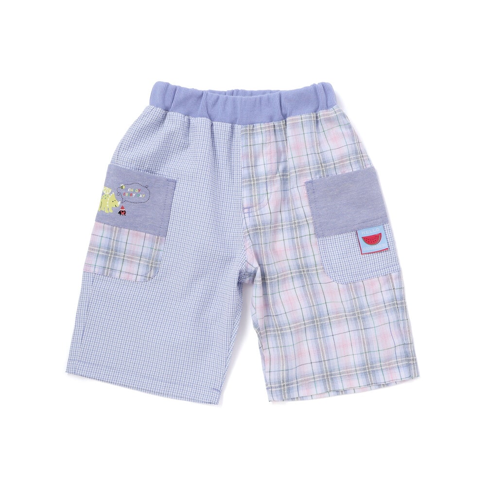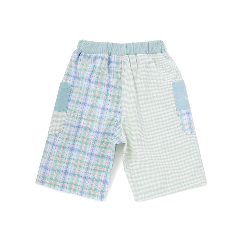 チェック柄の切り替えがぱっと目を惹く、元気いっぱいの男の子用5分丈パンツ。