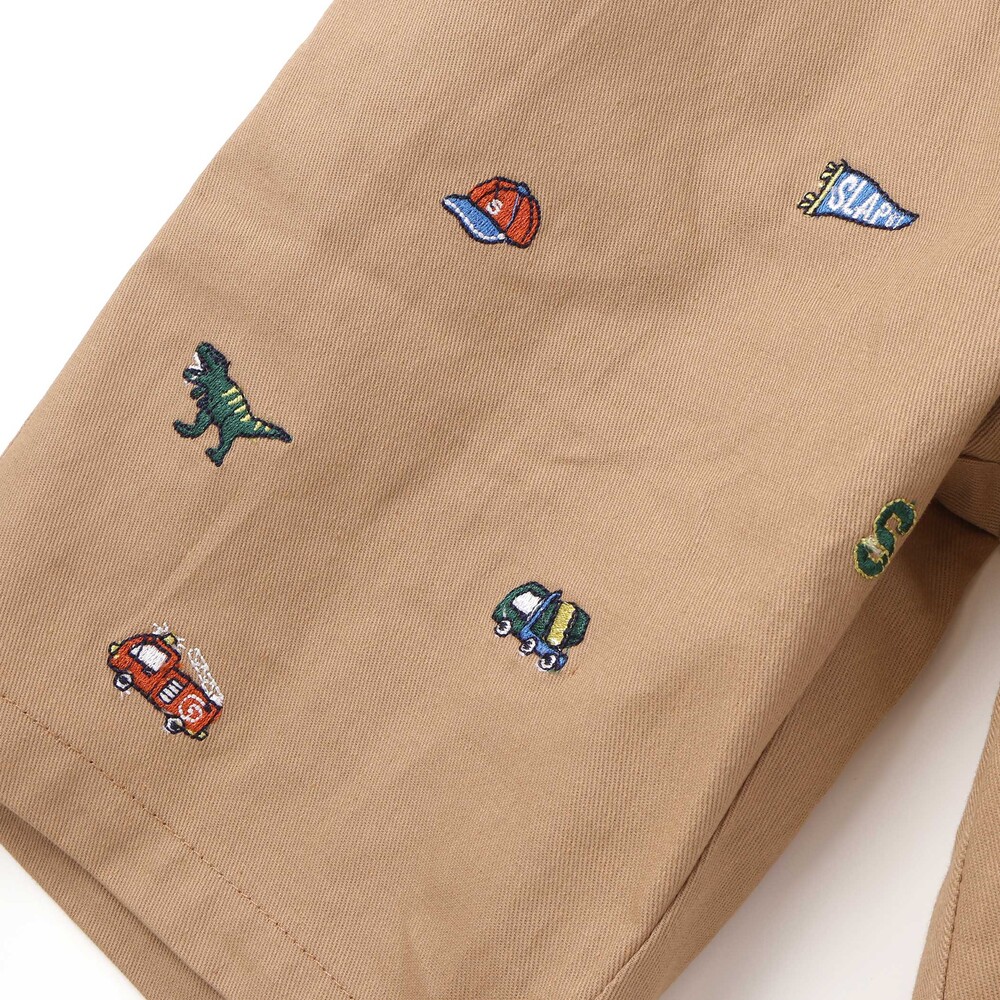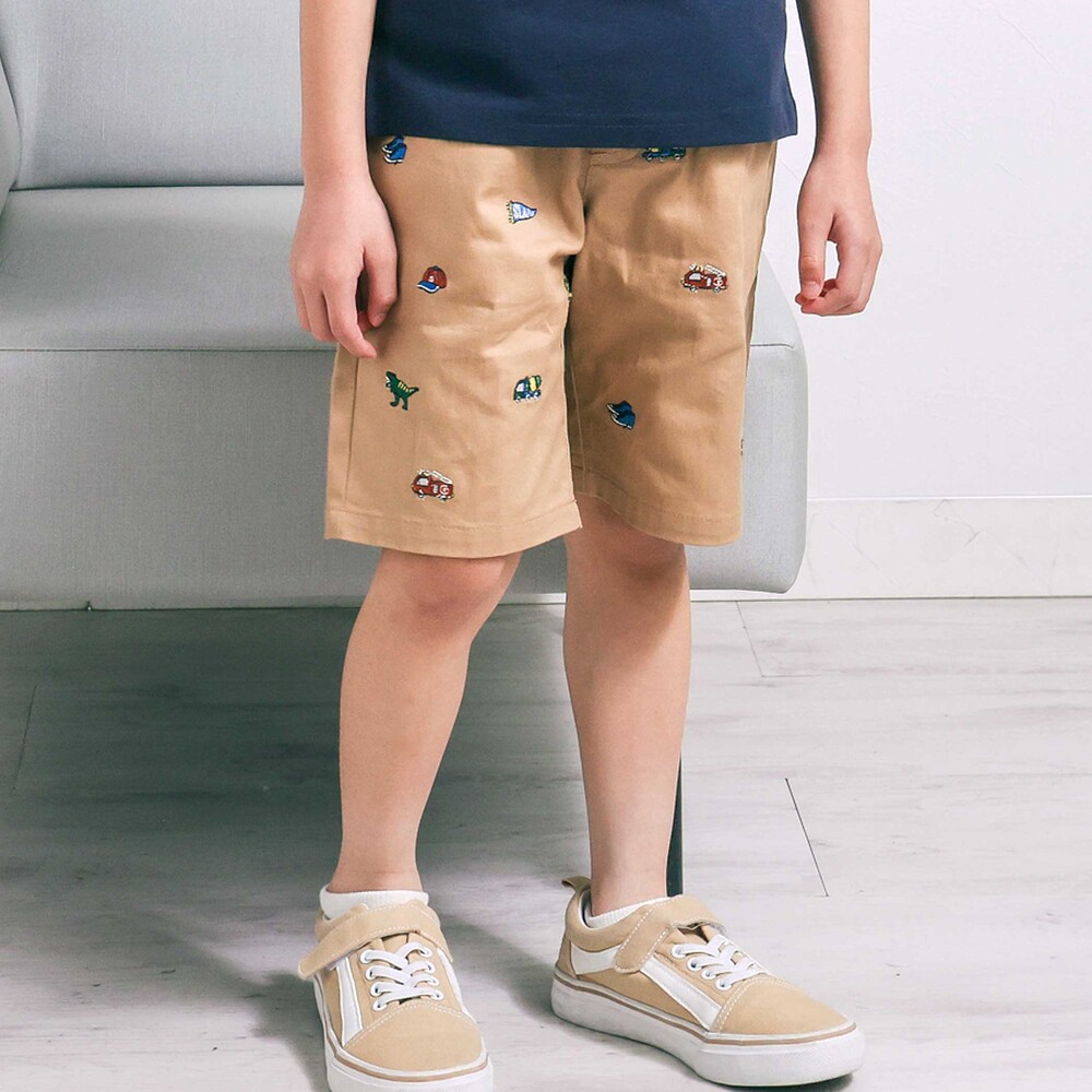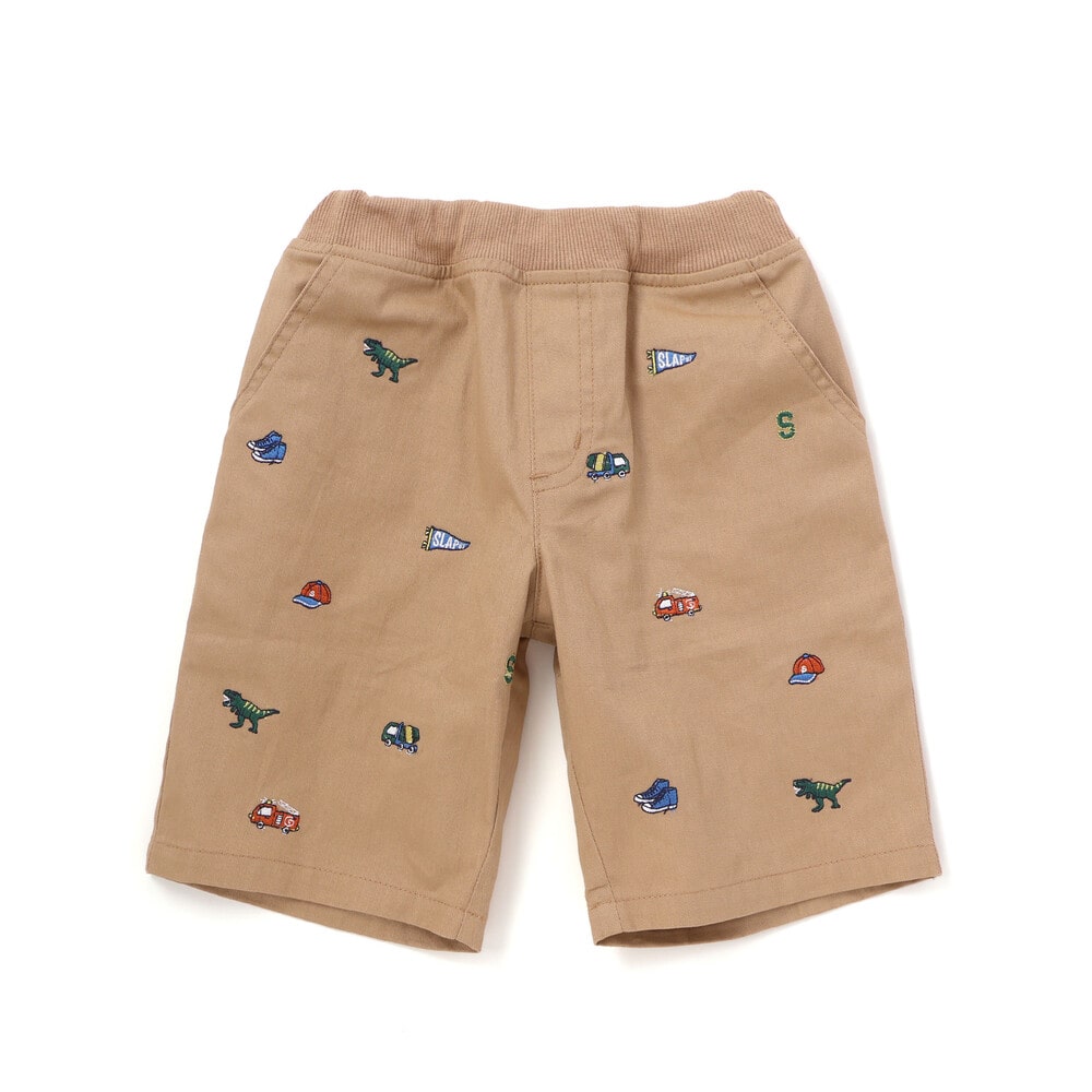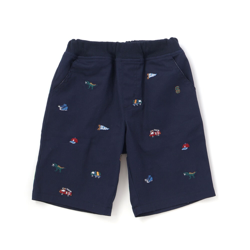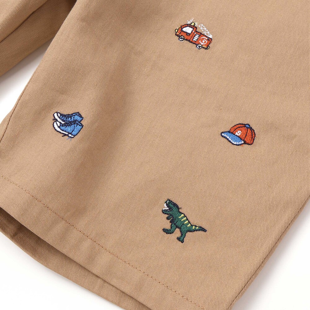 はたらくくるまや恐竜、帽子やスニーカーなど、男の子の「好き」をぎゅっと詰め込んだ刺しゅうが散りばめられたショートパンツ。
