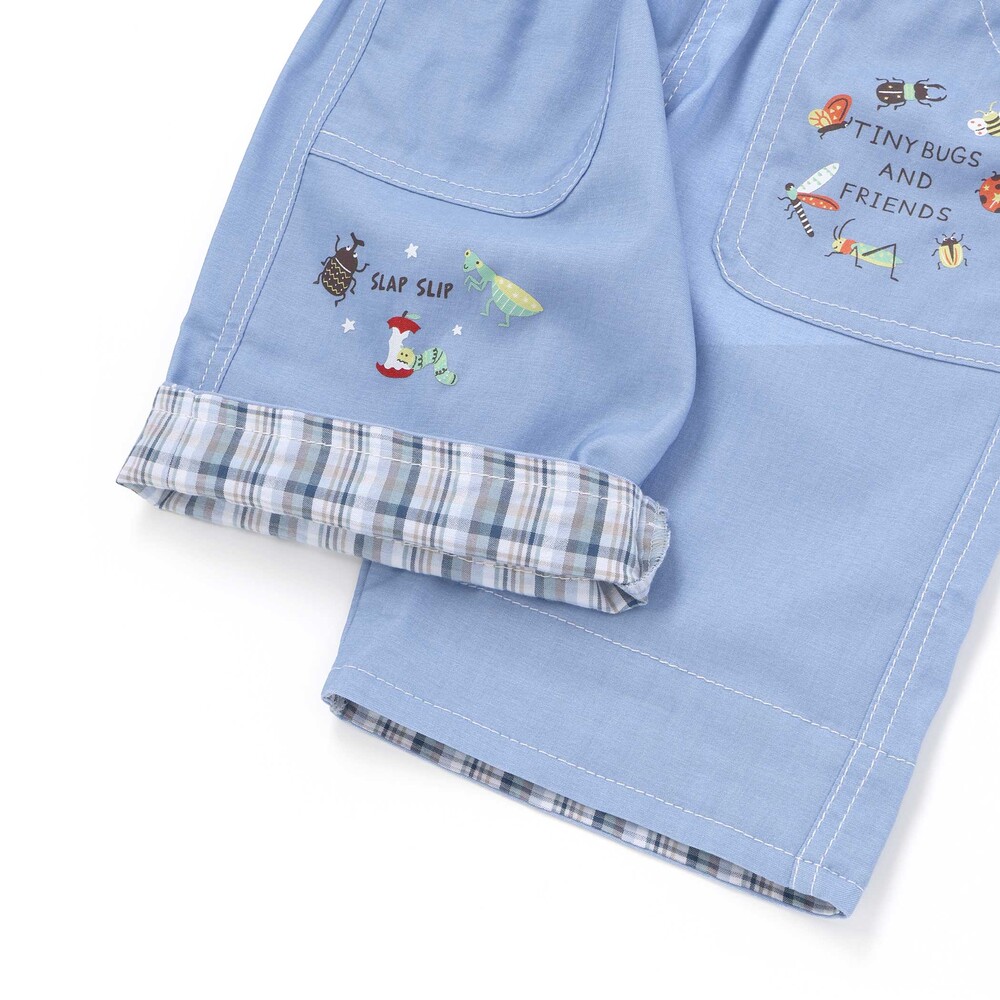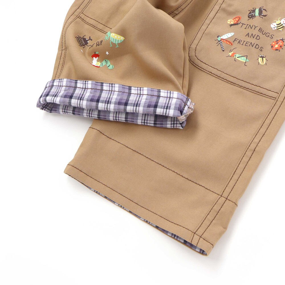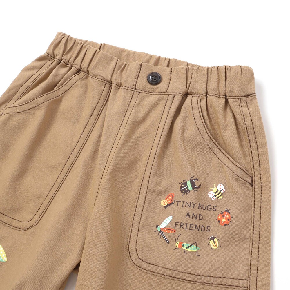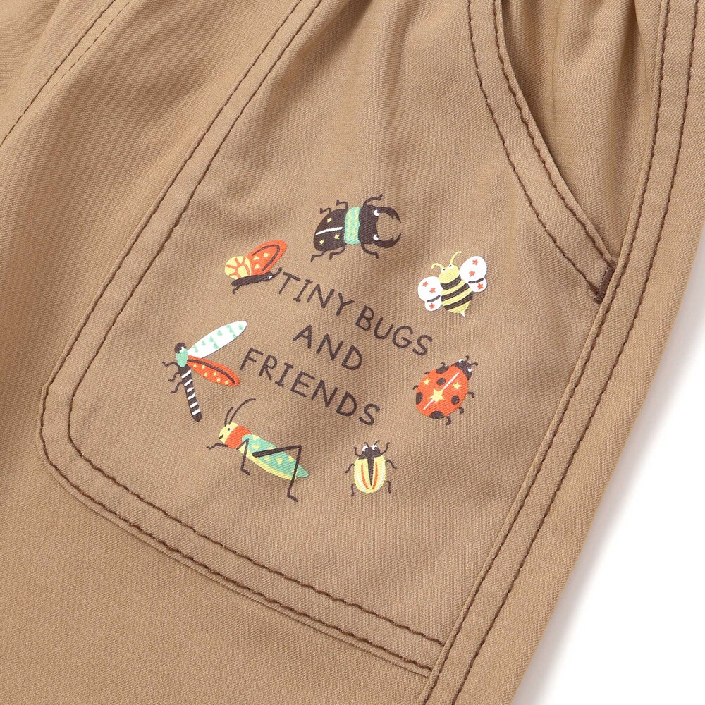 前ポケットや裾に描かれた昆虫プリントが目を惹く、男の子用5.5分丈パンツ。