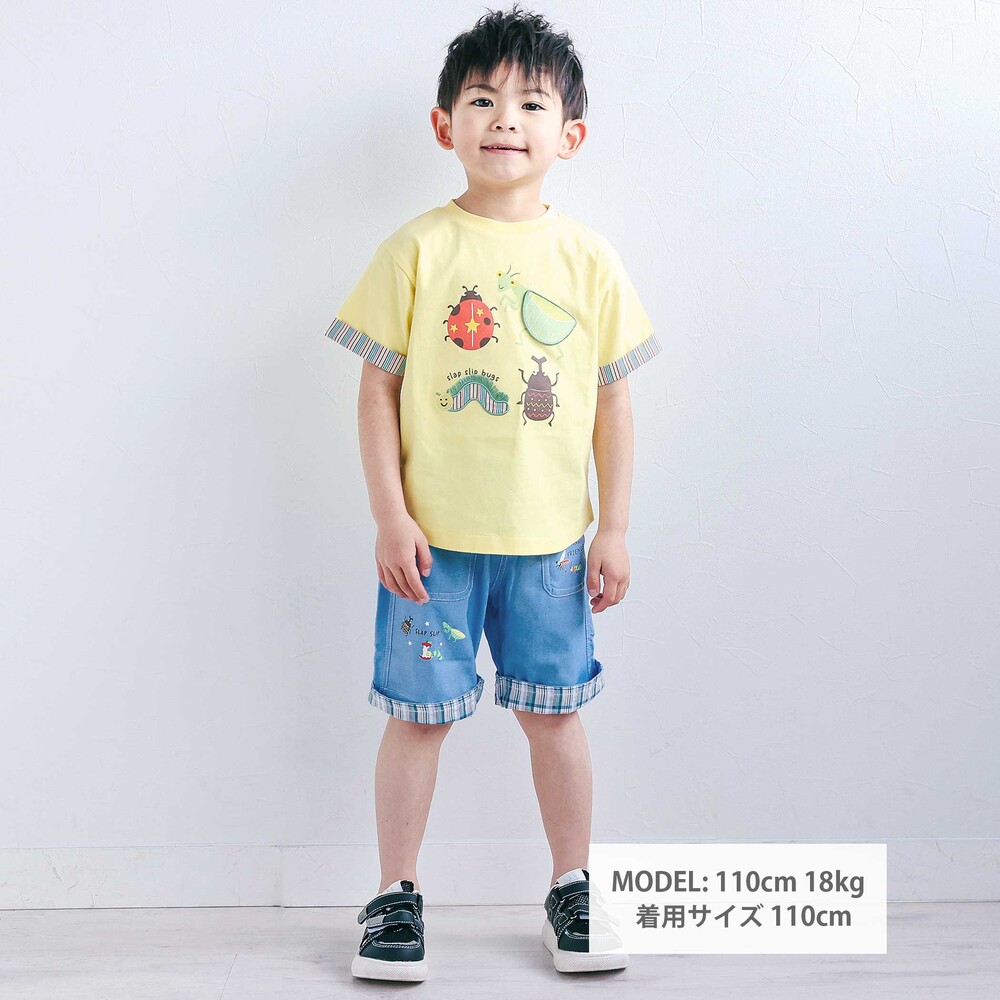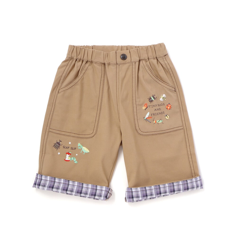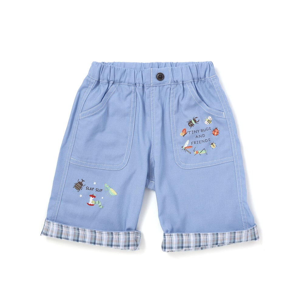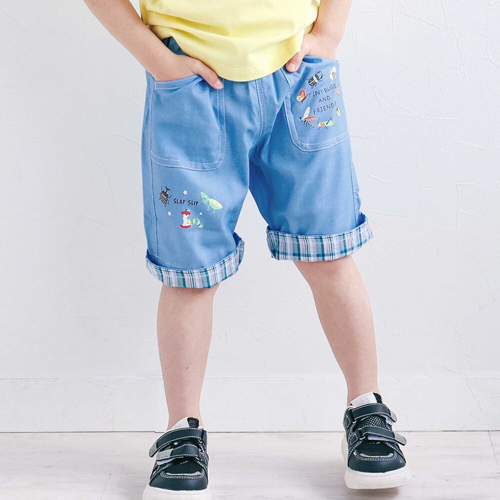 前ポケットや裾に描かれた昆虫プリントが目を惹く、男の子用5.5分丈パンツ。