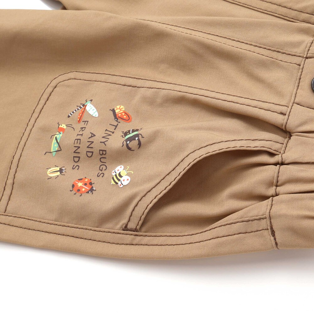 左前ポケットや右裾には、ワクワクするようないろいろな昆虫をプリントし、遊び心たっぷりのデザインに仕上げました。