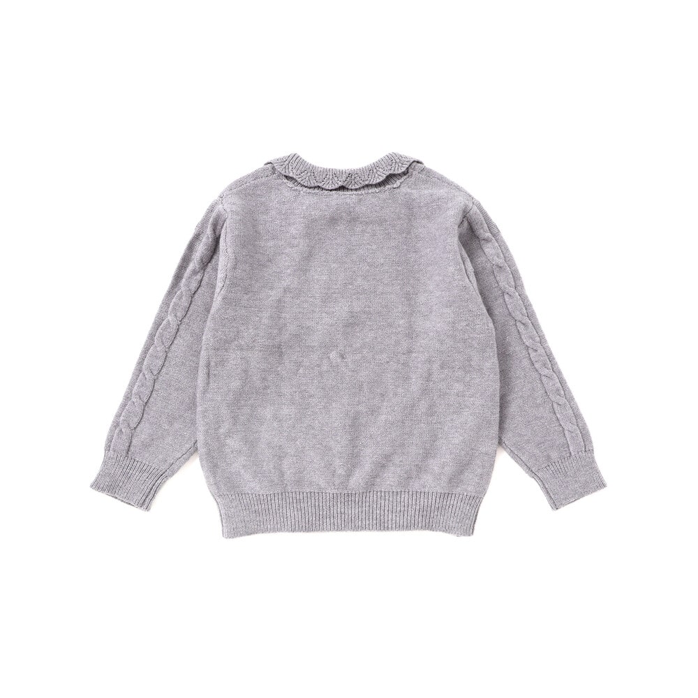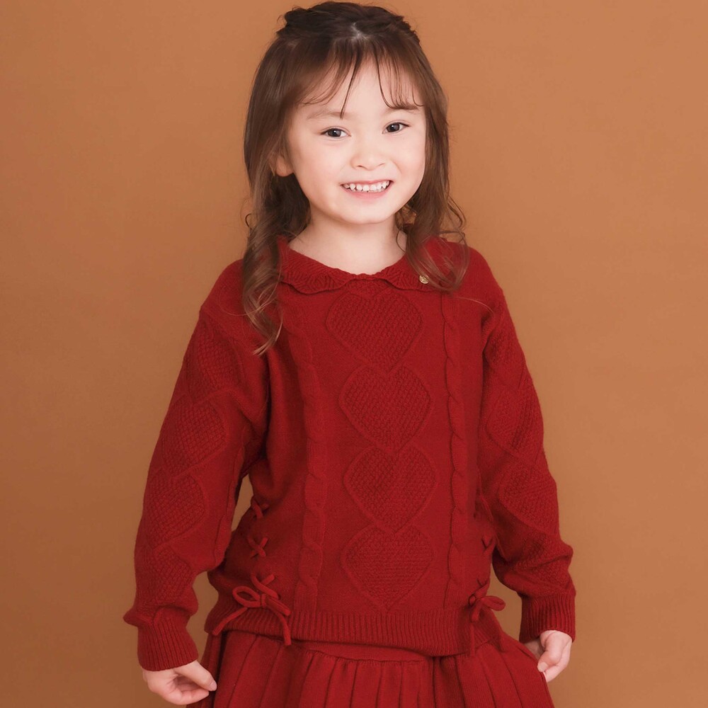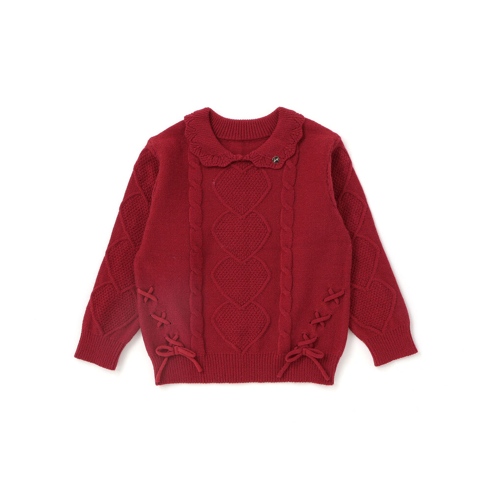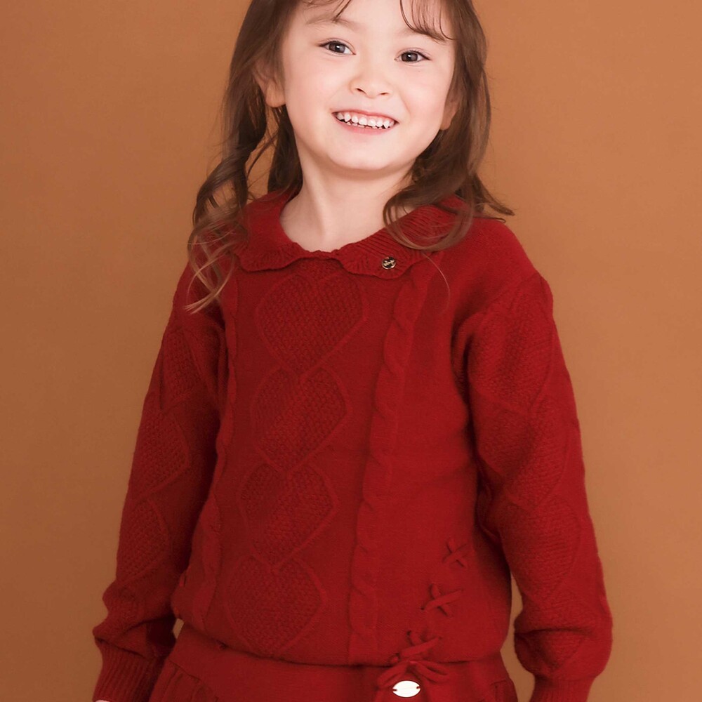 女の子らしいデザインを詰め込んだ襟付きの長袖ニットトップス。