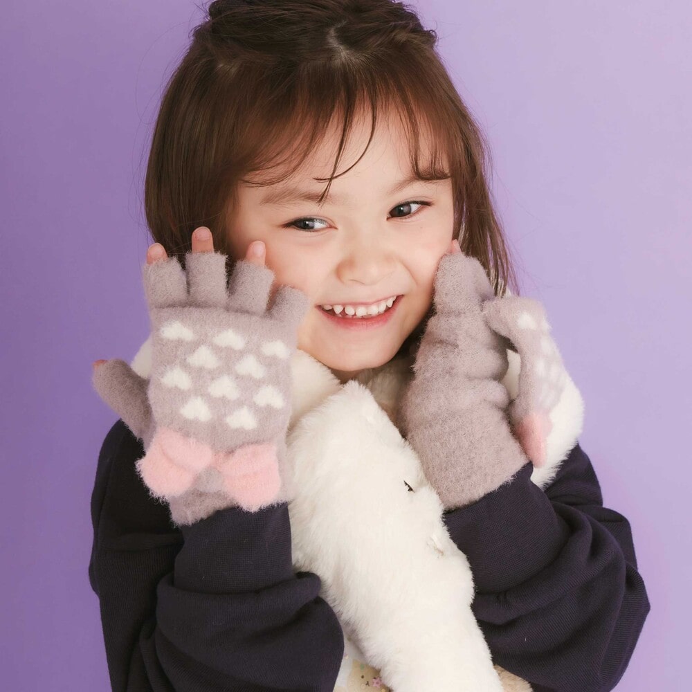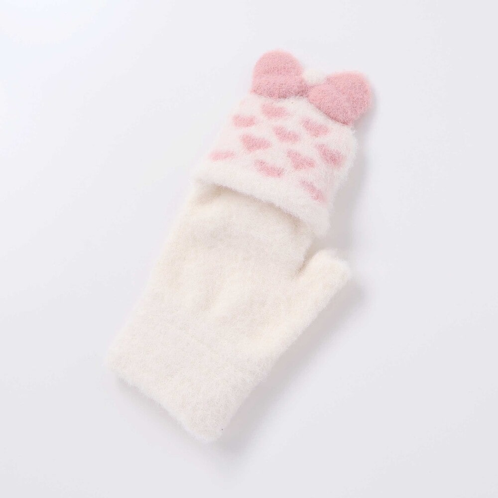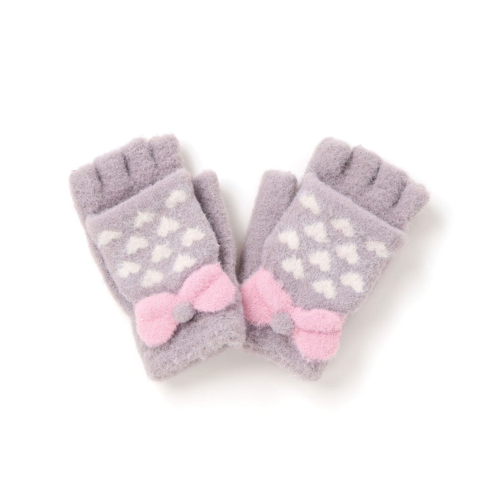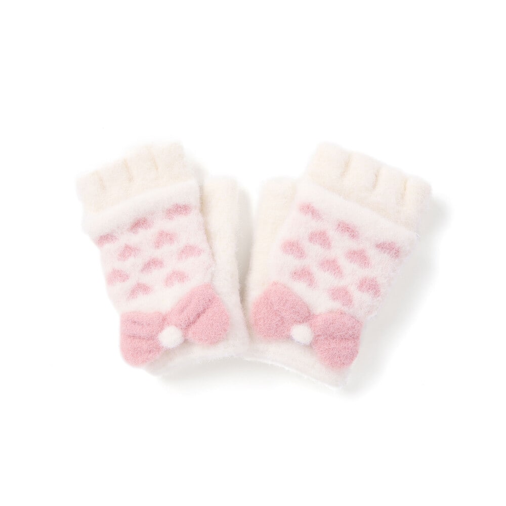 ミトン部分には可愛らしいハート柄をあしらい、先端には大きなリボンモチーフを添えて女の子らしさをプラスしました。