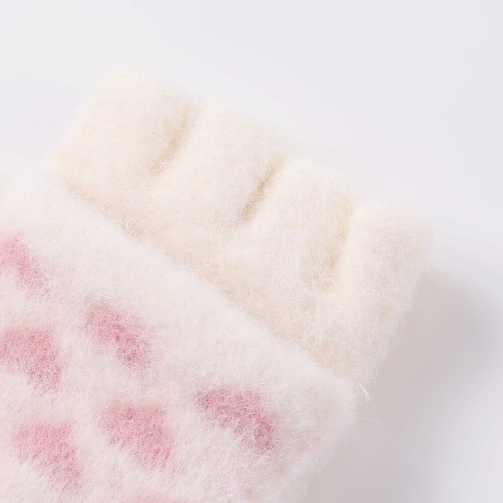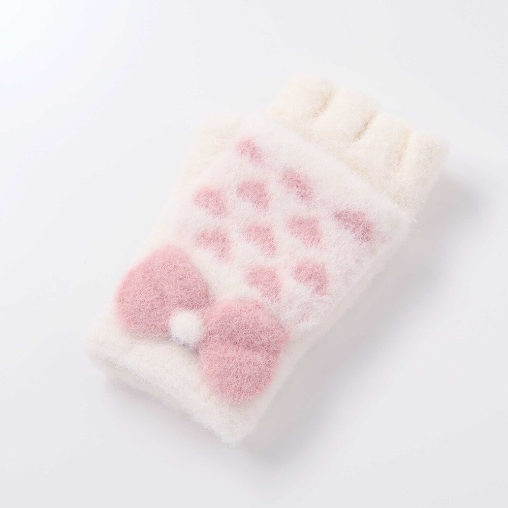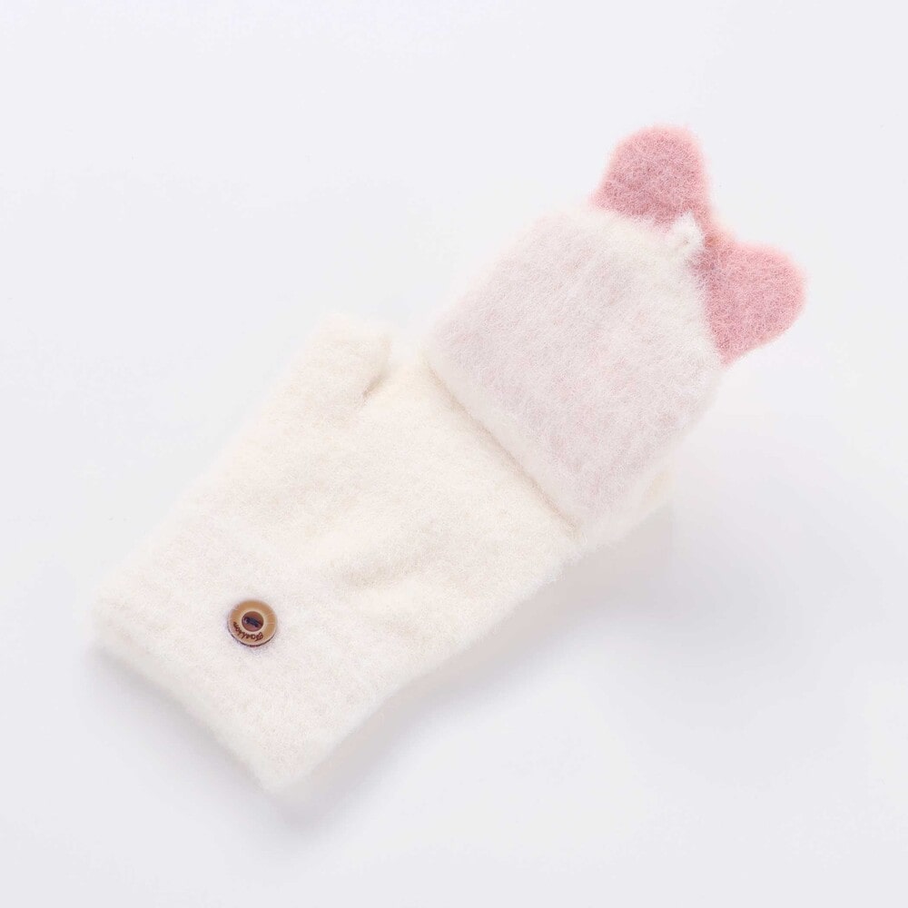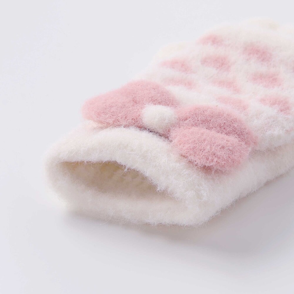 ミトン部分には可愛らしいハート柄をあしらい、先端には大きなリボンモチーフを添えて女の子らしさをプラスしました。