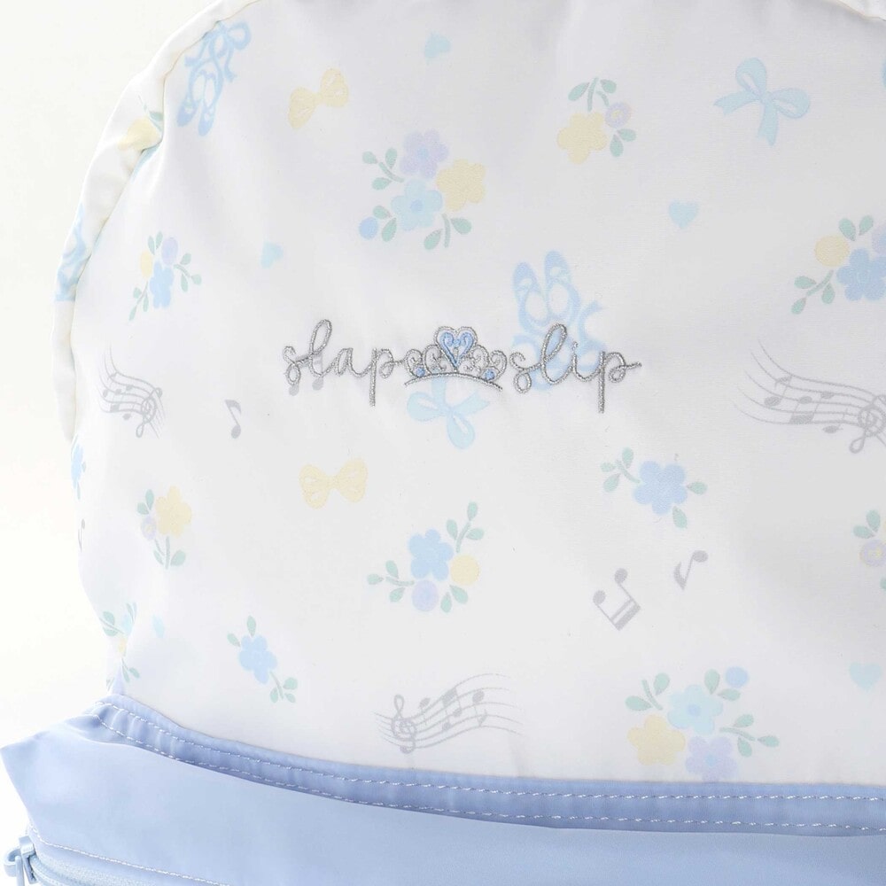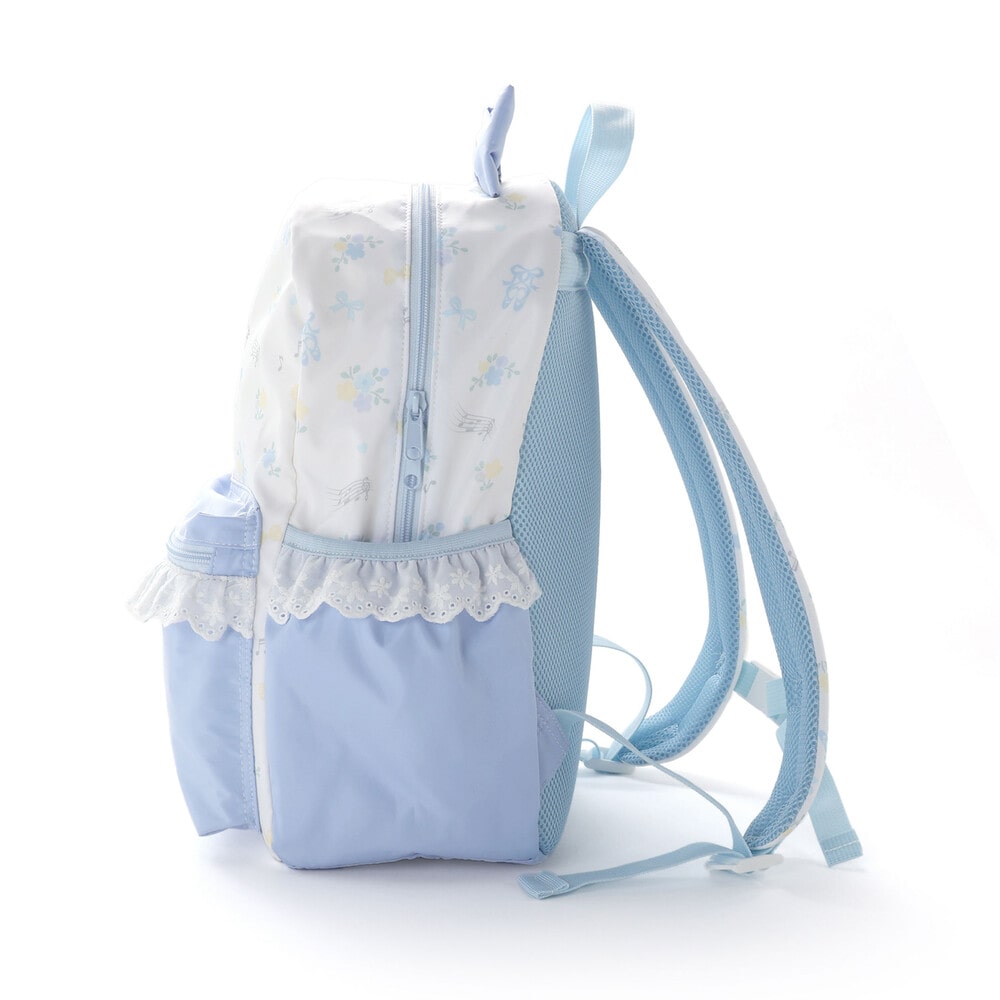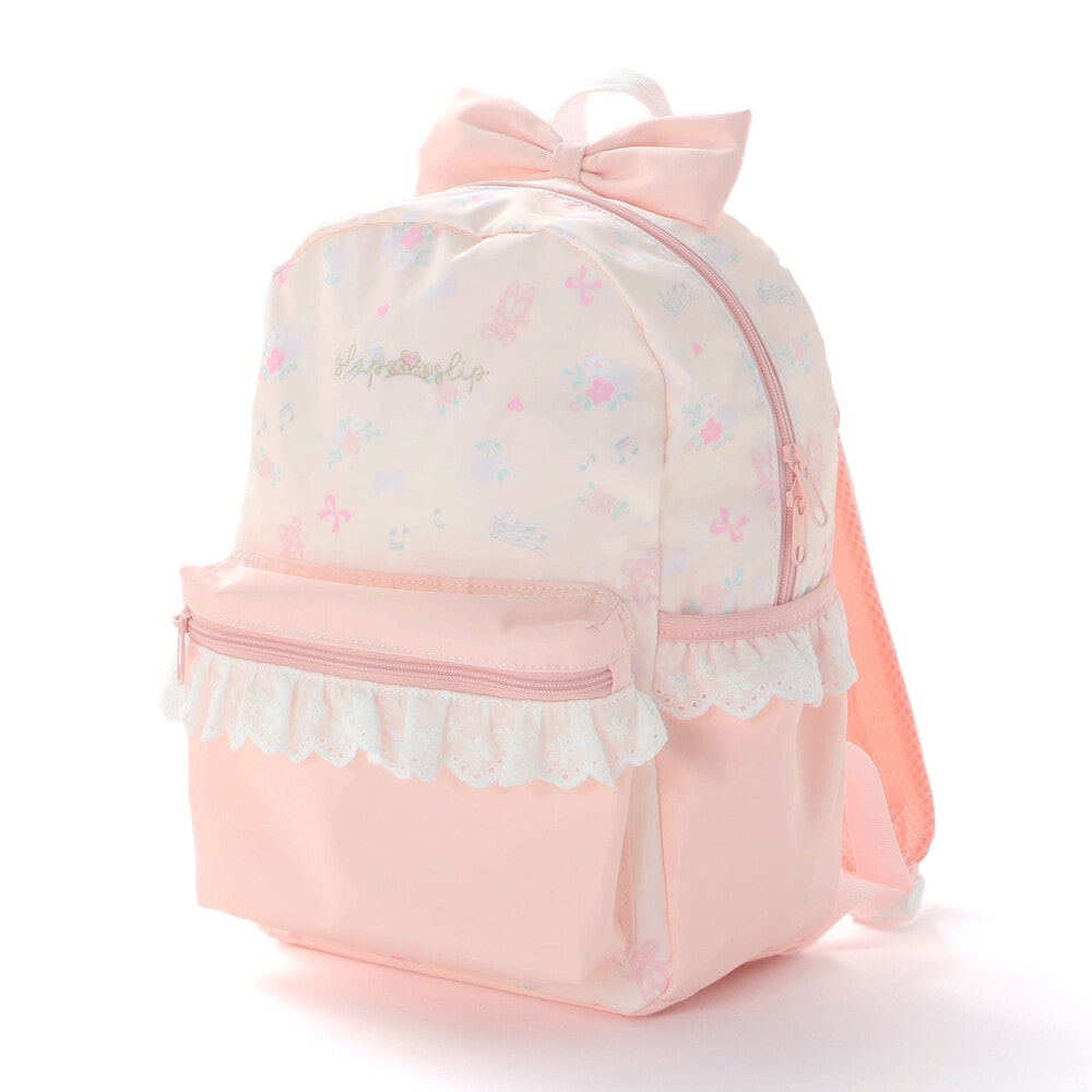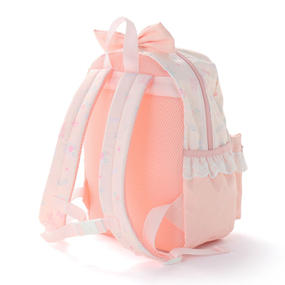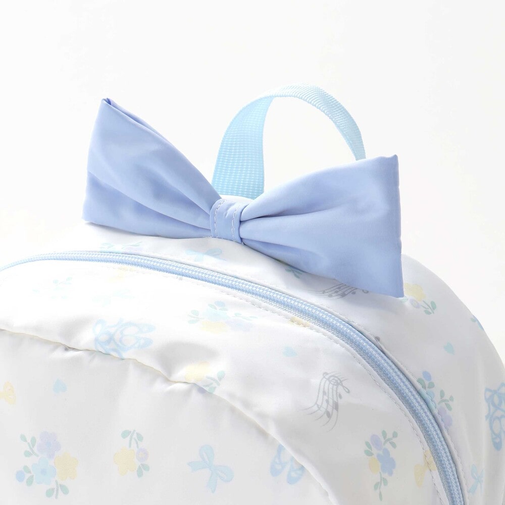 リュックの本体はリボン・バレエシューズ・お花のフェミニンな総柄プリントデザインで、ポケット部分は無地にすることで、全体のバランスも◎