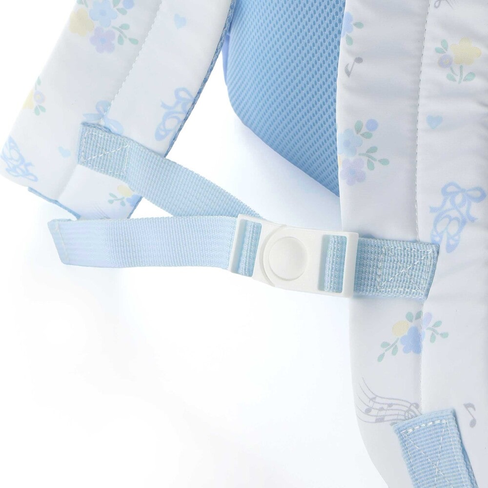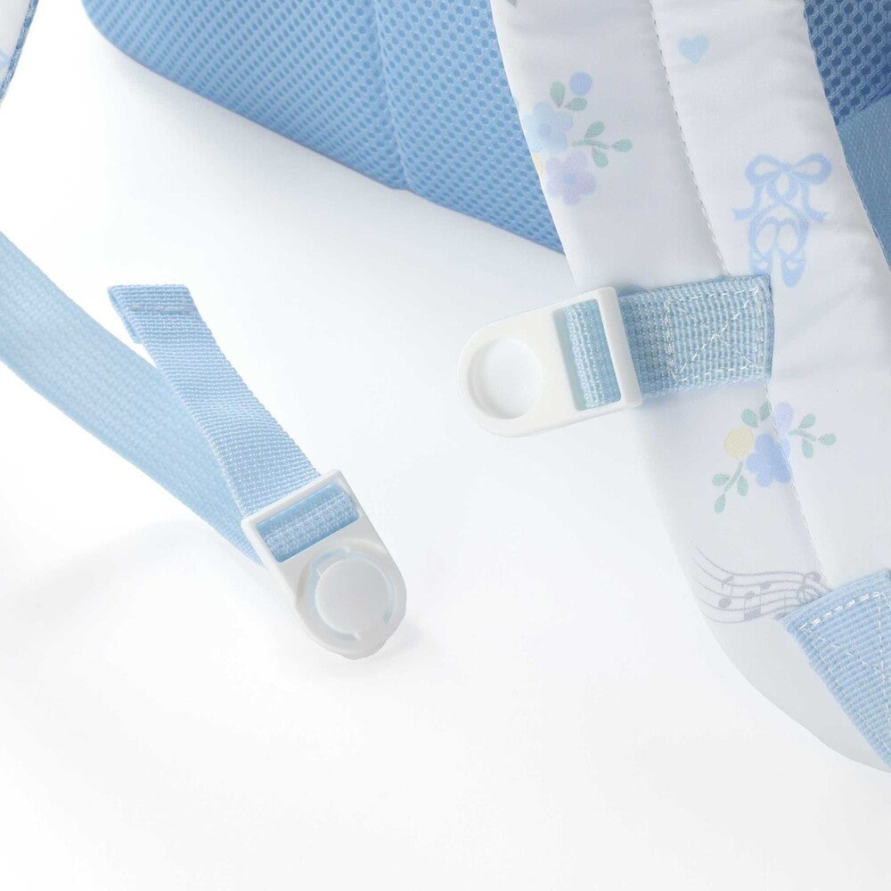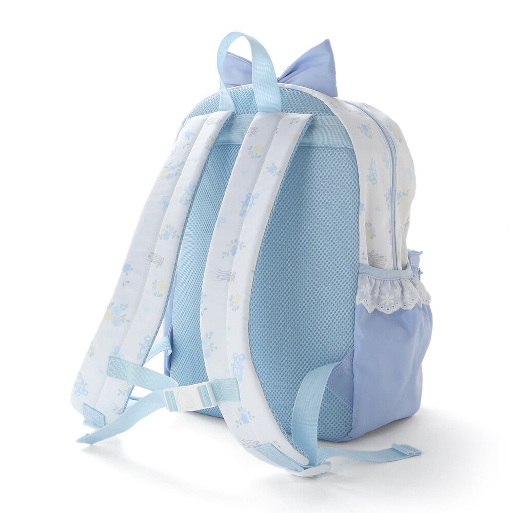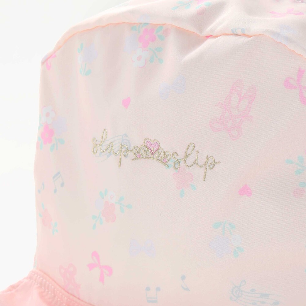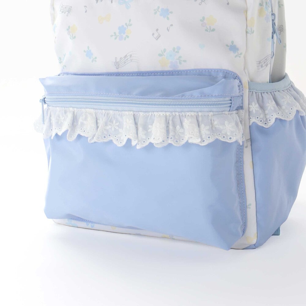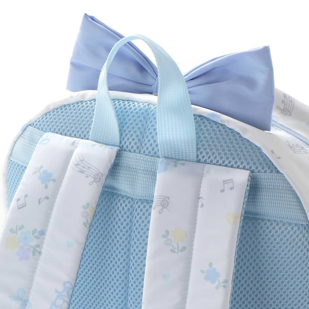 リュックの本体はリボン・バレエシューズ・お花のフェミニンな総柄プリントデザインで、ポケット部分は無地にすることで、全体のバランスも◎