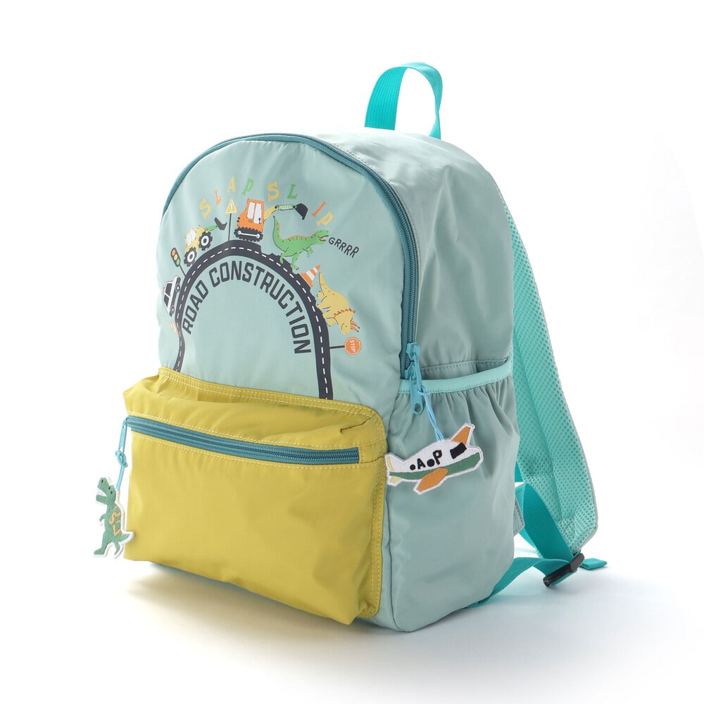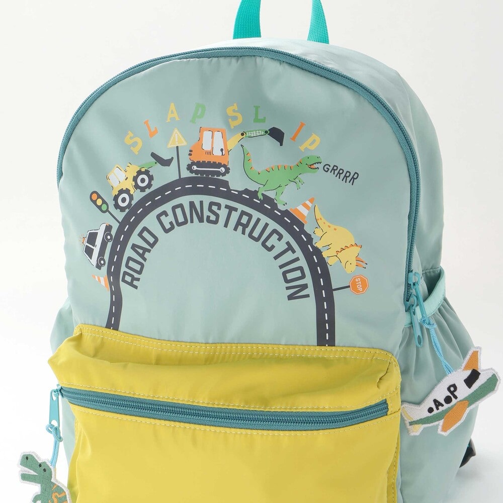 本体上部には、道路の上をはたらく車と恐竜が走っている様子を描いたイラストプリントをほどこし、思わずお出かけしたくなる楽しいデザインに仕上げました。