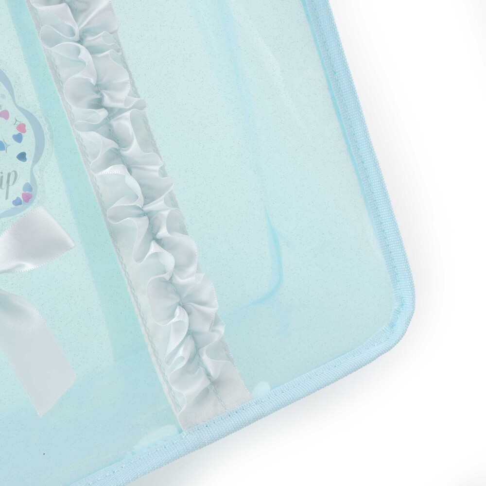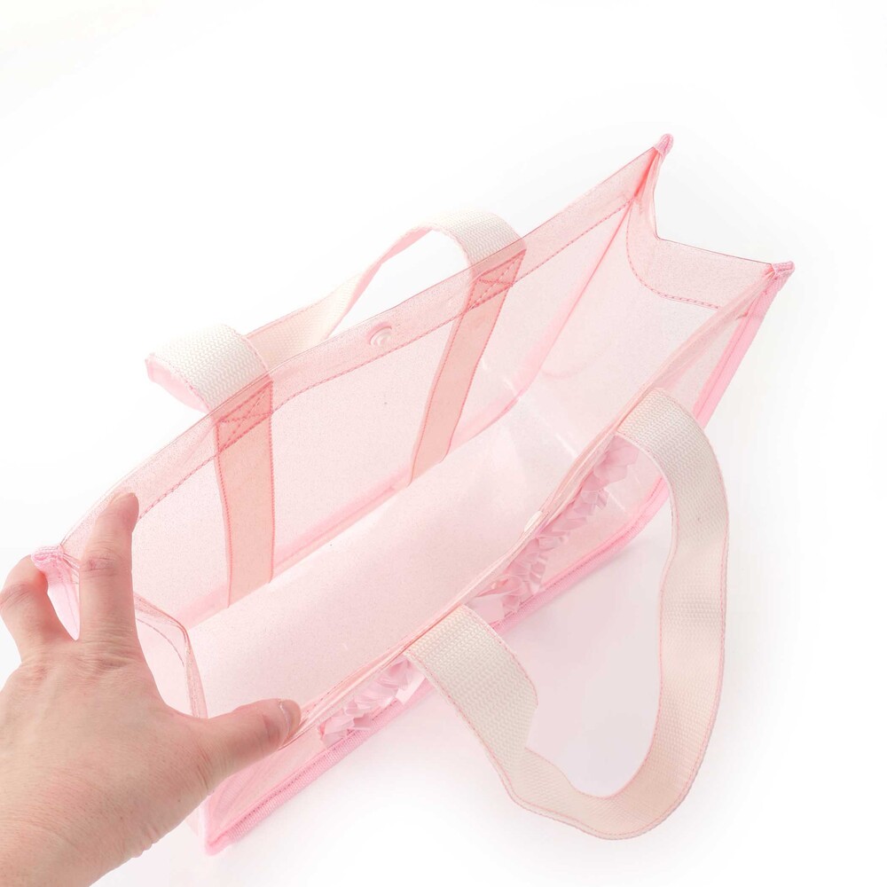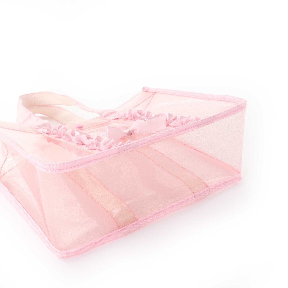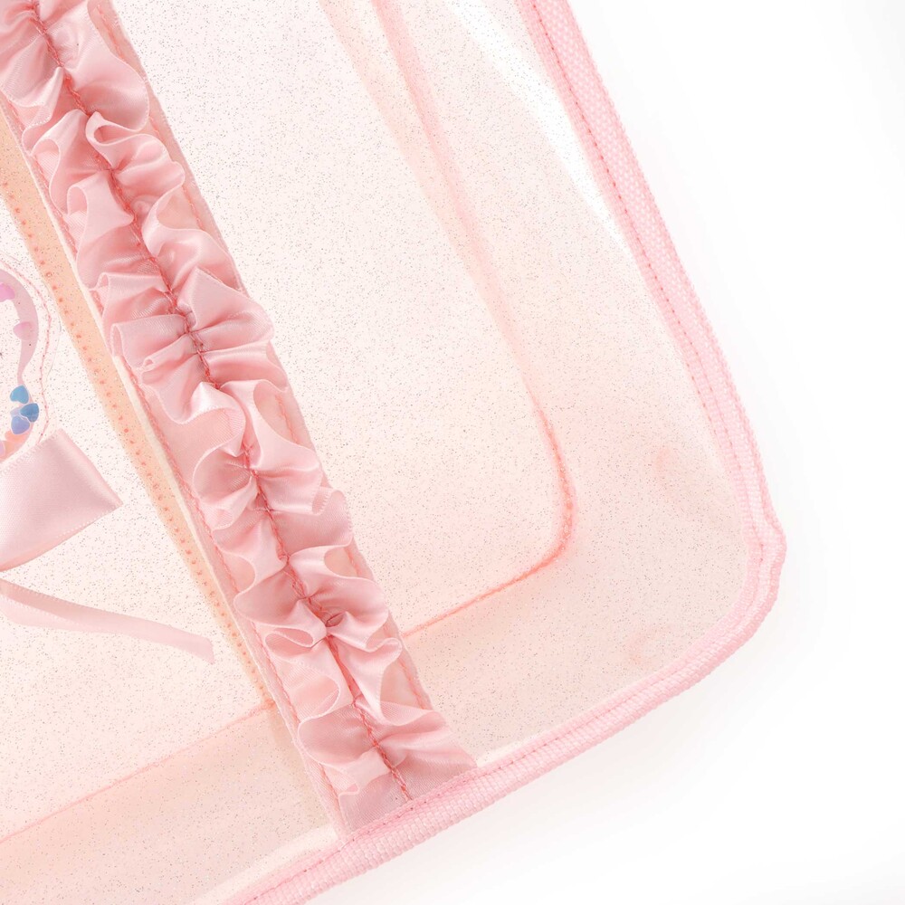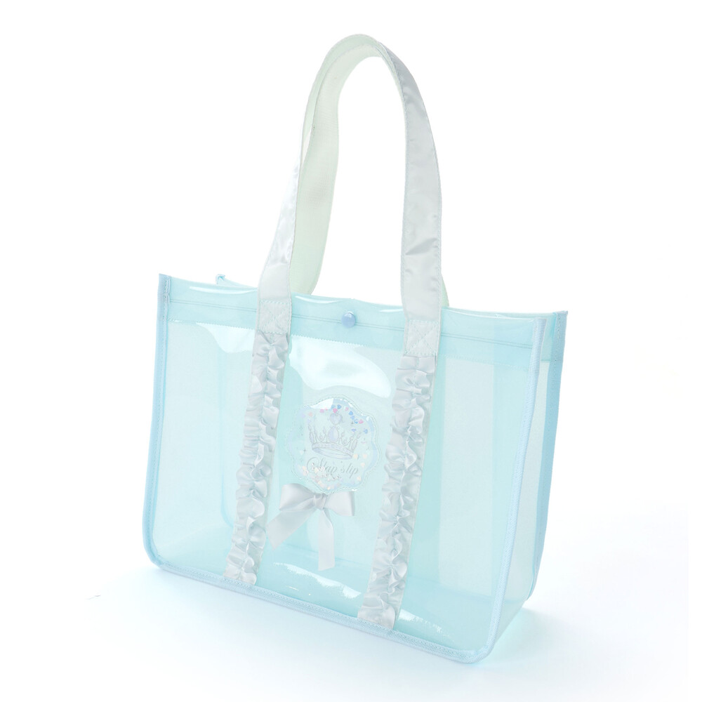 透明感のあるラメ入りのバッグには、ふんわりフリルをあしらい、持つだけで気分がときめく可愛さです。